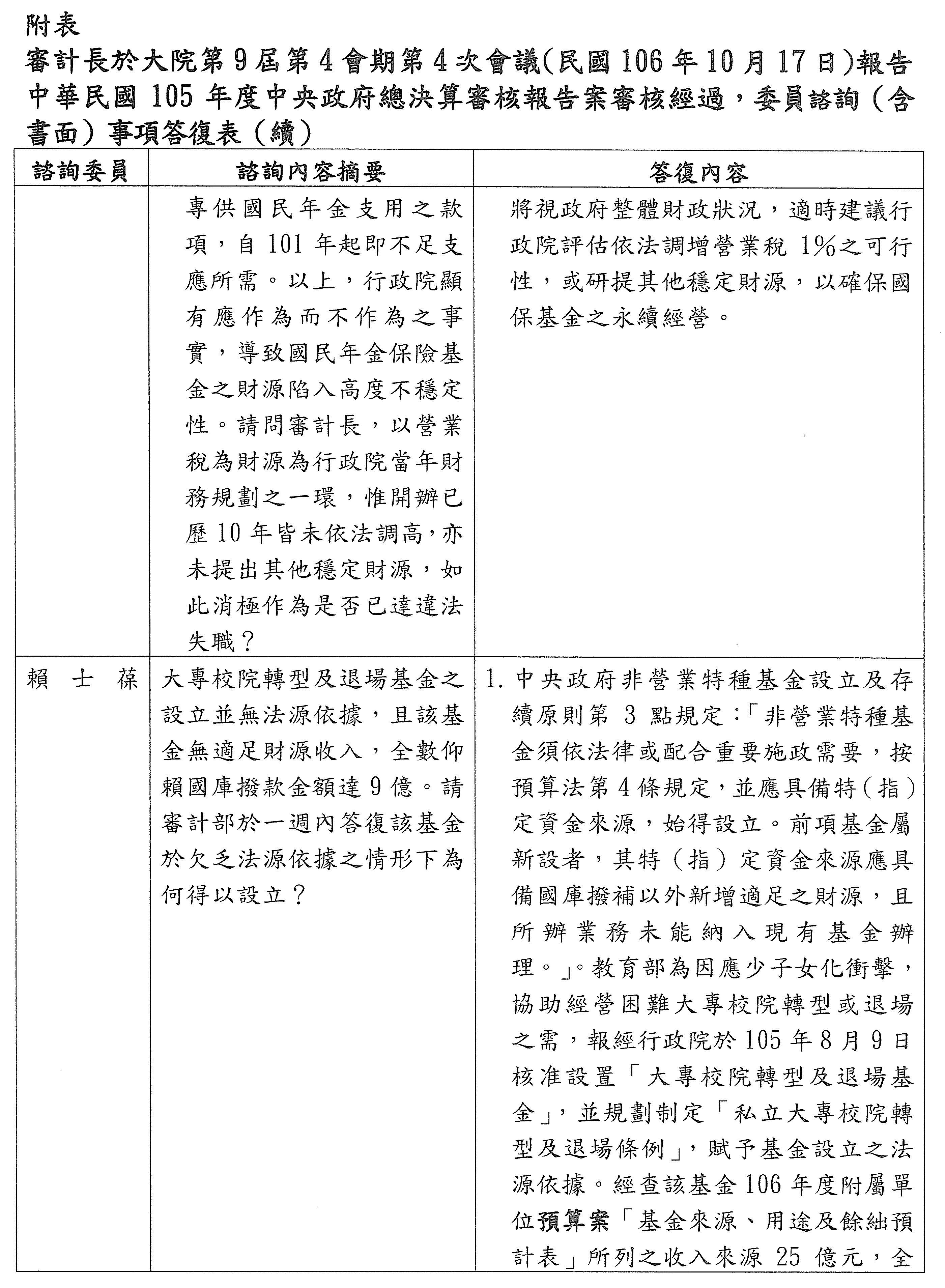(立法院函 中華民國106年11月6日台立院議字第1060703972號 施政報告質詢2號)