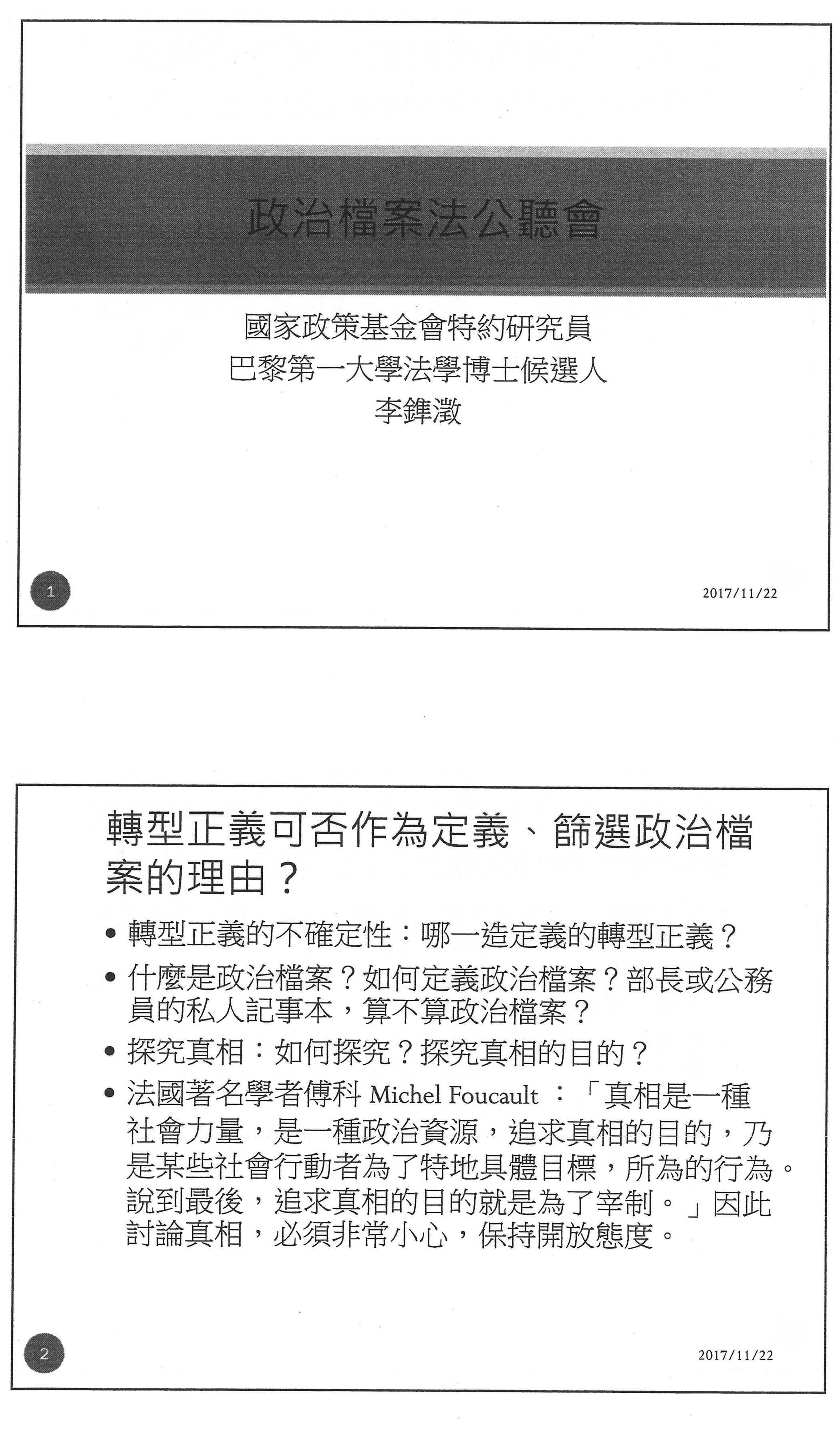 李鎨澂研究員:主席、各位委員。今天本人很榮幸有這個機會跟大家討論有關政治檔案法的個人意見,剛才幾位先進都談到了政治檔案法,從他們的發言內容大概可以知道,基本上都是以國家檔案為主,至於政黨的檔案是否要放在裡面,或是轉型正義的概念是否要貫徹到這部法案,這是我們今天討論的焦點。比如剛才有先進提到東德很多機構,這都是有關於國家,至於政黨是否算呢?我們來看一下轉型正義是否可以作為定義跟篩選政治檔案的理由?今天對於這一點有很多的爭議,我們也知道,國際上很多的規範都充滿不確定性,每個國家和每個地方的情況也都不一樣,因為每個地方利益的也都不一樣,因此,落實到每個國家的時間通通都不一樣,所以,轉型正義到底是個什麼樣的轉型正義?爭議就非常多,我們要哪一造的定義呢?轉型正義要怎麼樣定義呢?定義之後的法制是否能夠適應那個國家的制度?比如我們現在有了政黨不當取得財產處理條例,但是歷次高等法院的裁決上,黨產會已經輸了好幾個判決,那就表示這部法律當初訂定時有相當粗糙的空間,因此跟現行的法制其實有扞格的地方,以同樣的道理,我們來看這部政治檔案法就有這樣的問題。什麼是政治檔案?如何定義政治檔案?部長跟公務人員的私人記事本算不算政治檔案?這些都是問題。至於探究真相,我們要探究什麼樣的真相?法國著名學者Foucault就曾說,真相是一種社會力量,是一種政治資源,說到最後,追求真相的目的是為了宰制。當然,對於這句話我們也不能就這樣切開來斷句取義,但是他是一個感嘆,他在探討真相時就有這麼一個感嘆,所以我們說到討論真相必須要非常小心,要保持開放的態度,因為什麼才是真相?它永遠會隨著新的史料出現、新的環境出現,而有不同的變更。