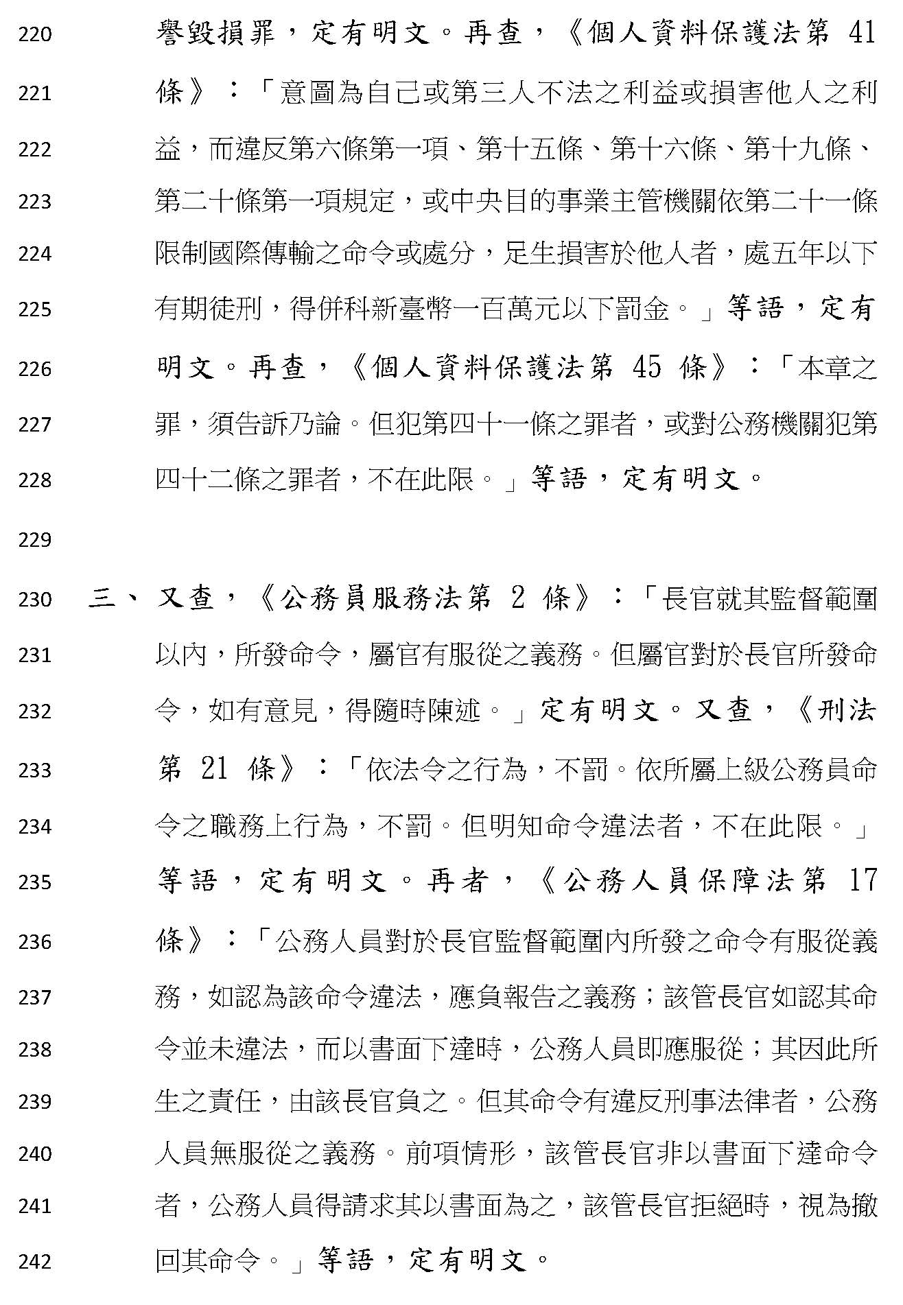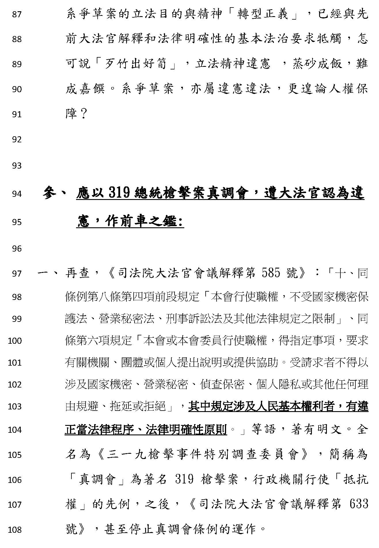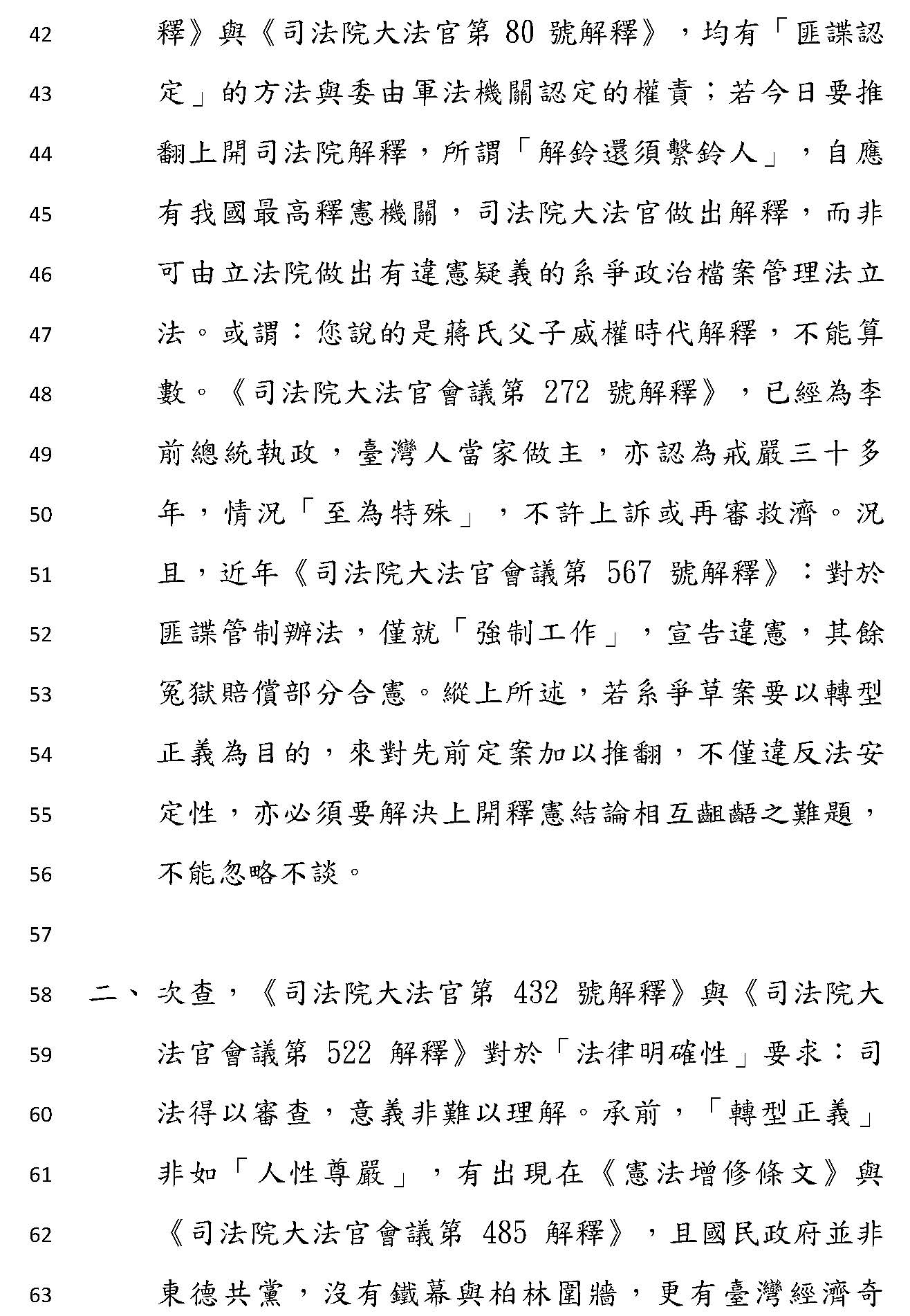 最後,關於草案我有五點意見,其中一點是時期下限最好是以1992年5月16日刑法第一百條修正通過之時為準。限於時間,其他各點請各位參考。謝謝!