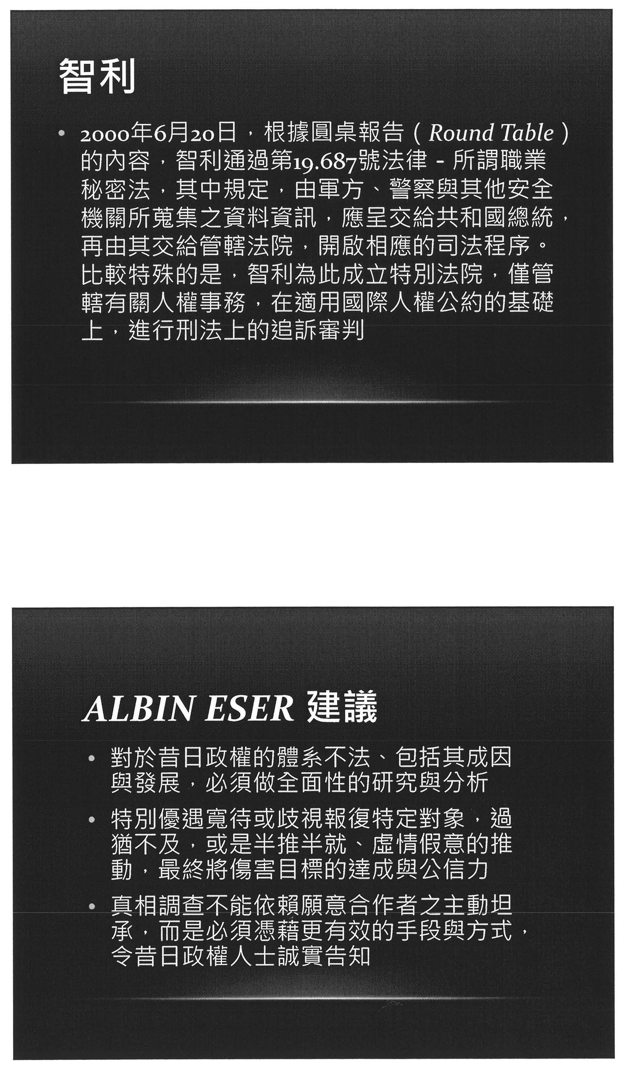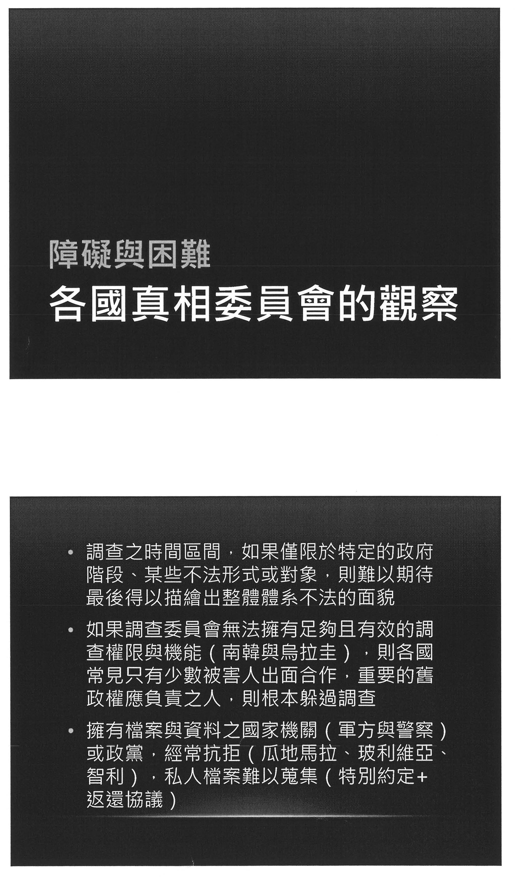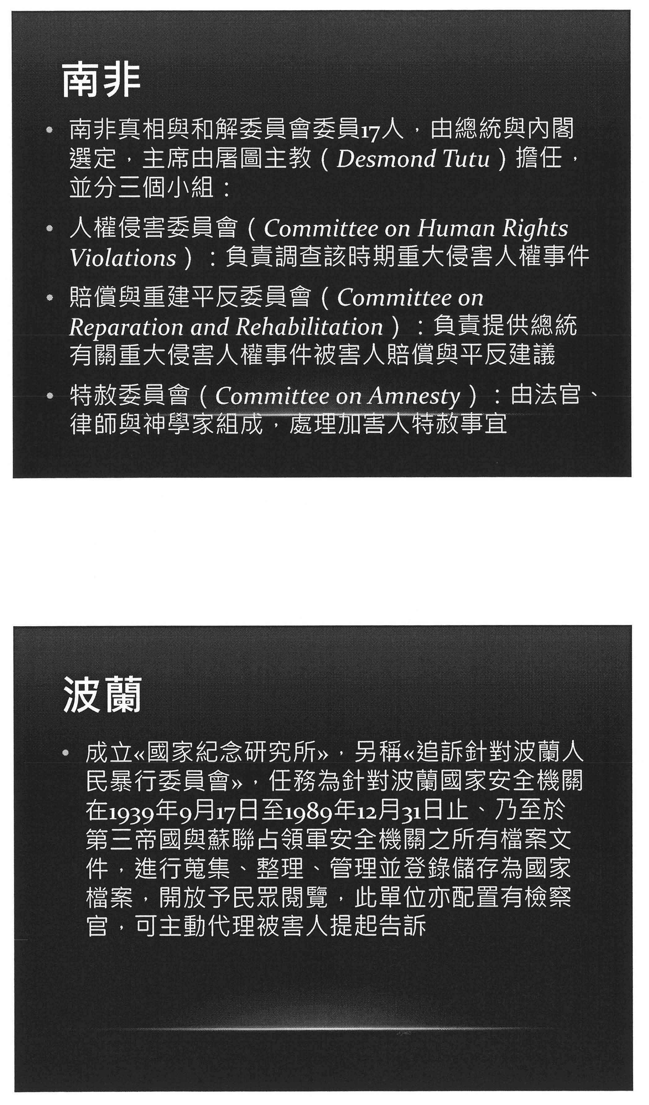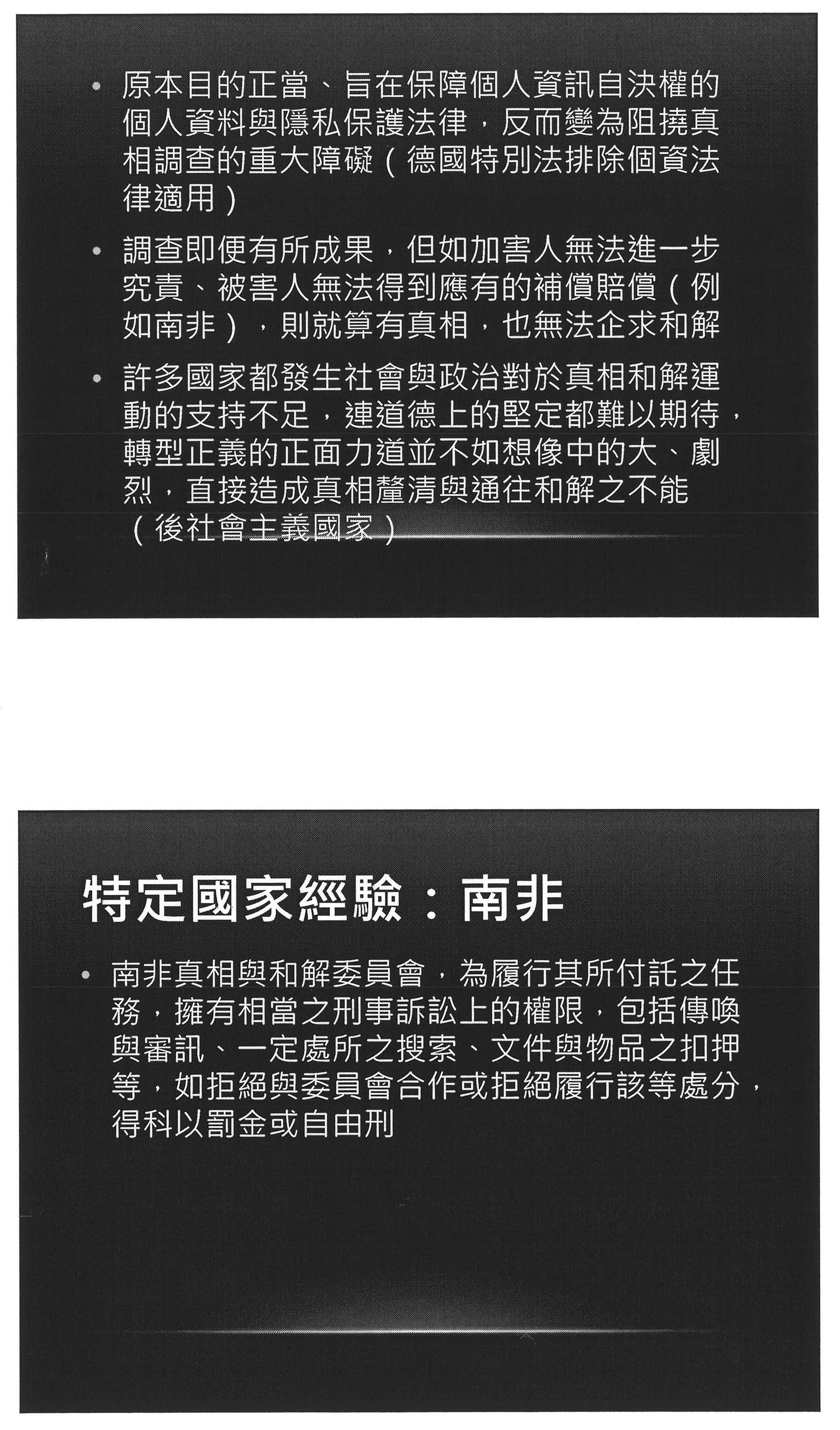接下來的幾分鐘,我想跟大家談談幾個國家的經驗,這些大概都跟我們今天的議題有關,我們可以記取其他國家成功的經驗,或是大部分很多碰到障礙的一些歷史教訓。例如像南非,南非的真相與和解委員會為了履行任務,甚至擁有刑事訴訟權限,包括傳喚及審訊、搜索權、文件物品的扣押權;如果拒絕與該委員會合作或拒絕履行處分的話,可以課以刑事法罰金及自由刑。在我們目前看到的兩個草案裡面,對此有一些稍稍的著墨,我們其實可以參考南非的例子,做比較多的發揮。但是南非的法制如此,實際上的實踐並沒有像法制這樣做,這也是南非被認為不是那麼成功很重要的原因。
