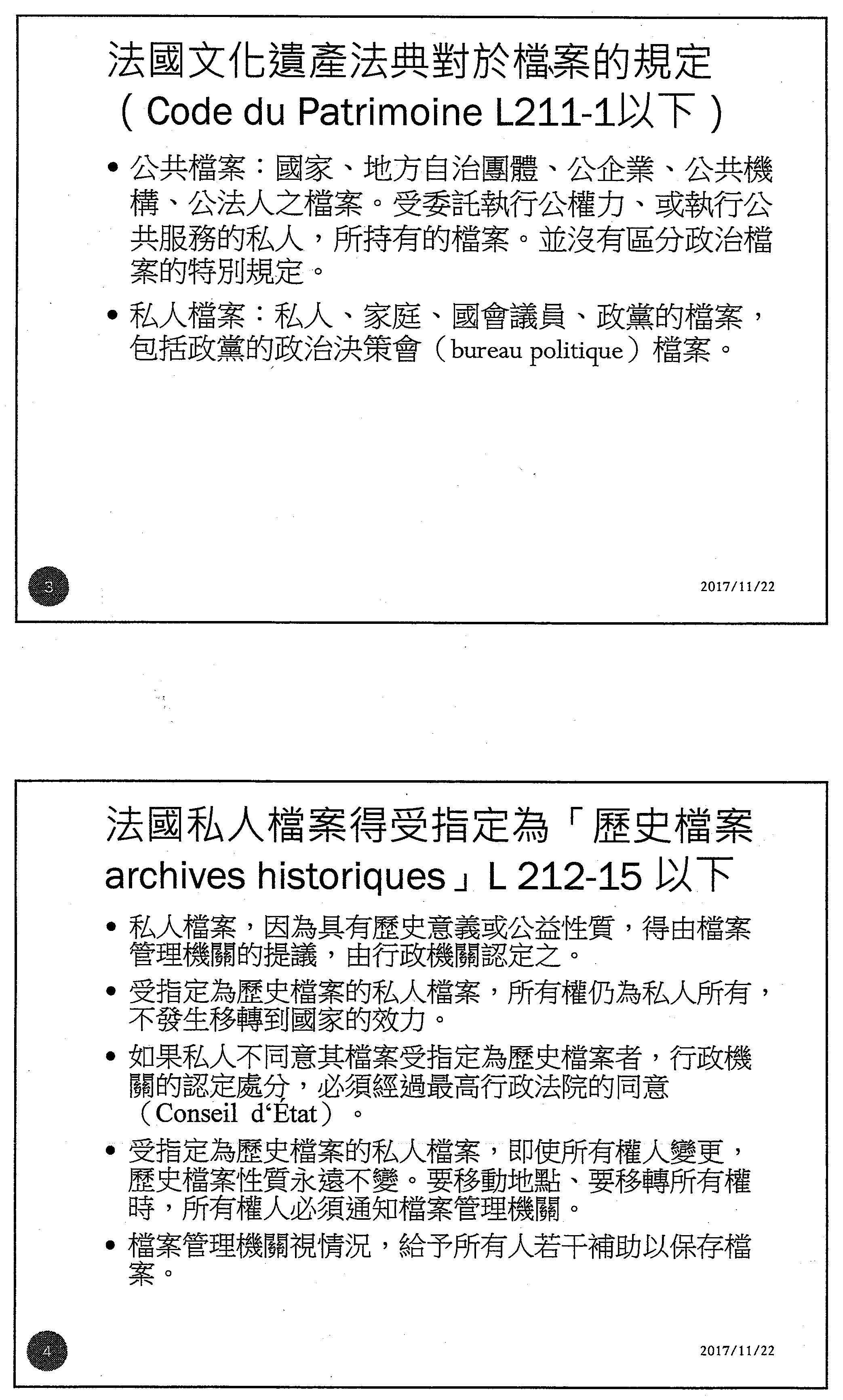 我們來看看法國對於檔案是如何規定,法國對檔案只分成兩種,就是公共檔案與私人檔案,並沒有特別區分政治檔案。公共檔案就是國家、地方自治團體等受委託執行公權力的檔案。我們剛才說了,如何去區分政治檔案是非常困難的,因此他們索性不區分,就用公共檔案與私人檔案來說。私人檔案是包括私人、家庭的檔案;很有意思的是國會議員的檔案也算是私人檔案,並不算是國家公權力的檔案,所以由國會議員自己保管;而政黨的檔案也是私人檔案,包括政黨的政治決策會(Bureau politique),就是相對於政治局,或是我們說的中常會,這些決議檔案也算是私人檔案。為什麼會這樣區分?首先,它是私人的團體,私人團體當然受有私人財產保障的不可侵性,而且也考慮到政黨要保存這個檔案,他經營政治的目的才能連貫,嗣後如果有涉訟的話,這些檔案也都方便由他取用。可是私人檔案還是可受指定為歷史檔案,私人檔案因為具有歷史意義或公益性質,可以由檔案管理機關指定為歷史檔案,這個指定可以由行政機關認定,可是如果私人不同意這個檔案受指定為歷史檔案,行政機關的認定處分必須經過最高行政法院的同意。也就是說這個指定是非常嚴謹的,並不是行政機關單方面就可以隨意認定,必須最高行政法院介入來指定。受指定為歷史檔案的私人檔案,即使所有權人變更,歷史檔案性質永遠不變。如果要移動保管地點、移轉所有權人等等,所有權人必須通知檔案管理機關,檔案管理機關對於私人所保有的歷史檔案要移轉到哪裡去及保管條件的變更,是統統都要知道的。檔案管理機關要視情況給予所有人若干補助,以良好保存檔案,這一點其實我們都可以理解。