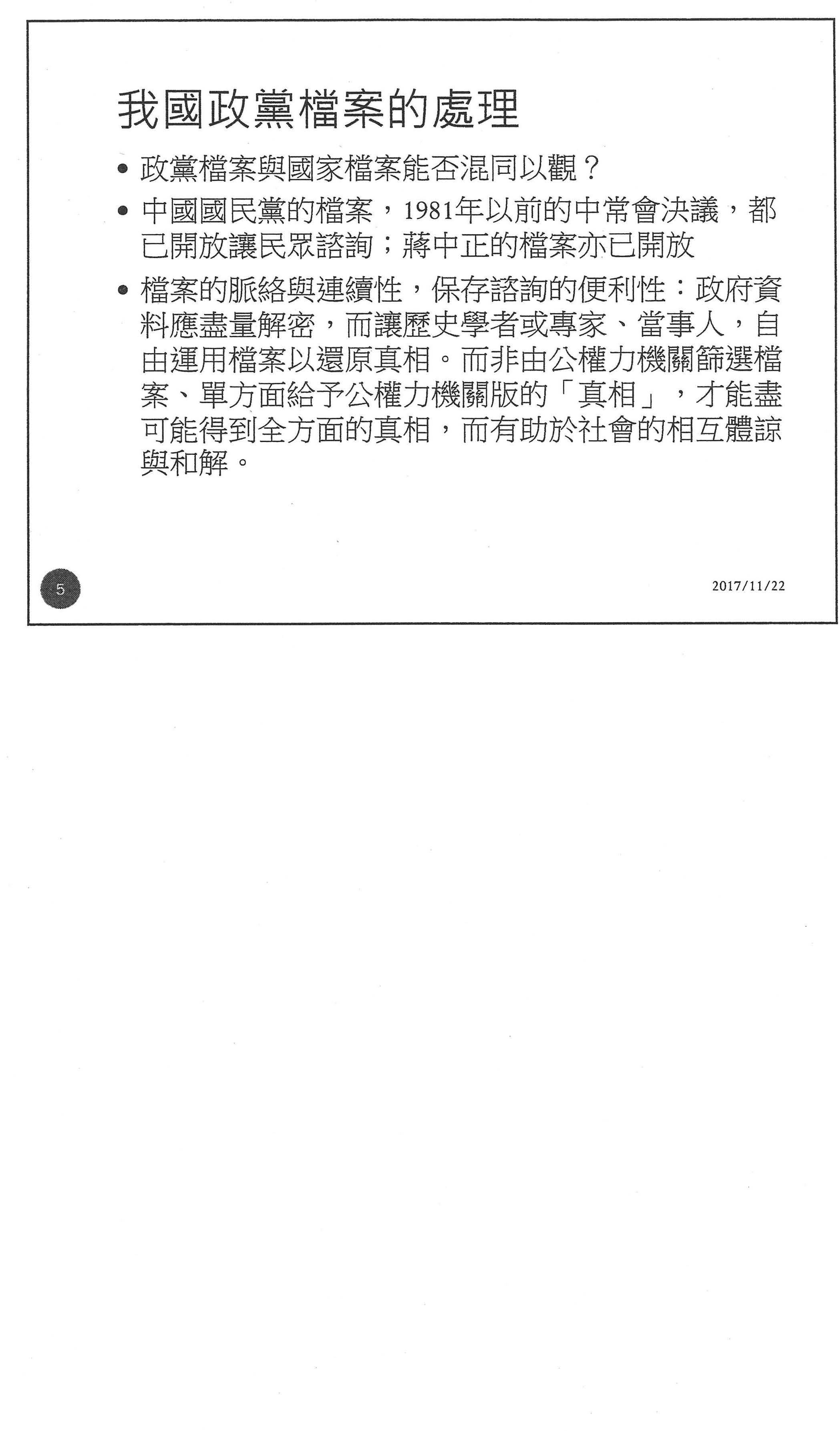 題綱四提到黨國統治時期以黨領政,中國國民黨及其附隨機構存有非常多的檔案,就當時的黨國體制來說,這些都是國家檔案,不能因為這些組織或單位現在變成民間團體,過去非民間時期的檔案就變成民間團體所有,所以我也建議針對這類檔案特別立法處理。