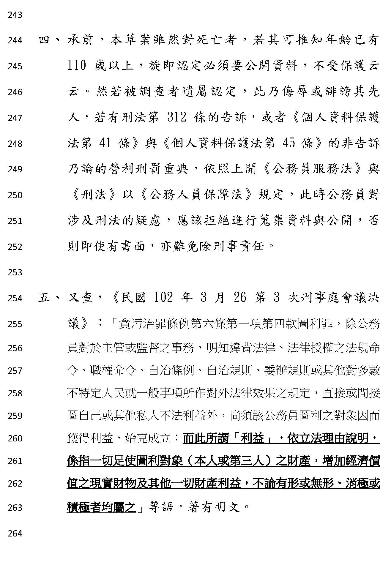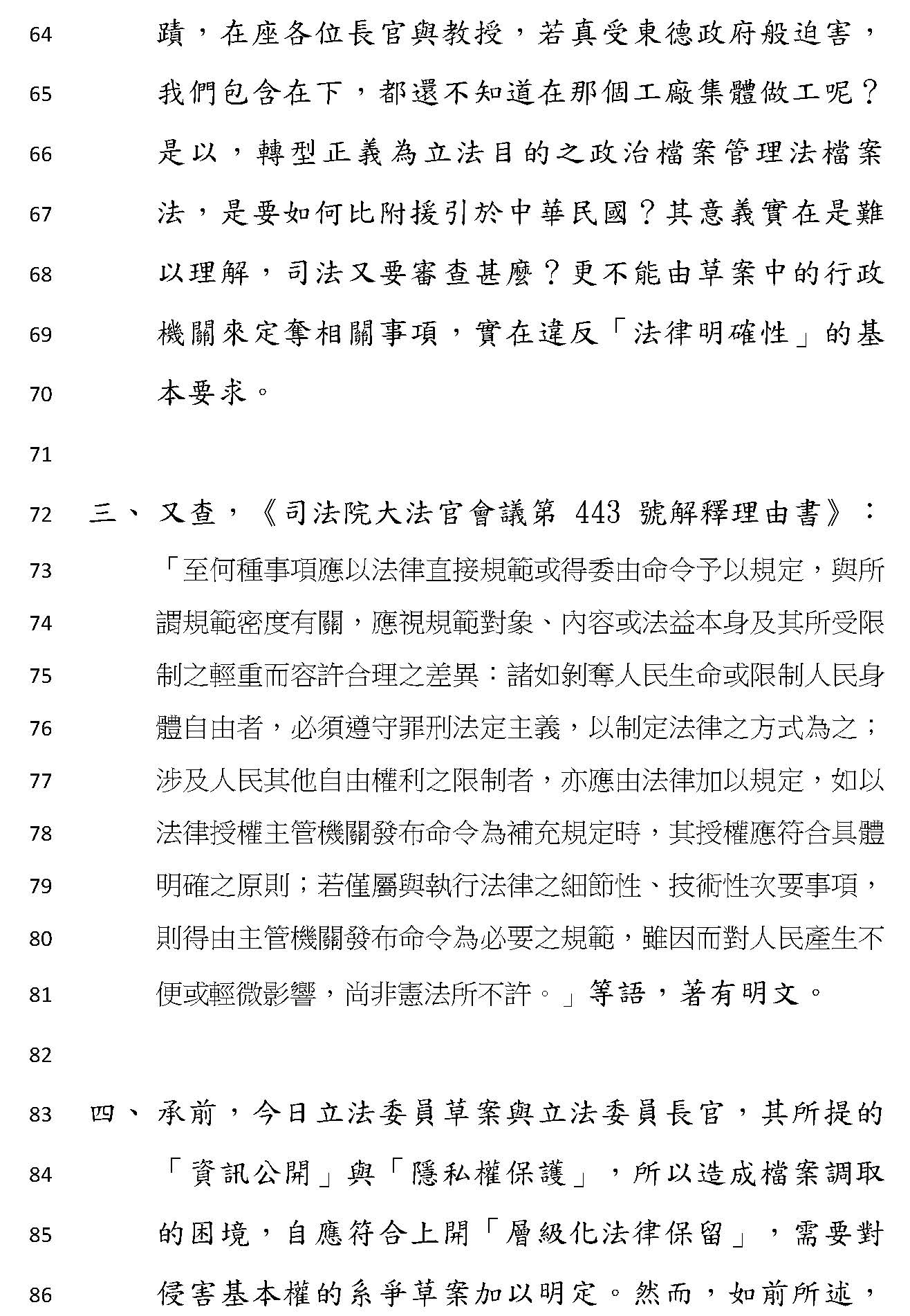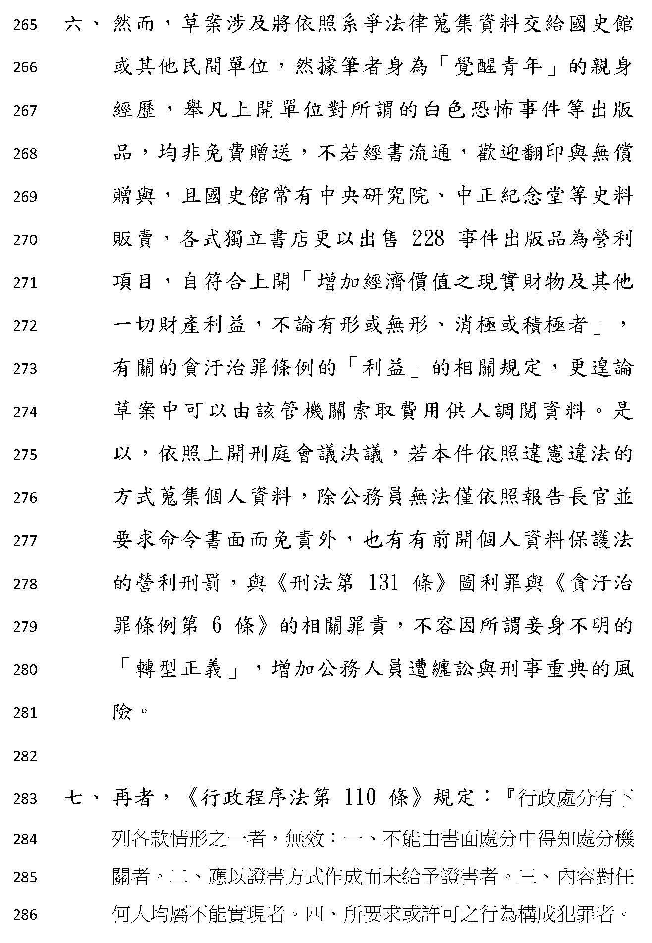 我在書面資料中還提到一個比較敏感的問題,我們都非常歡迎學術單位運用這些資料,但現有草案會產生一個問題,就是這些資料其實可以被商業利用,大家如果到國史館福利社或國家書局,就會發現這些關於白色恐怖或二二八的檔案其實很熱賣,我個人也常常去買這些書籍,所以了解。這部分當然會涉及使用他人個資。我在書面內容中也提到,如果確實涉及他人個資,就會產生一個疑問,那就是當時的真調會調查過程禁止侵害個資,為什麼現在我們審查的這項新草案就可以侵害個資?還有另外一件事,行政程序法規定,當事人之利與不利應一併注意。我們必須承認,一定有冤錯假案,但對於被調查者答辯過程之保障,在草案中雖然有提到,卻過度簡化,而且刑法中也規定,如果被調查者認為其父親或祖父是依法執行職務,因此對政府提告,主張政府侮辱其先人,那怎麼辦?在草案中,這種情況並未排除在規定之外,也不能說這種狀況是有問題的。