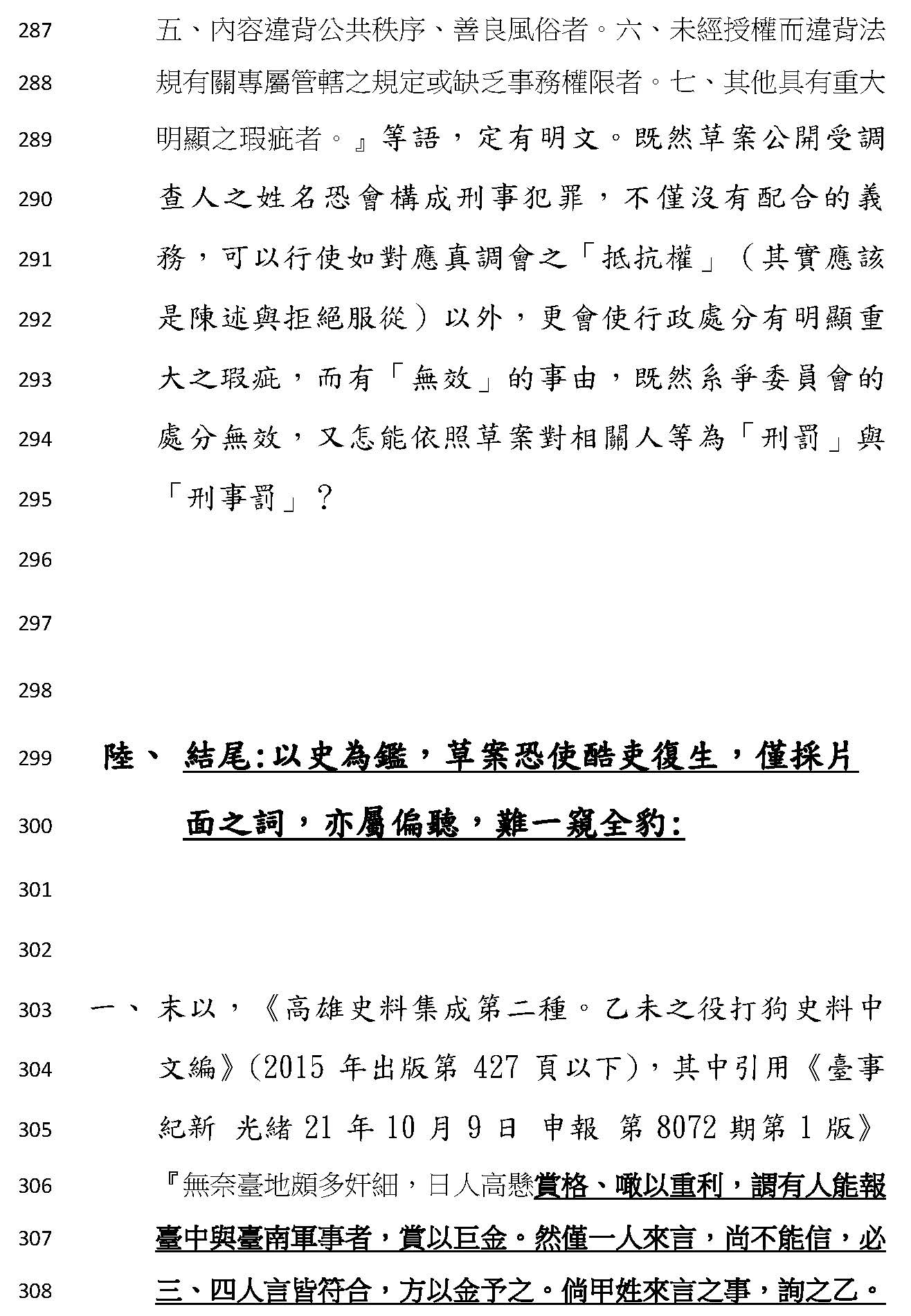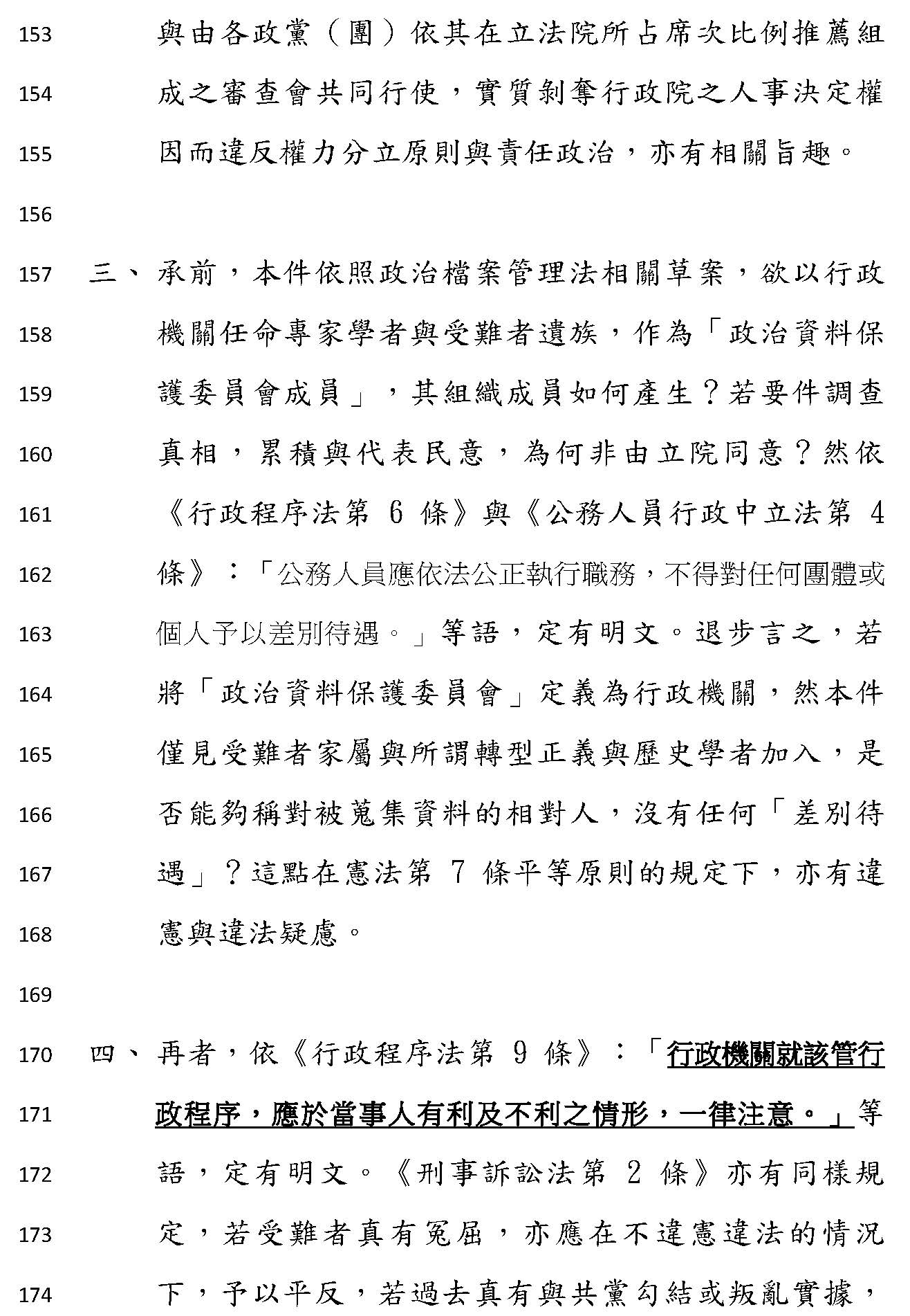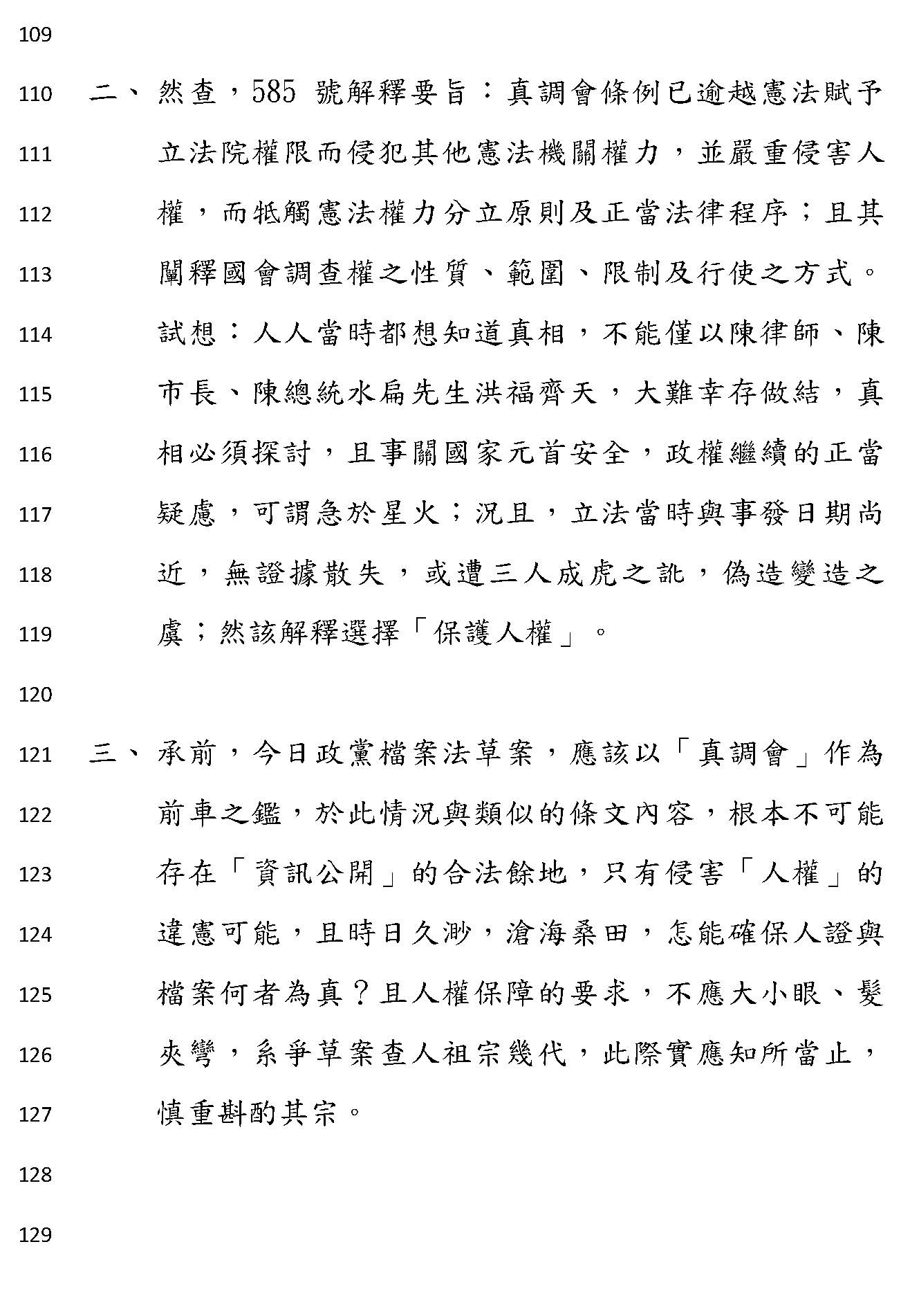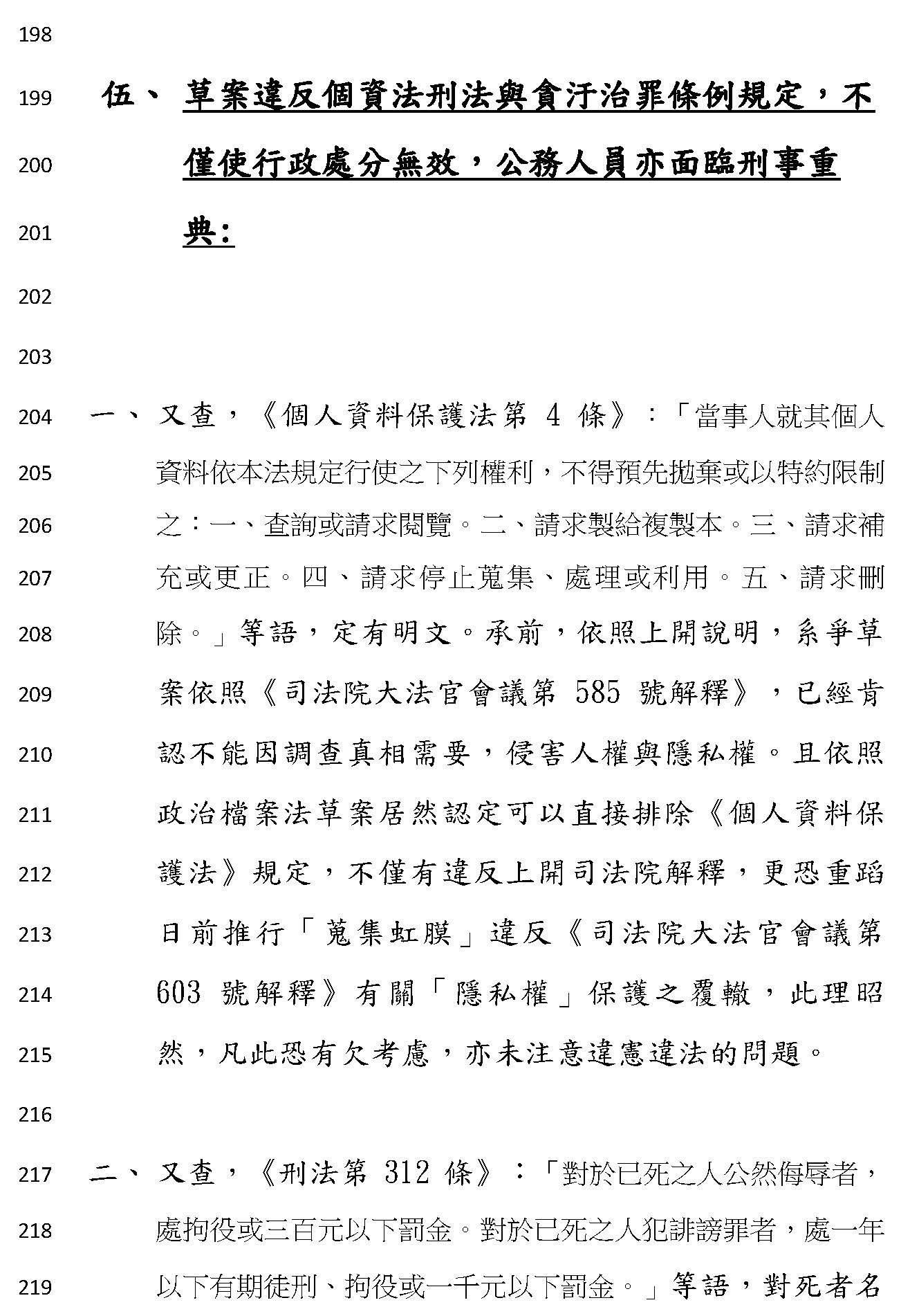 我在書面資料中還提到一個比較敏感的問題,我們都非常歡迎學術單位運用這些資料,但現有草案會產生一個問題,就是這些資料其實可以被商業利用,大家如果到國史館福利社或國家書局,就會發現這些關於白色恐怖或二二八的檔案其實很熱賣,我個人也常常去買這些書籍,所以了解。這部分當然會涉及使用他人個資。我在書面內容中也提到,如果確實涉及他人個資,就會產生一個疑問,那就是當時的真調會調查過程禁止侵害個資,為什麼現在我們審查的這項新草案就可以侵害個資?還有另外一件事,行政程序法規定,當事人之利與不利應一併注意。我們必須承認,一定有冤錯假案,但對於被調查者答辯過程之保障,在草案中雖然有提到,卻過度簡化,而且刑法中也規定,如果被調查者認為其父親或祖父是依法執行職務,因此對政府提告,主張政府侮辱其先人,那怎麼辦?在草案中,這種情況並未排除在規定之外,也不能說這種狀況是有問題的。