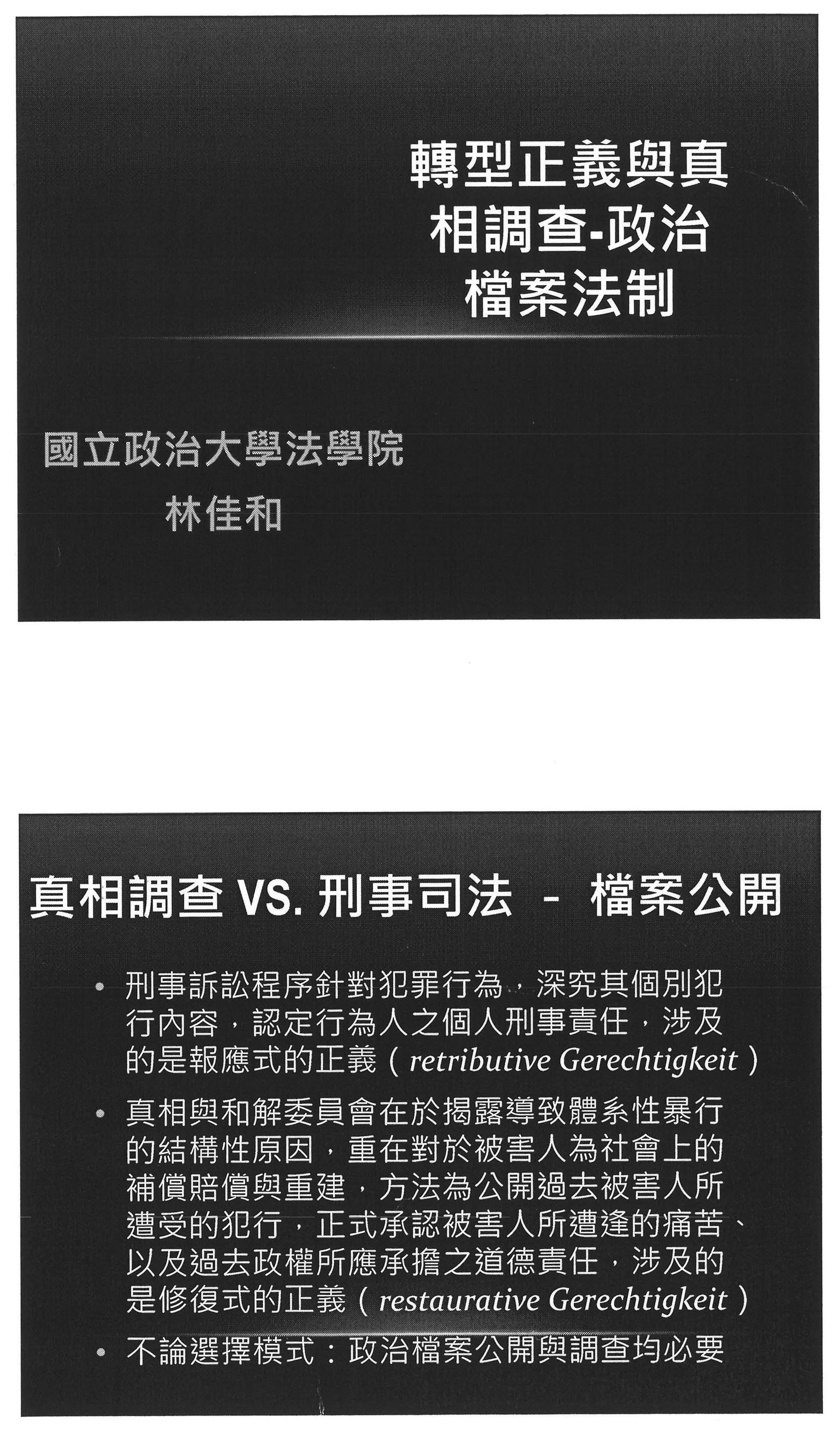 除此之外,因為剛剛有聽到一些先進的發言,可能是出於對於轉型正義本身的概念或政治檔案法草案裡的某些用語不是那麼了解,所以感覺上對於法條定義的概念及立法精神不是非常清楚或有些誤解的地方,因為我身為法學者,所以希望能藉這個機會做一些更清楚的說明。首先,對於政治檔案到底是什麼?這件事情我覺得有必要再說明得更加清楚,因為剛剛有幾位先進已經有提到,並不是所有與國家權力行使可能有濫用或錯誤的情形,全部都包含在政治檔案的範圍裡,並不是這樣子,政治檔案有個嚴謹的定義,至少在政治檔案法裡對政治檔案的定義是指在沒有民主化或沒有法治國化之前由國家所施為,對於人權大規模侵害的整件事情相關檔案,會被這一部法典的草案定義成政治檔案,所以如果是在民主化或是法治國化之後的國家權力,即使是重大失誤的個案,其實也不會落入政治檔案法草案的範圍裡,所以這是必須先行瞭解的,否則就會跟後面其他完全無關的案例有所混淆,這是第一點。