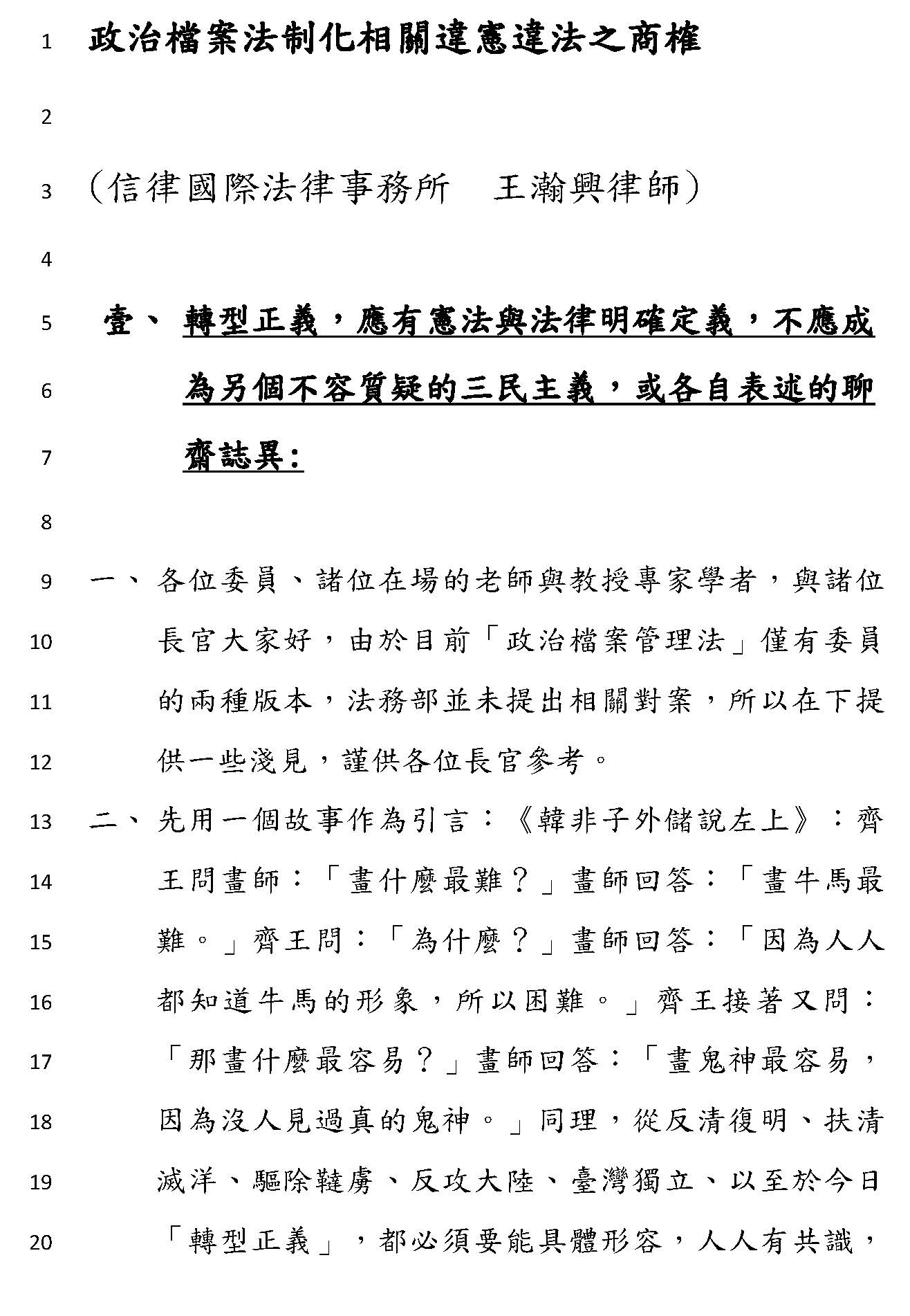 王瀚興律師:主席、各位委員。今天很榮幸受邀參加這場公聽會。基本上,如果我早知道大家都當場提供書面資料,我就不敢斗膽先寄檔案,因為我覺得寄信比較容易。
