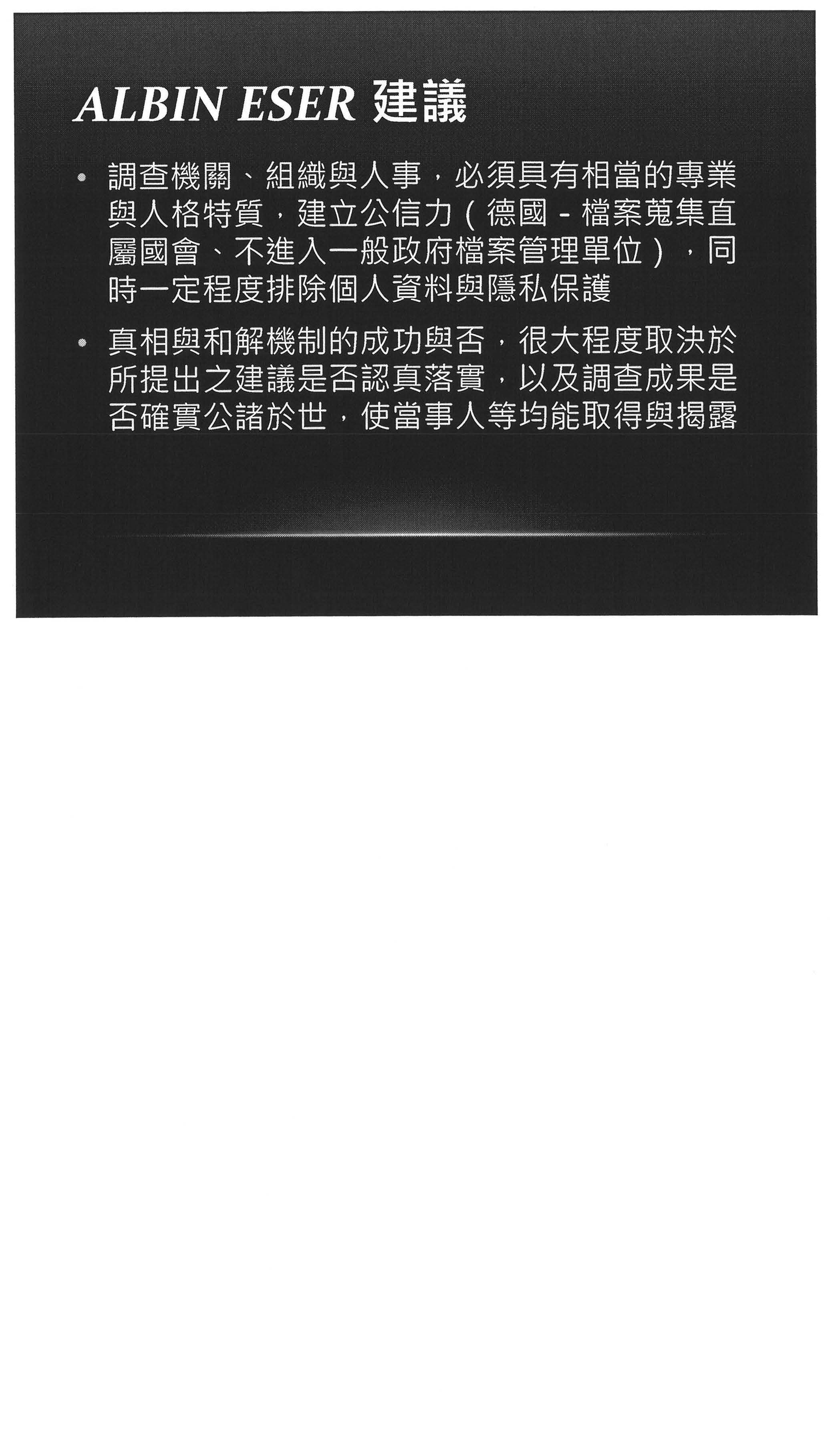 最後,國際刑事法院的Eser法官、也是德國刑法相當權威的教授,提出了一些建議。他說:對於昔日政權的不法必須全面性的分析,不要只侷限在個別事件,特別優遇、寬待或歧視,報復特定的對象過猶不及或是半推半就、虛情假意,最後都會傷害整個轉型正義達成的目標。對於真相調查,Eser法官的建議是,不能依賴願意合作者主動坦承,必須憑藉更有效的手段及方式,讓昔日政權人士能夠誠實告知,甚至可以用如果你坦白,我會利用特赦或不再進行其他追訴的方式加以處理。調查機關的組織及人事一定要有相當的專業及人格特質,並且建立一定的公信力。Eser法官也提到德國相對來講是一個比較成功的案例,它的檔案蒐集不納入一般的政府檔案或國家檔案的體系中,而是另外成立一個獨立的單位直屬於國會,不讓它進入一般的政府檔案管理單位;同時,像剛剛所說的,也排除一定的個人資料受到隱私的保護。
