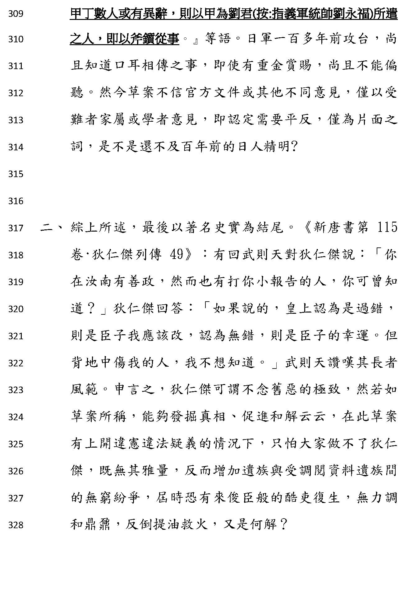 周婉窈教授:主席、各位委員。剛才限於時間,僅提到我對草案四點意見中的一點,現在就以尤委員的版本為準,繼續就另外四點做說明。有關下限定在刑法第一百條修正通過之日的原因,剛才已經說明過了,現在就不再贅述。