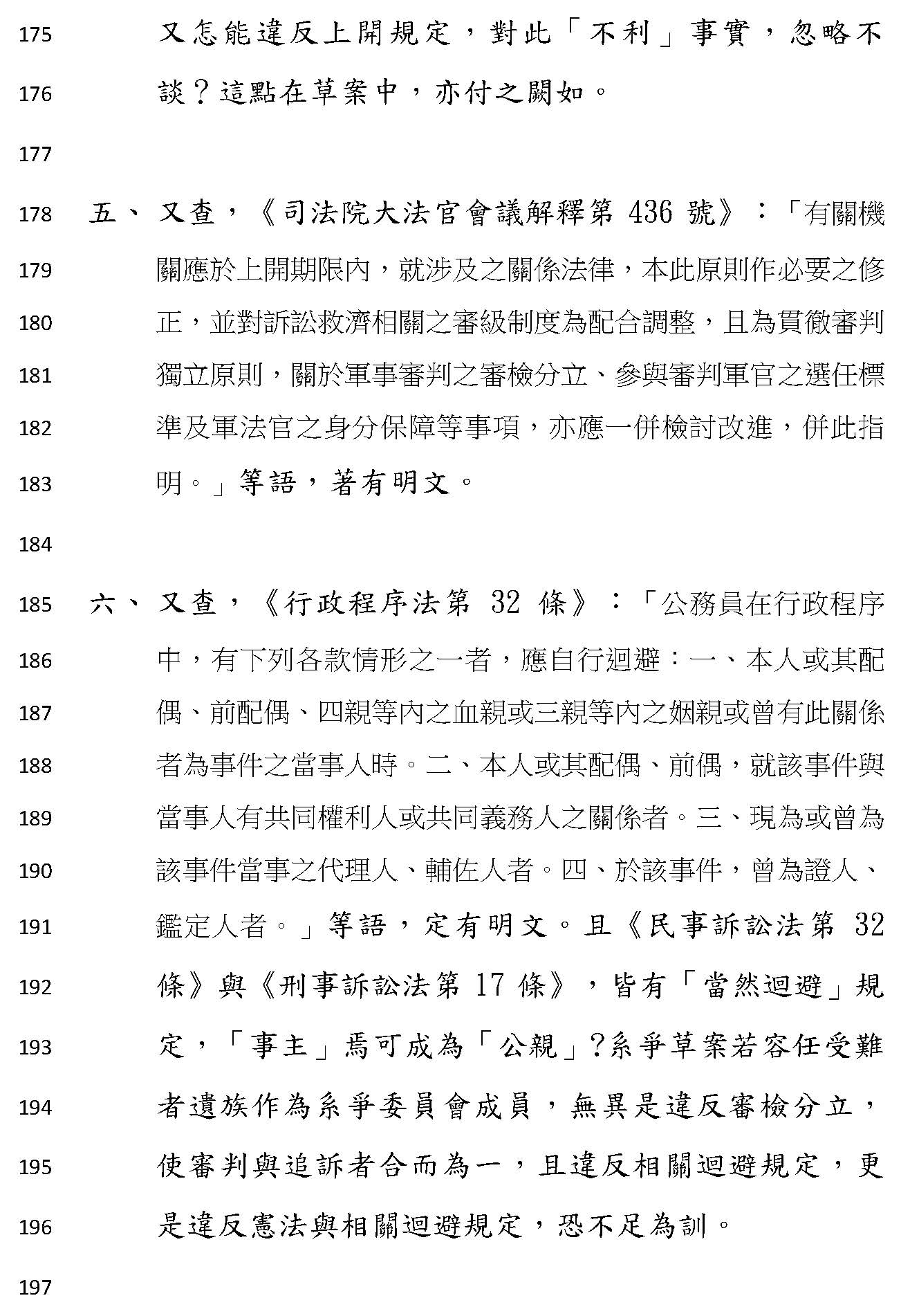 我在服役時接過一份公文,當時我在總統府旁邊當預官。該公文引用行政程序法第一百六十八條指出,不接受匿名檢舉不當管教。結果我當時跟身邊一群軍官都取笑,針對軍隊怎麼會引用行政程序法,如果是行政程序,就應全部按照行政程序法。所以我在書面資料中提到,其實本件草案有些問題,那就是先設計了專家學者機制,這樣固然很好,卻會違反行政程序與一般民事訴訟、刑事訴訟最簡單的原則,就是迴避。比方說,很多受難者家屬是利害當事人,依照行政程序法,就算是我,也不可能同一時間既是法官,又是底下的當事人,也就是不可能同時是偵查者、審判者與調查者。問題是現在的草案就違反了這個基本精神。第2點,如果按照現行草案處理成員之組成,甚至有另外一版草案規定某些人不可以參與委員會,儘管這種規定的宣示性意義比較大,畢竟從民國30幾年到現在,這些人可能早已不在,但我們必須警醒的是,會不會因為草案,導致某些人就是不能擔任特定職務。這樣講好了,過去的公司法確實有涉犯叛亂條例者不得擔任公司之負責人或經理人的條文,可是後來都被廢除,所以,我們要警醒的是,會不會因為調查結果顯示某些人曾經犯了一些過錯,導致他們在其他法律下享有的基本權利遭到限制?這是我們必須知道的。