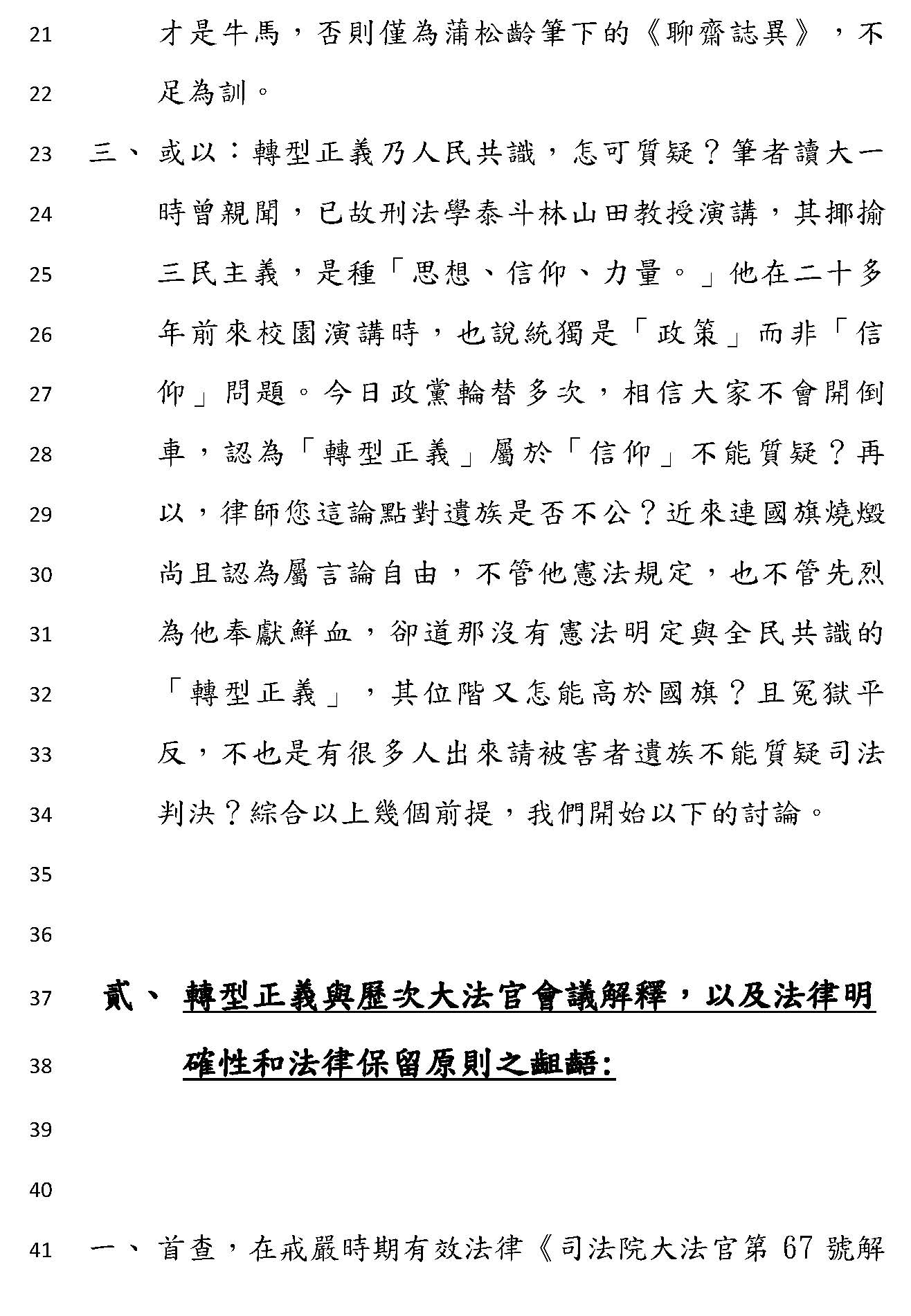 最後,我要特別強調轉型正義跟法治國的關係,因為之前在報章雜誌或媒體上面,也常看到很多先進提出立法內容是針對特定人物或是政黨,違反國家中立的要求,是不是抵觸法治國的規範?關於這一點,我要特別指出,這種古典概念出自於自由主義憲法理論,是一種抽象思想實驗,或是出於一種虛擬社會契約而得出來的結論,但我們活在現實世界裡面,都知道國家不是無中生有,所以沒有辦法對無中生有的國家進行一個法治國權力機制的安排,而是必須考慮到現實世界裡面存在的國家在法治化、民主化之前不法、不民主的歷史,這些國家對於人權大規模侵害的歷史事實要如何處理的問題,我們既沒有辦法迴避,也是現實國家一定都會有的問題,這就是轉型正義最核心的本質,因此沒有辦法抽離歷史或是社會文化脈絡抽象的去談法治國,因為沒有國家是存在於虛無之中。
