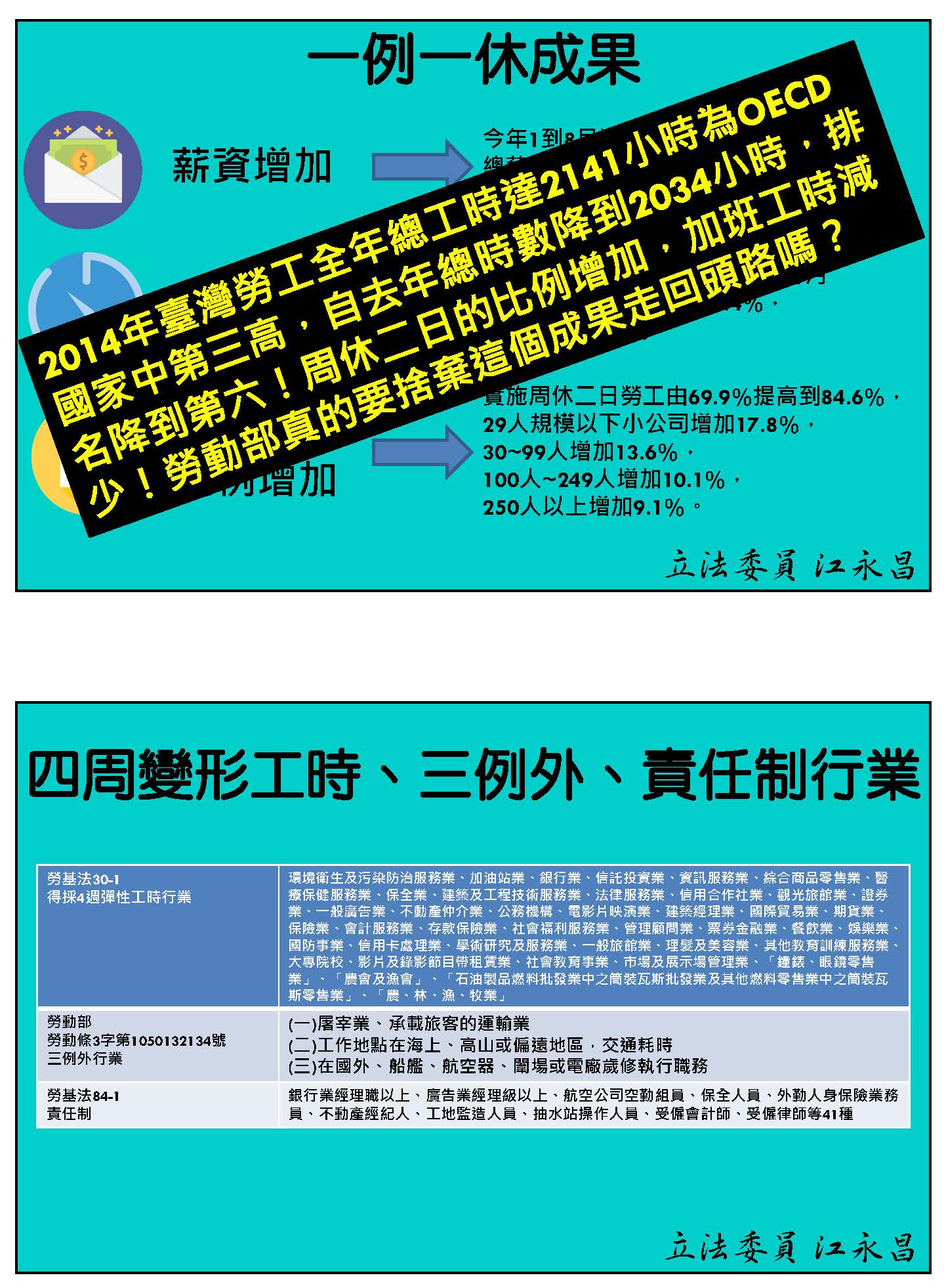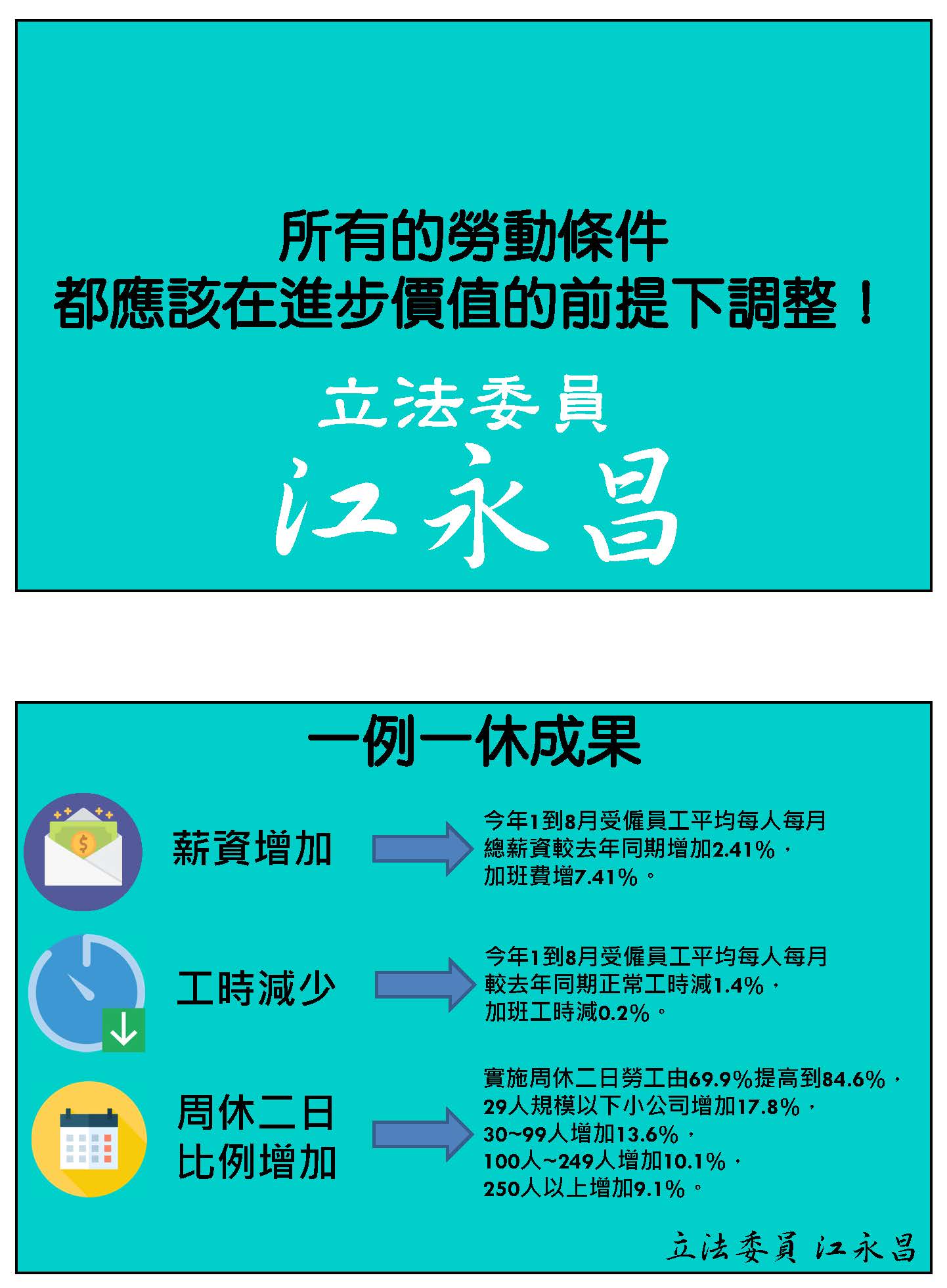 我就在想,這反映出一件事情,台灣過勞案件的比率其實真的也不低,如果我們去年底推動的修法能夠讓總工時下降、加班工時下降、週休二日提升,我們對我們自己的檢驗,是不是我們對於勞動條件有一點點提升,對我們過勞發生職災的現象有做進步與改進?這是事實嘛!為什麼不捍衛這一點點進步?我知道有人會講這是平均,還有很多產業、行業、企業可能還在運用很高度的工作時數,或是覺得很奇怪,為什麼我們不把這些產業、行業、企業往進步拉一點點?怎麼會再開放彈性隨他們而去呢?我想講的就是其實那進步的幅度也只有一點點,如果真的對產業造成很大的衝擊,那麼應該反映在主計總處失業人數的統計上,或者有很多企業倒閉,但是有這樣的數字嗎?我也沒看到。所以我在此提出我的疑慮,進步一點點,應該守住這個成果。