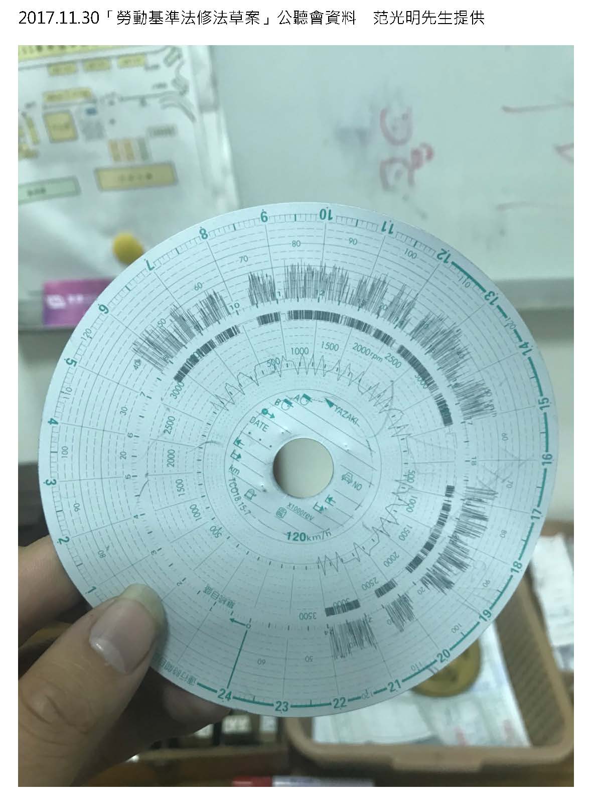 范光明理事:主席、各位委員。本人代表台灣汽車產業工會報告汽車產業的一些情況。我現在手上所拿的這張資料,各位或許很陌生,我跟各位簡介一下,我們俗稱它為客運的行車紀錄器,各位可以看到這一張上面是寫從早上5點到晚上12點,這代表什麼?這代表這位司機從早上4點出門,做到晚上12點半,1點整理好車子,回到家大概已經是1點半,他沒有多久就要起床,就是連續工作,這樣應該就是過勞吧!