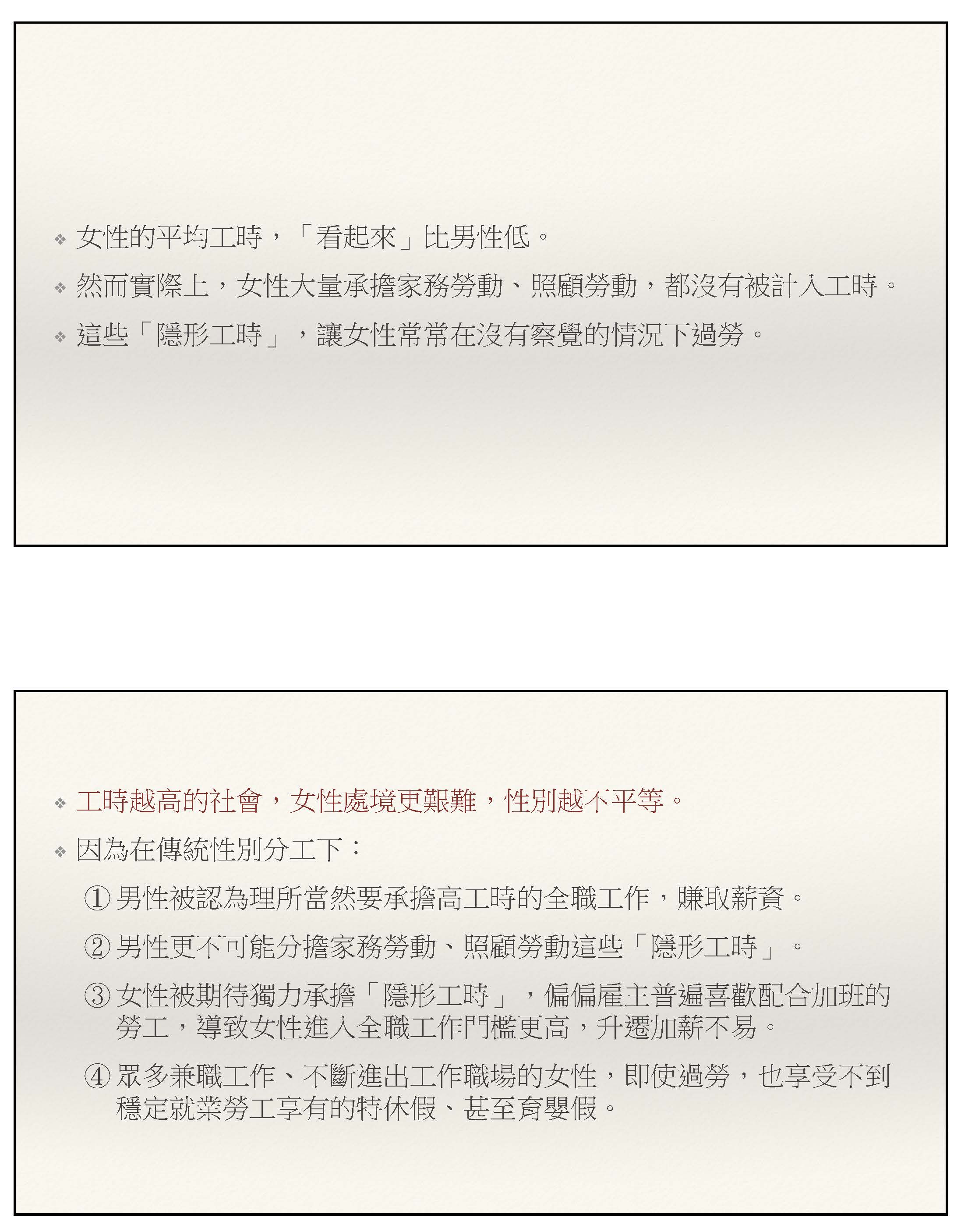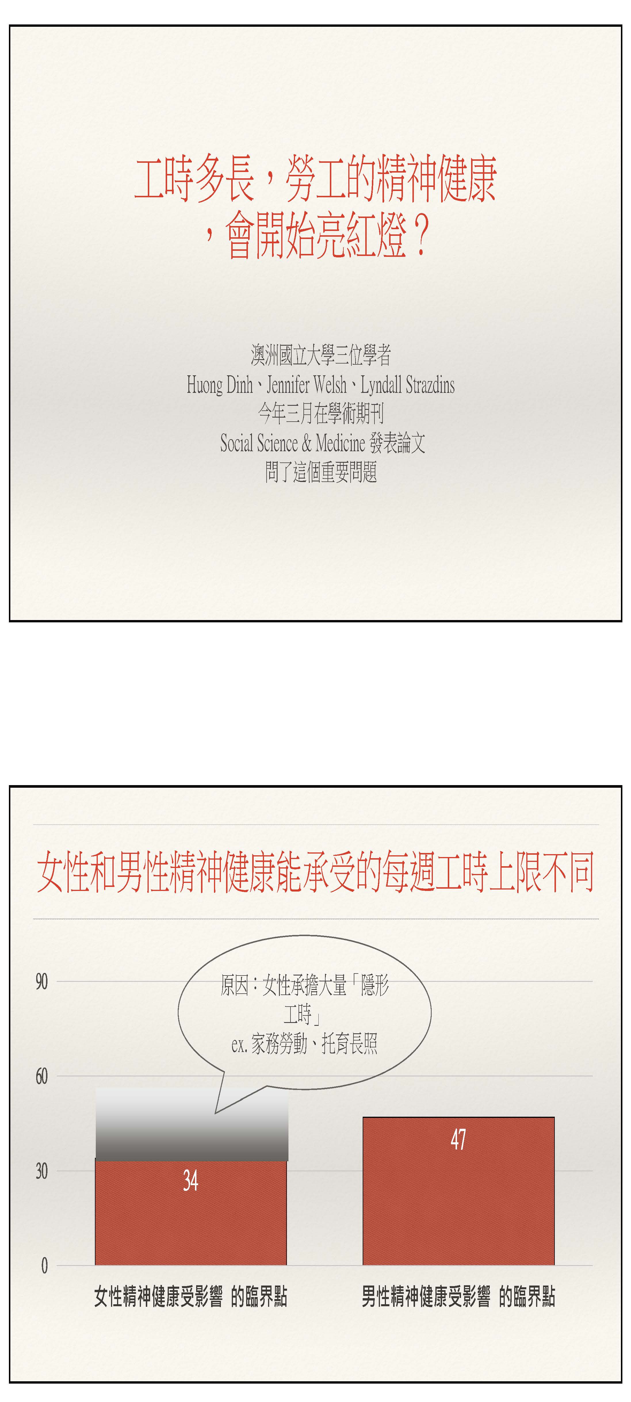 根據他們的研究顯示,女性與男性在精神健康所能承受的工時上限是不同的,女性能承受的精神健康臨界點,大概是每週工時34小時以上,精神健康就會受到影響,而男性則是每週工時超過47小時精神健康會受到影響。為什麼會有這個差距?這幾位學者的研究認為並不是因為女性比較容易精神崩潰,而是因為女性承擔了大量的隱形工時,就是在傳統的性別分工下,女性大量承擔家務勞動、照顧勞動,包括臺灣現在很急迫的長照問題及托育問題,因為我們政府的公共長照、公共托育做不出來,所以大量由女性來承擔這些工作。