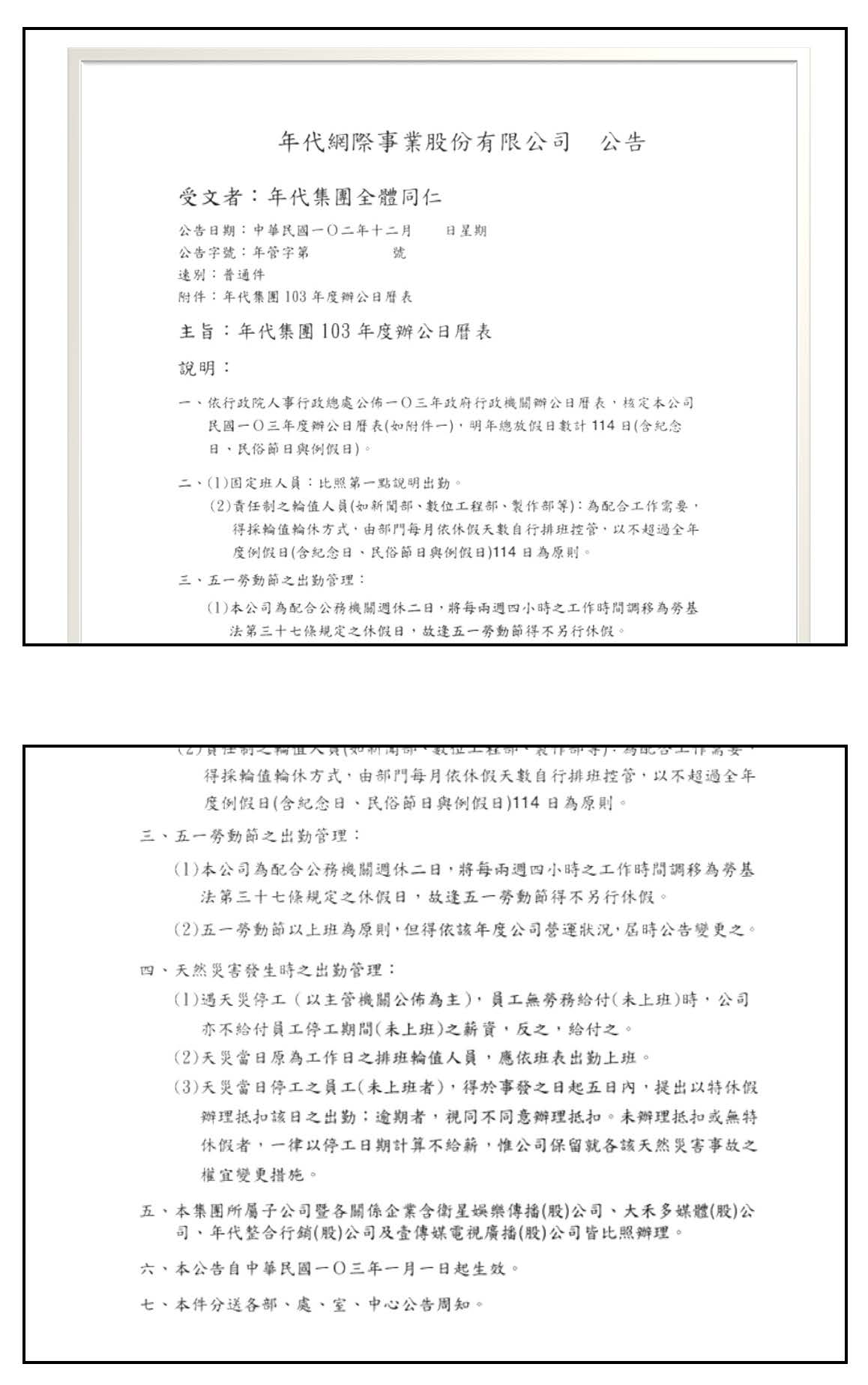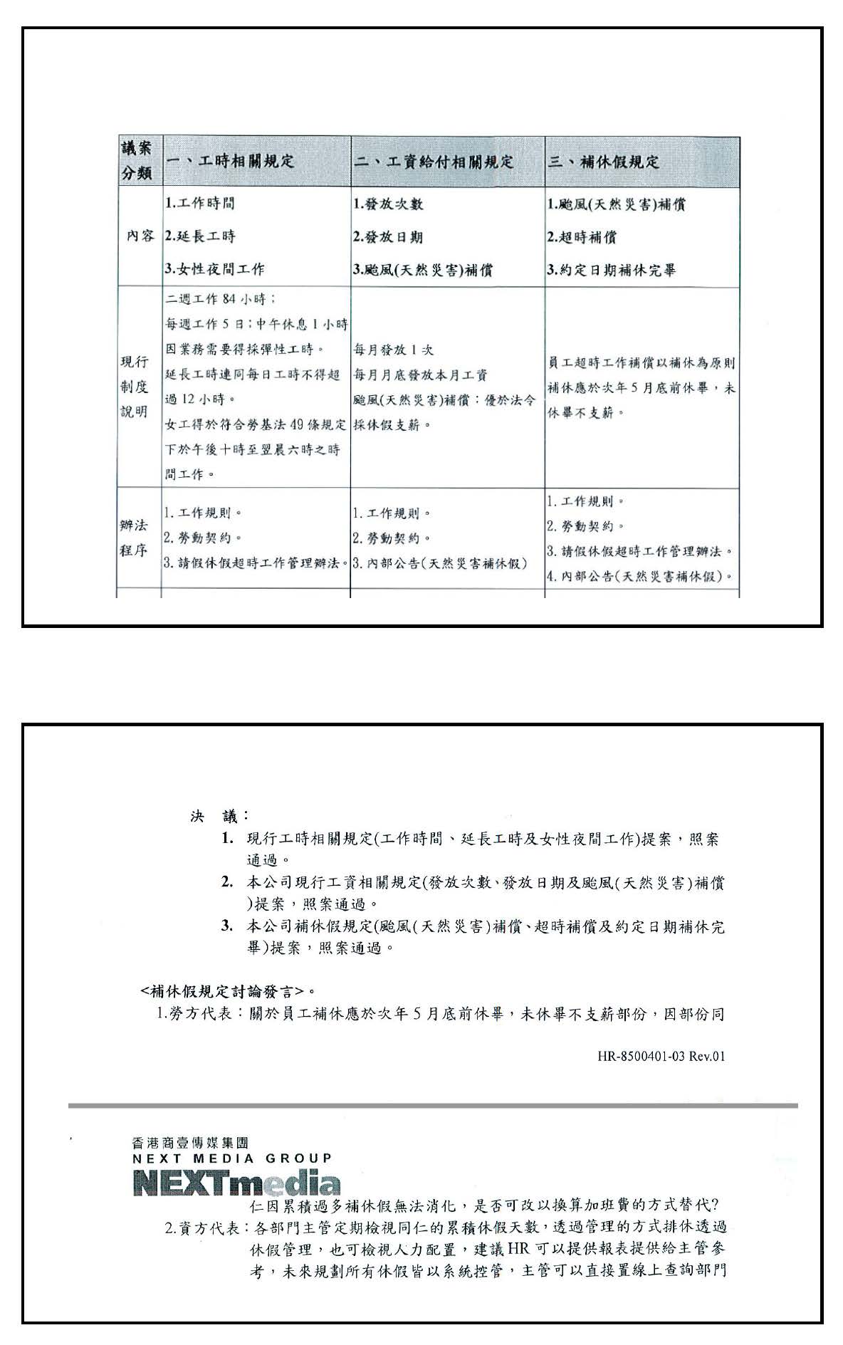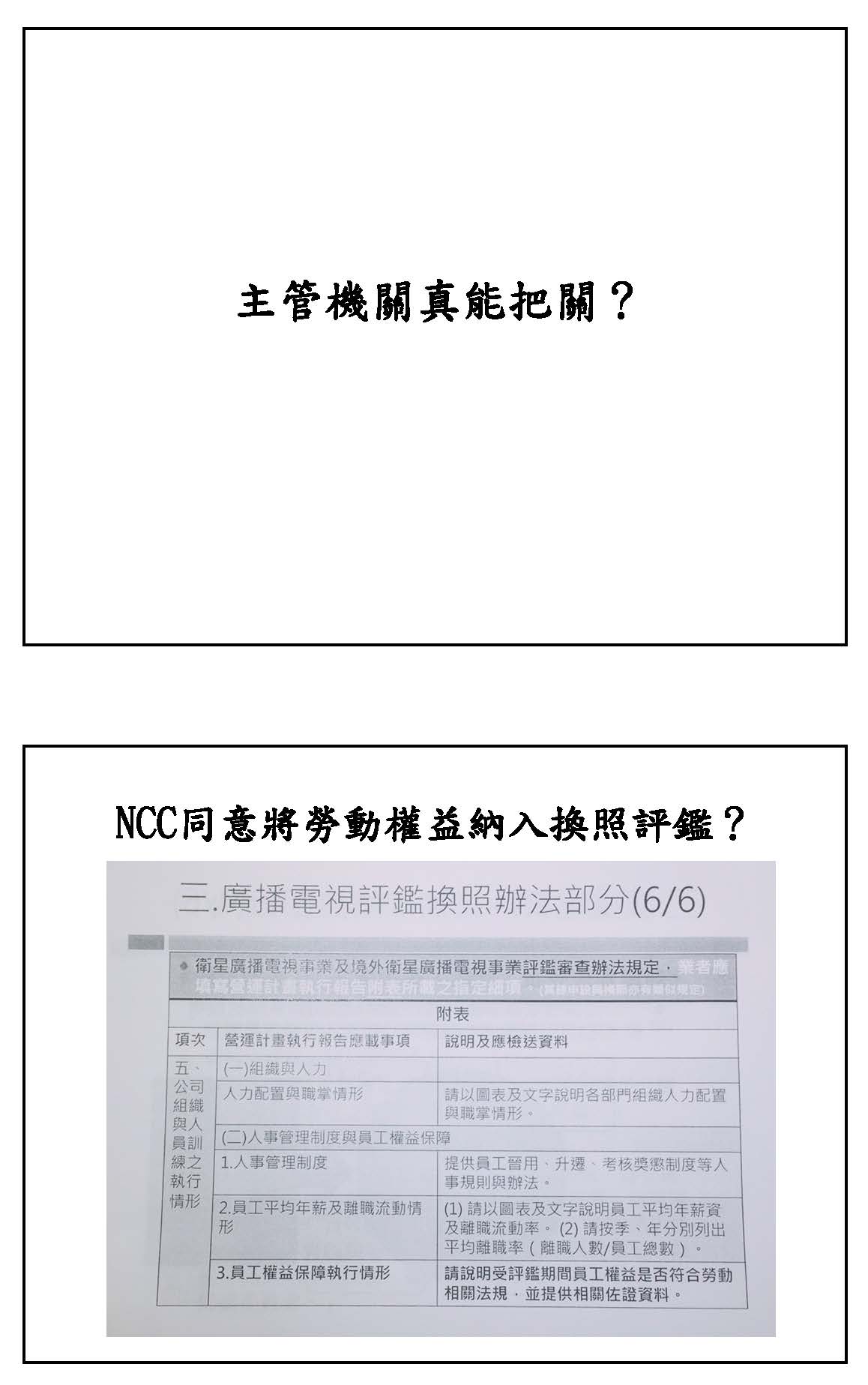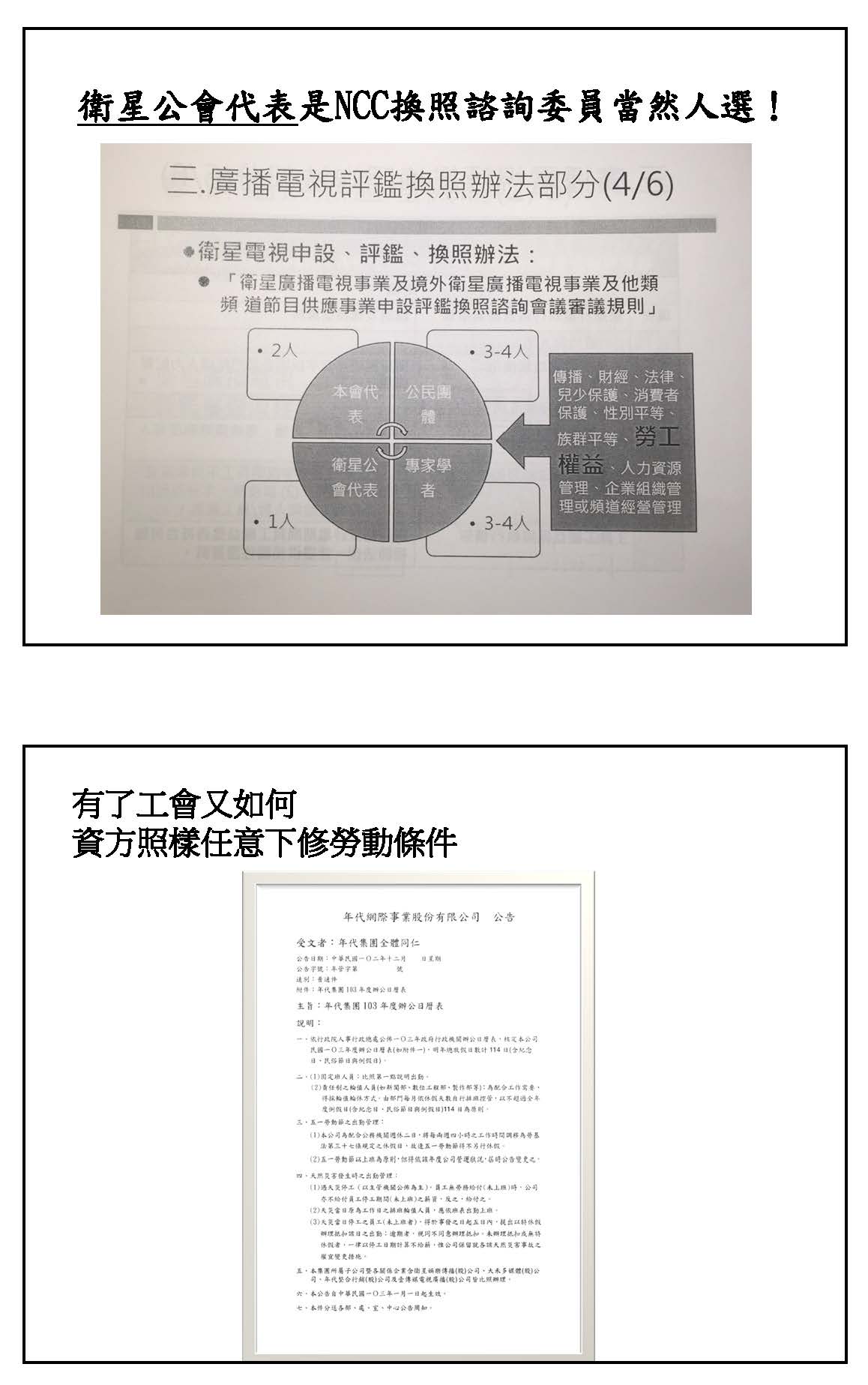 這次的會議我們一共通過3件事情,包括工作時間、延長工時及女性夜間工作,同時附帶也通過颱風天要補假,全部都在裡面。我們這是合法的勞資會議開會所做出來的決議,也寫在工作規則內,這個格式還沒有結束,後面有講要標註在工作規則內,送台北市政府勞動局備查,結果呢?當中還有一些其他東西,我就不贅述。結果是什麼?壹電視現在有沒有颱風假?我們片面被取消颱風假,現在全部的媒體,只有壹電視跟年代的記者就是沒有颱風假,老闆說有本事你去修法,壹電視本來有五一勞動節,賣給年代之後,老闆一張公告我們的勞動節就沒有了,我還問他們勞資會議到底有沒有用。後來我們勞檢的時候,我們說工會沒有同意女性夜間工時,老闆就把這一張拿出來說,勞資會議有同意喔!所以我就跟勞檢員講,那我們的颱風假呢?結果勞檢員認女性夜間工時,而且當年同意之後,就算我工會成立了,我沒有辦法推翻它耶!所以未來的壹電視,永遠都是同意女性夜間工時的狀況,這合理嗎?然後老闆不認這一份,他說那是過去老闆簽的,他不認,還有這種事情喔!同一次會議,他認了這一項卻不認另一項,這是現在的資方,為什麼現在勞工對於勞基法修法這麼反彈,勞工會講「慣老闆」、「惡老闆」?就是類似像這樣的事情。還有講到所謂把工時間隔11小時下修至8小時等等,一樣是由主管機關把關,我們來問看看主管機關真的能把關嗎?電視台的主管機關是誰?NCC,沒錯吧?NCC跟我們講過換照評鑑要加註勞動權益,我們看一下換照評鑑裡面這兩大項的配分標準內容,哪裡有講到勞動條件?沒有。我們在三年前就提出來了,兩年前NCC說好,到今年還是沒有啊!有任何一項規範講到勞動條件嗎?這一份是NCC給我們的資料,但是可怕的是後面這一張,換照評議委員會中怎麼會有一個衛星公會的代表?他是資方的人,他是當然代表,那麼我們勞方呢?我們的人在哪裡?沒有。所以資方換照時,NCC裡面有一位資方的人,我們勞方沒有代表,每年換照時,各電視台的工會根本不知道有這種事情,你說能保障勞動權益,沒有人相信!我剛才在解釋什麼叫做惡霸的資方。這份公文日期上寫著102年12月,後面什麼都沒填,我告訴你,這份公文是102年12月31日晚上7點半公布,這份公文就是告訴我們沒有五一勞動節、沒有災防假,也沒有全薪病假了,這是在我們大家下班時,它公布了,第二天我們來上班時,這些假沒有了。那麼大家覺得我們工會會受到多大的壓力?我們被罵翻了。這個發文時間,我沒有填進去,它就直接公布了,這幾項的內容包括天然災害發生時的處理辦法,這些直接下修我們勞動條件的內容,竟然不需要跟工會協商,我們有工會啊!它沒有跟我們協商,就直接下修勞動條件,我們有發脾氣嗎?沒有。我們發文給公司,請他們來談,如果不給我們災防假也沒有關係,但是應該給我們相對的補償金額或是上下班交通出勤費或是誤餐費,用任何代金給我們,但是免談!免談的結果,最後我們就拿到罷工權了,就是如此。