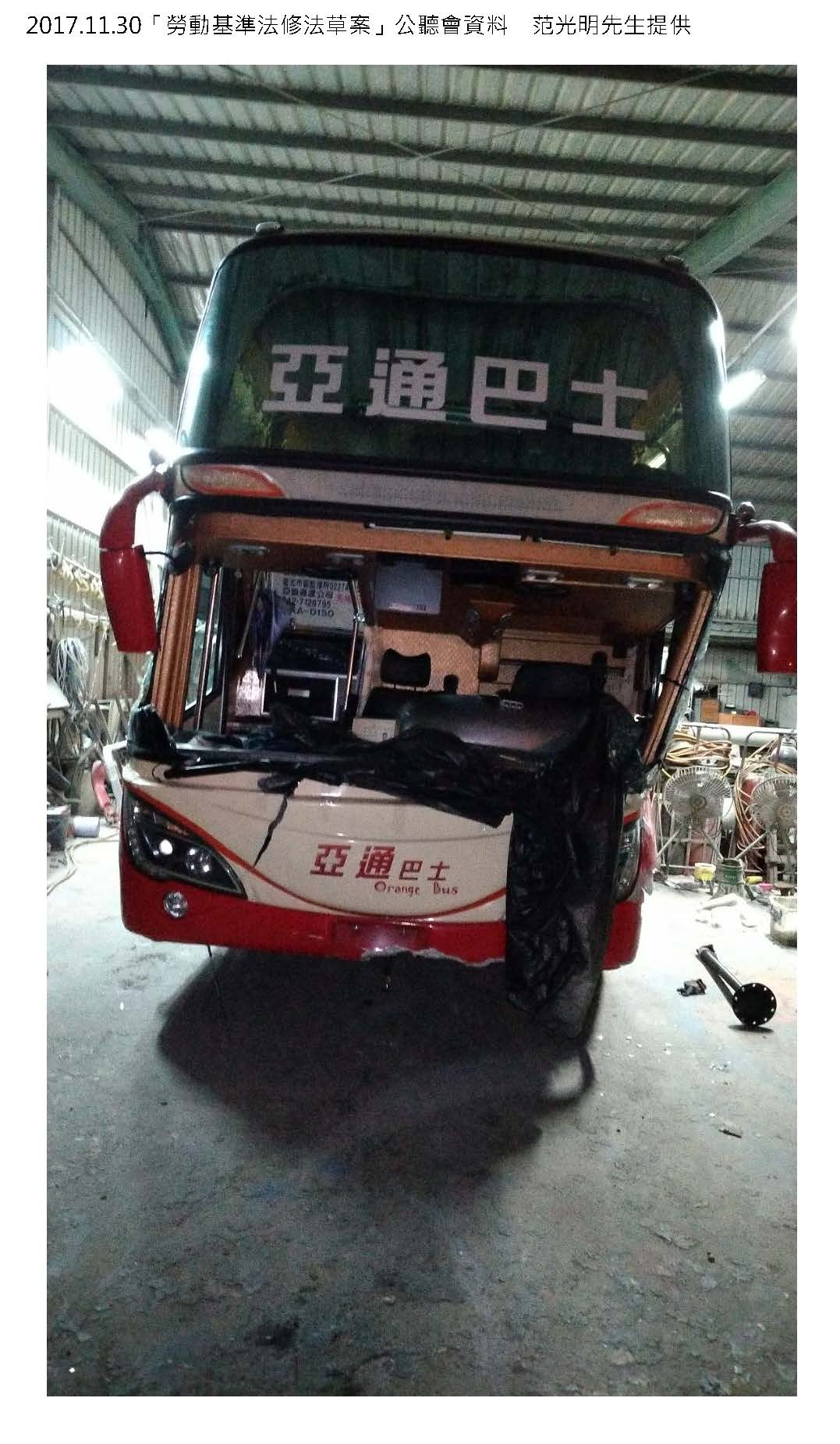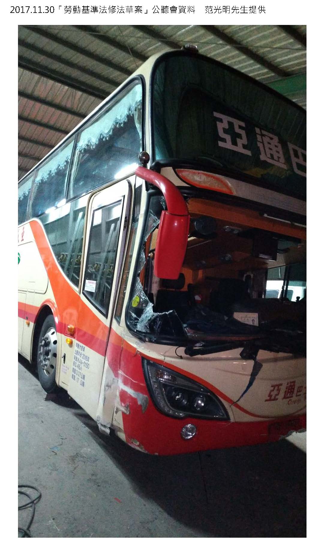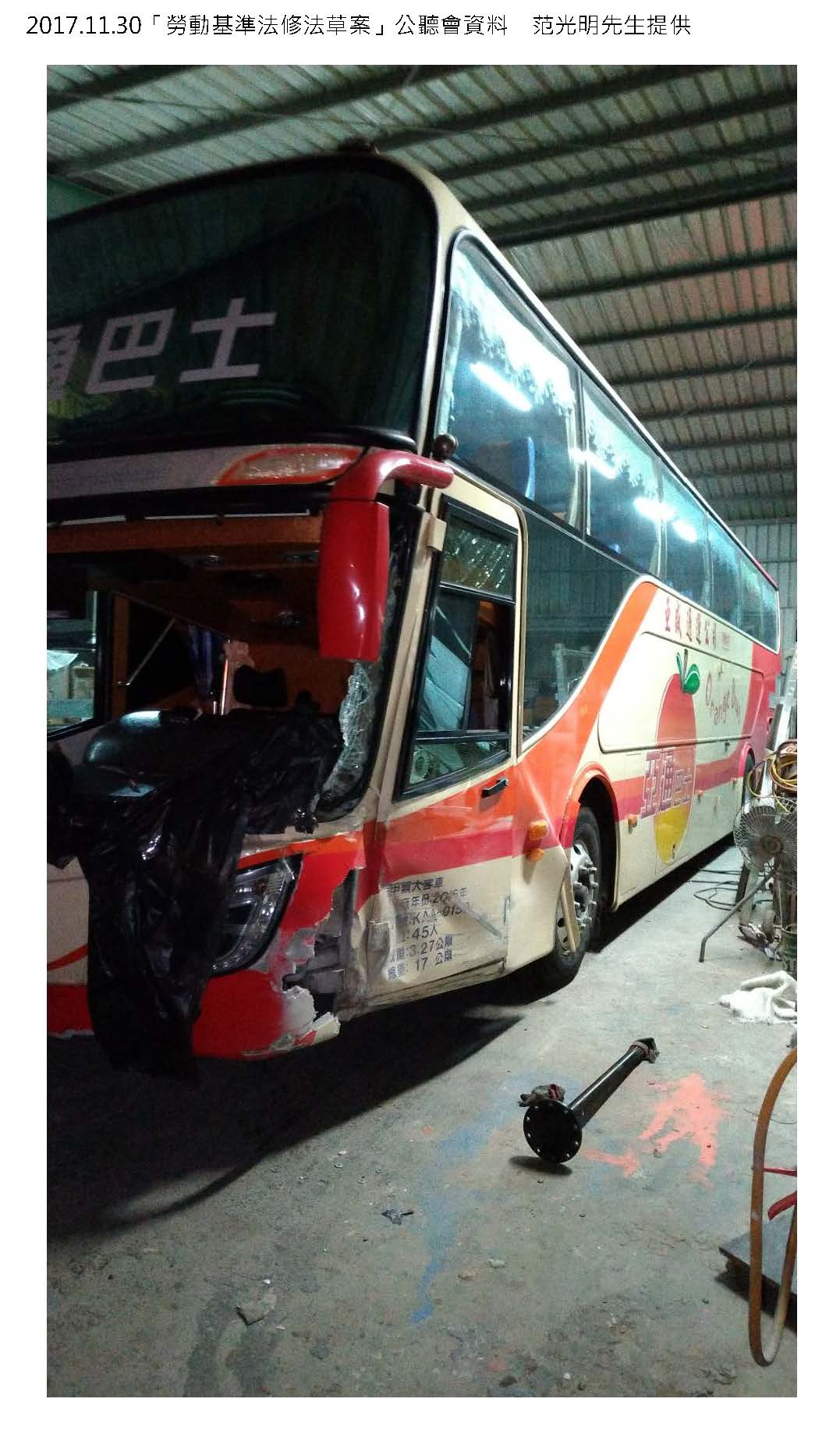 我來念一下媒體報導司機過勞的新聞,2016年11月台中捷順交通公司的鄭姓司機連續工作16小時,以致倒在駕駛座上,後來也過世了。2017年2月蝶戀花事件,康姓司機工作期間最高連續出車22天,疑駕駛時間過長出現疲勞導致翻車,造成了33個人死亡。2017年3月寶泰運通公司的陳姓駕駛連續工作46天,也是過勞,死前為保全車上22名中國遊客安全,猛力煞車撞上民宅後心肌梗塞猝死。2017年6月國光客運李姓司機猛撞前方貨車後,司機肋骨穿刺彈飛,送醫不治,造成29人受傷。2017年10月台南興南客運的李姓駕駛因心律不整昏迷,重傷送醫;三重客運617號公車司機的何姓司機失去意識倒臥駕駛座上。2017年11月大台南公車的蘇姓司機擦撞路旁5部轎車後,停下趴臥駕駛座上,經送醫後不治;台南市府城客運一名戴姓女司機,突然胸腔刺痛,她用盡力氣把公車停靠路邊,送醫急救挽回生命;土城遊覽車司機疑身體不適,在國道三號自撞護欄身亡。