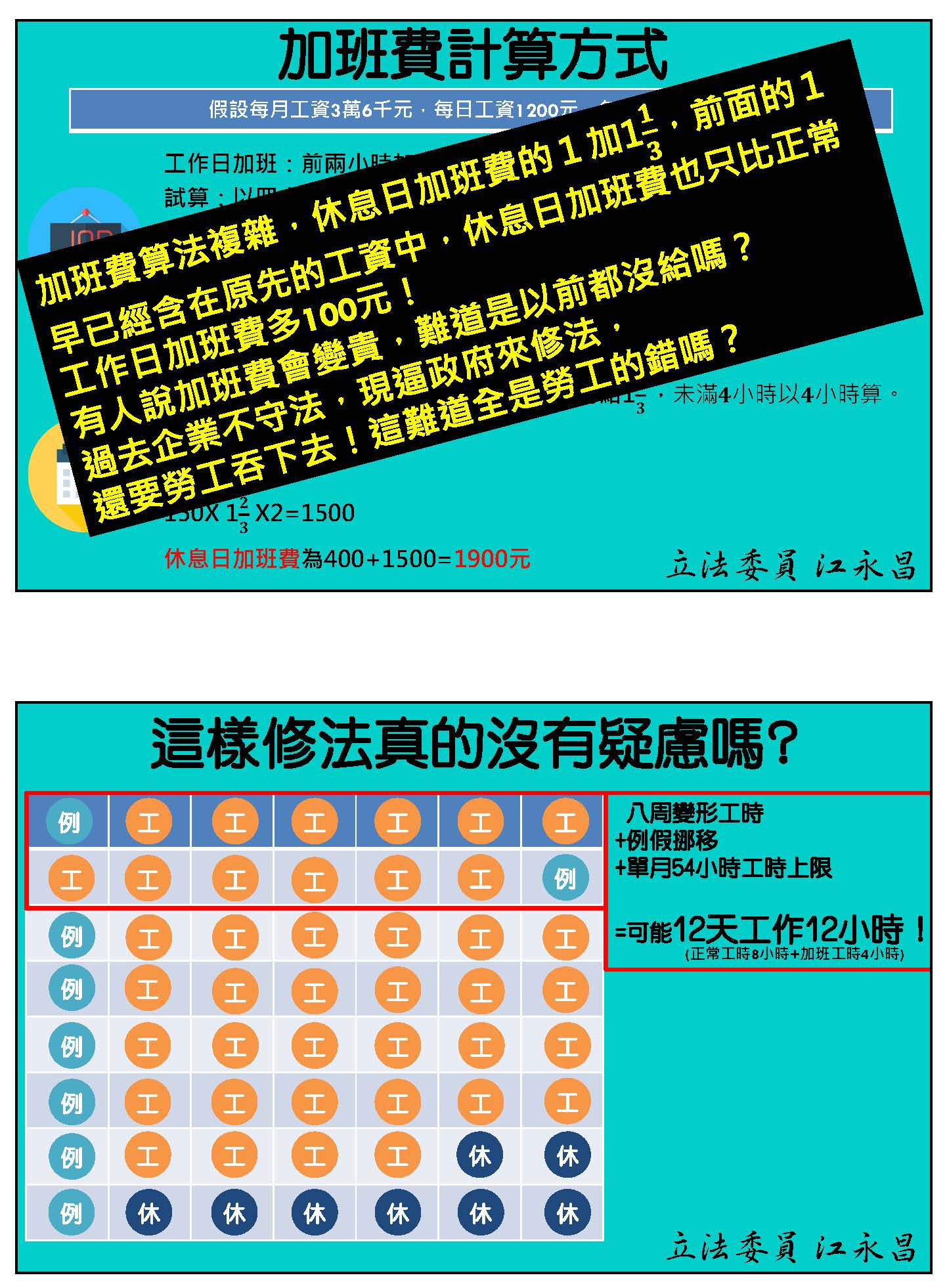 另外,我也想問一件事情,我真的很疑惑,這一次也有人說都是因為一例一休上路之後,休息日的加班費高額增加,導致很多行業不敢讓勞工加班,我也很不解。現在休息日加班費的計算,就是按平日之工時再加給一又三分之一,第三個小時開始,再加給一又三分之二,問題是按平日工時根本沒有付嘛!因為現在是用一個月30天來計算,所以月薪是除以30天,不是除以22天,勞動部在解釋時說那個「一」再加給三分之一,可是前面那個「一」根本就不見了,所以實際上的投報率根本就是跟平常工作之後的加班所拿到的三分之一是一樣的。在此我就要請教,如果有一個企業主因為接到臨時的單,要請員工休息日來工作,照理說臨時接到的單所產生的利潤應該會比較高吧,應該比正常時候接到的單的利潤來得多,那他怎麼會付不起員工休息日的加班費,導致他不能接單?除非一件事情,就是過去讓勞工在休息日加班的時候根本就沒有給實質的加班費啊!是不是這樣子?所以我說假如138小時要在三個月內共用,某一個月可以到54小時,像這樣的行業,我們真的希望勞動部或其他主管機關能夠告訴我,若他在之前每個月都給勞工足額的加班薪資,這種我們再來討論看看。事實上,我也一直點不出來,到底是什麼樣的行業會這樣。我想說的是,這還要再想一下。雖然電視上大家在討論說那是極端的排班表,可是明明8週變形工時,再加上138個小時3個月共用,每個月有54小時,再加上例假之挪移放寬之後,真的會產生極端的排班表,如果這個是彈性、是例外而不是常態,請問你限定的條件是什麼?限制的規定是什麼?是不是1年只有在旺季的時候他可以使用?其他時候若使用,工會或勞資會議也無能為力啊!這個誰來把關?或者在一家公司當中,不同員工有不同的區別,你有沒有要做限定?如果你沒有做限定,很有可能這個彈性會變例外,例外就變成常態嘛!所以不要去說這是極端的班表,當然我也不會以勞工過勞之後極端的個案來做比喻,可是我希望大家就直接回到我們的條文、回到實際的狀況,很理性的來做討論。