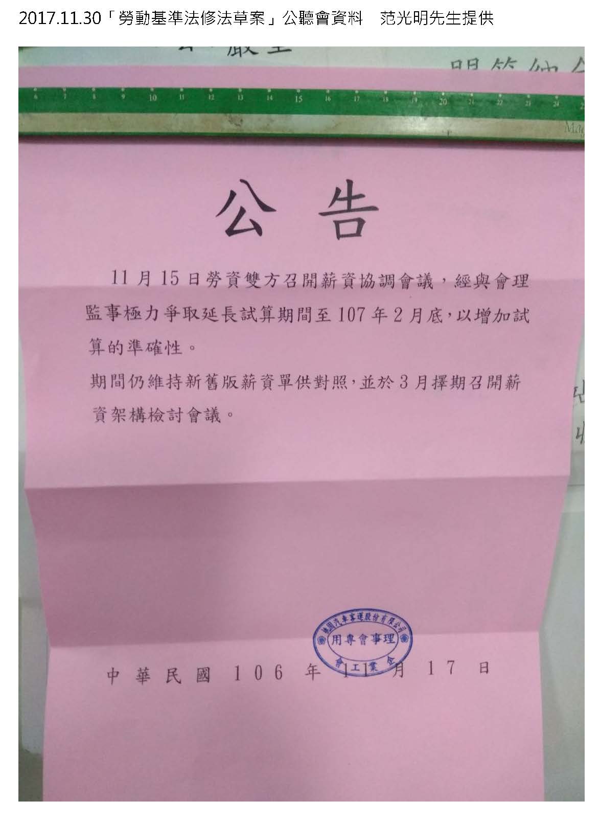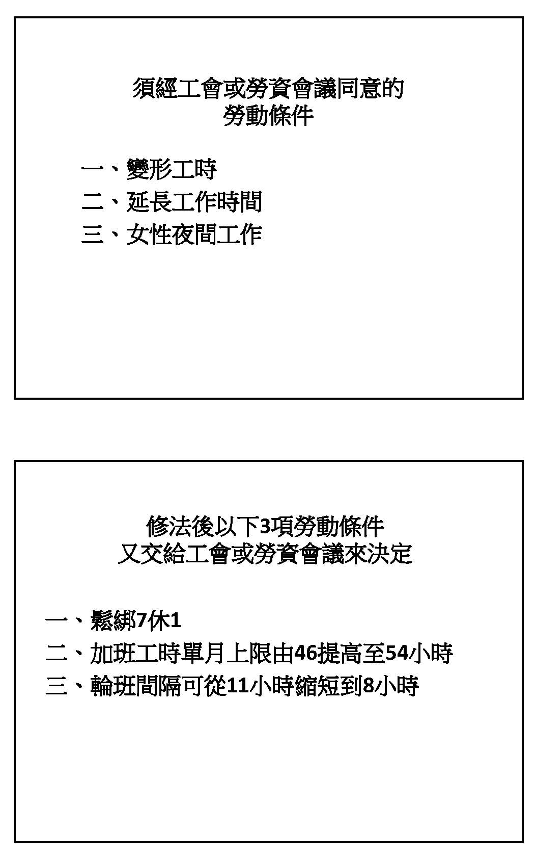 再者,有關勞資會議的部分,大家不斷地提出質疑,認為勞資會議流於形式,如果今天我們接到的更大惡例是什麼?即是如果你今天不參與勞資會議,或是不認同資方所繕打完畢的會議紀錄,對不起!明天資方就會請你走路了。事實上,如果真正考量到勞工工時的彈性與安全,應該將整個問題交給所謂的工會組織處理,然而,現今工會組織僅占7%的狀況,抑或是沒有工會組織則要交給權力不對等的勞資會議來處理,我認為這樣做一定會崩潰,以臺灣的勞動力結構,甚至資方口口聲聲所認為的幸福企業,跟所謂視員工為夥伴的說法絕對會崩潰。