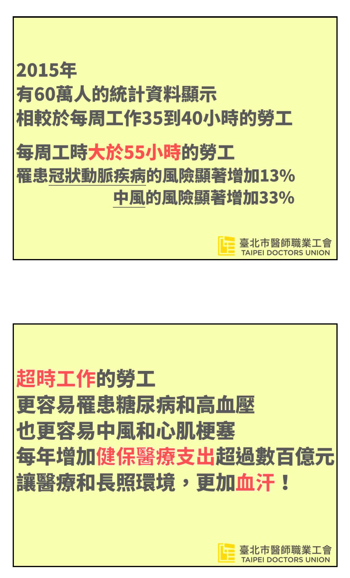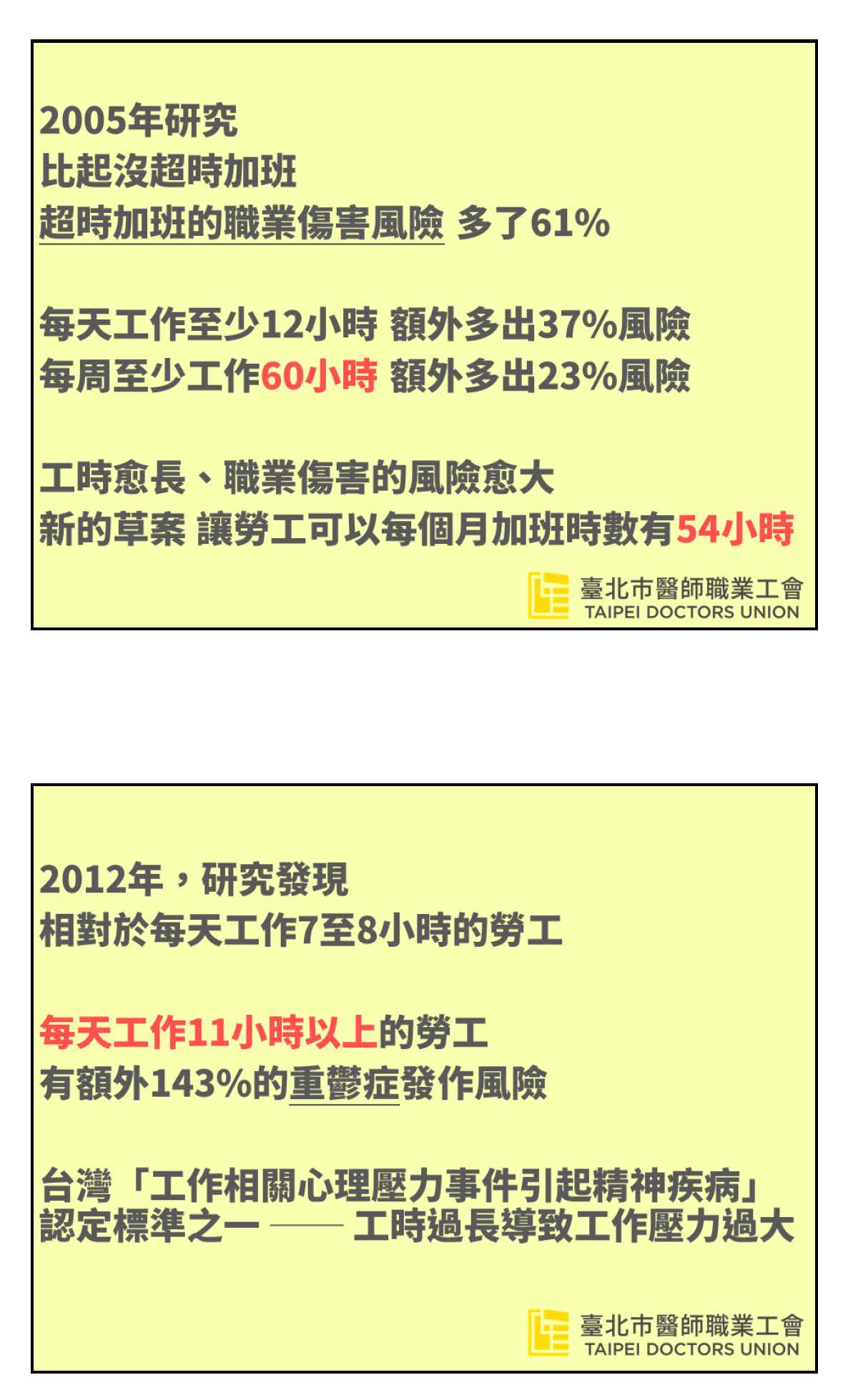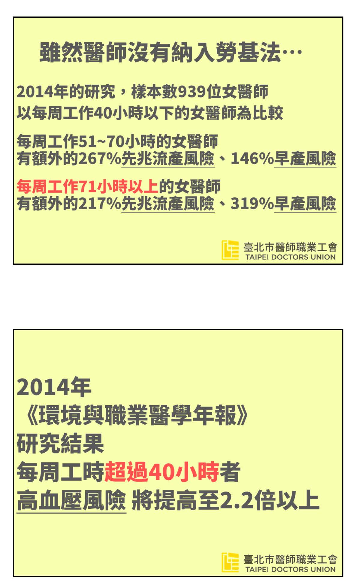 我們要在這裡很痛心的跟大家報告,雖然以現況來說,我們醫師沒有納入勞基法,但我們還是要提,根據2014年的研究,樣本數有939位女醫師,以每週工時40小時以下的女醫師為代表時,發現每週工作51小時到70小時的女醫師,增加了2倍多的先兆流產風險、1倍多的早產風險。當工作時數上升到每週71小時以上時,更額外增加2倍多的先兆流產風險、3倍多的早產風險。現在民進黨政府告訴我們,他們非常重視少子化,所以有少子化辦公室、有大家看了就會想要生的育兒百寶箱,但政府還是想要修正勞基法,這時我們臺北市醫師職業工會忍不住覺得,難道真的是別人的孩子死不完嗎?