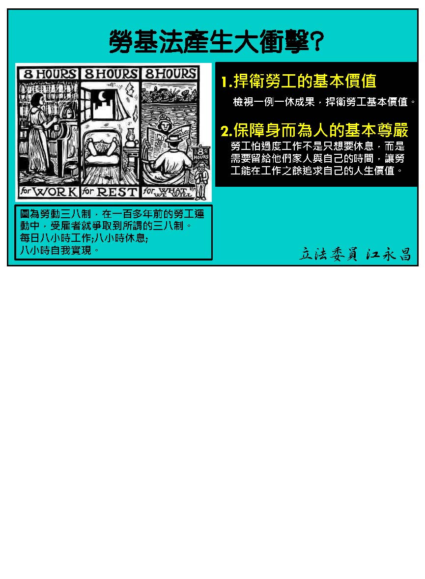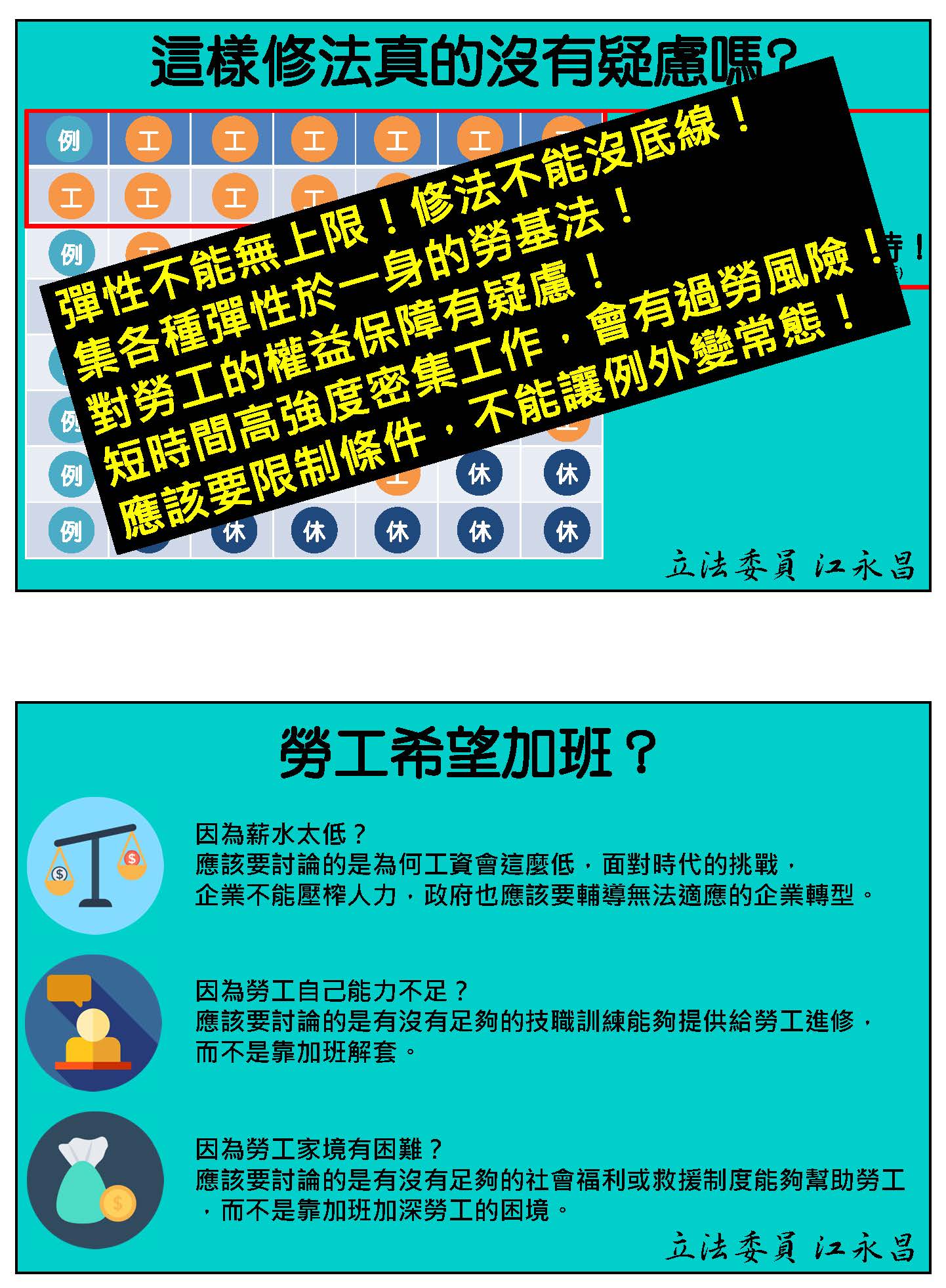 最後我要在這裡說,從去年修法到現在,我真的語重心長的講一句,我沒有針對任何人,也不分藍綠,希望在立法院討論時,有些人在這裡說要捍衛勞工、保障勞動條件、希望勞動權能夠提升、給勞工好一點的環境,但是出去外面面對雇主、資方、企業主的壓力時又說,勞基法一例一休都沒有給企業彈性,害得企業都受不了,這樣兩方衝擊,沒有人講一點點的好話,即使不夠好,但它至少還是有一點點的進步,還是有幫忙到勞工有一點點好的保障及條件,如果這次要再面臨行政院五大面向,希望這次能夠真正正視這個問題,我們來想一下,週休二日難道有錯嗎?不要老是說勞工不加班就是怕過度工作、沒有休息,是這樣嗎?其實不是!週休二日至少有一天可以陪伴自己的家人。對雇主、對資方,我們當然要負責,畢竟是做人家的工作,可是我們自己的人生規劃、我們自己的家庭也很重要。另外一件事,週休二日其中一天陪家人,另外留一天讓自己有機會去進修、有機會增進自己其他方面,也許現在的工作做得不是很有興趣,或者覺得自己還有某方面不足,那也可以保留自己一點時間,讓自己有機會為自己翻轉人生,而不是永遠坐在最底層付出勞動,所以我覺得進修也是應該給的勞動權,謝謝。