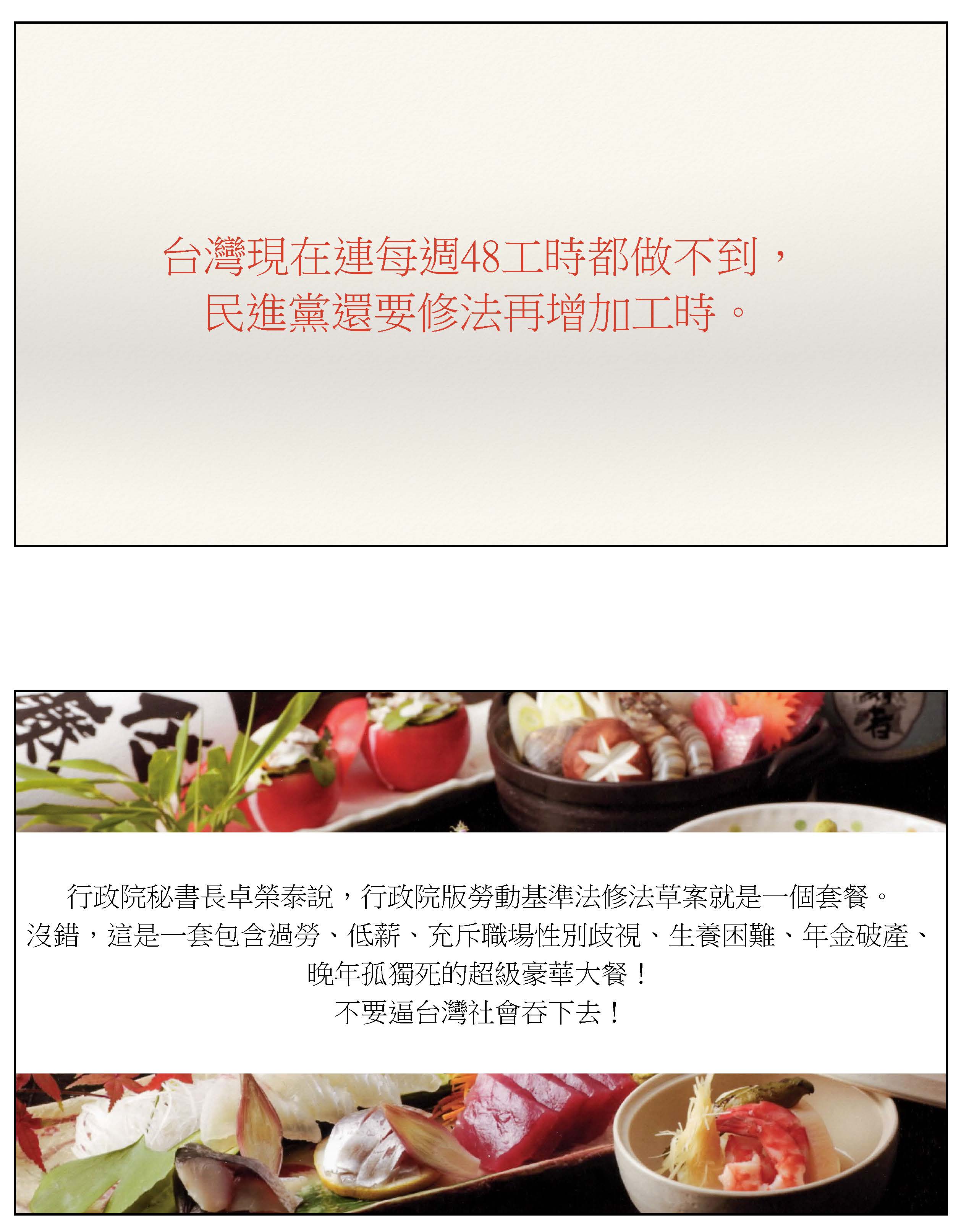 我們要強調的是,行政院卓秘書長說行政院版勞基法草案就是一個套餐,沒錯,這是一個套餐,這是包含過勞、低薪、充斥職場性別歧視、生養困難、年金破產、晚年孤獨死的超級豪華大餐!拜託,請官員,請民進黨,不要逼臺灣社會吞下去。謝謝。