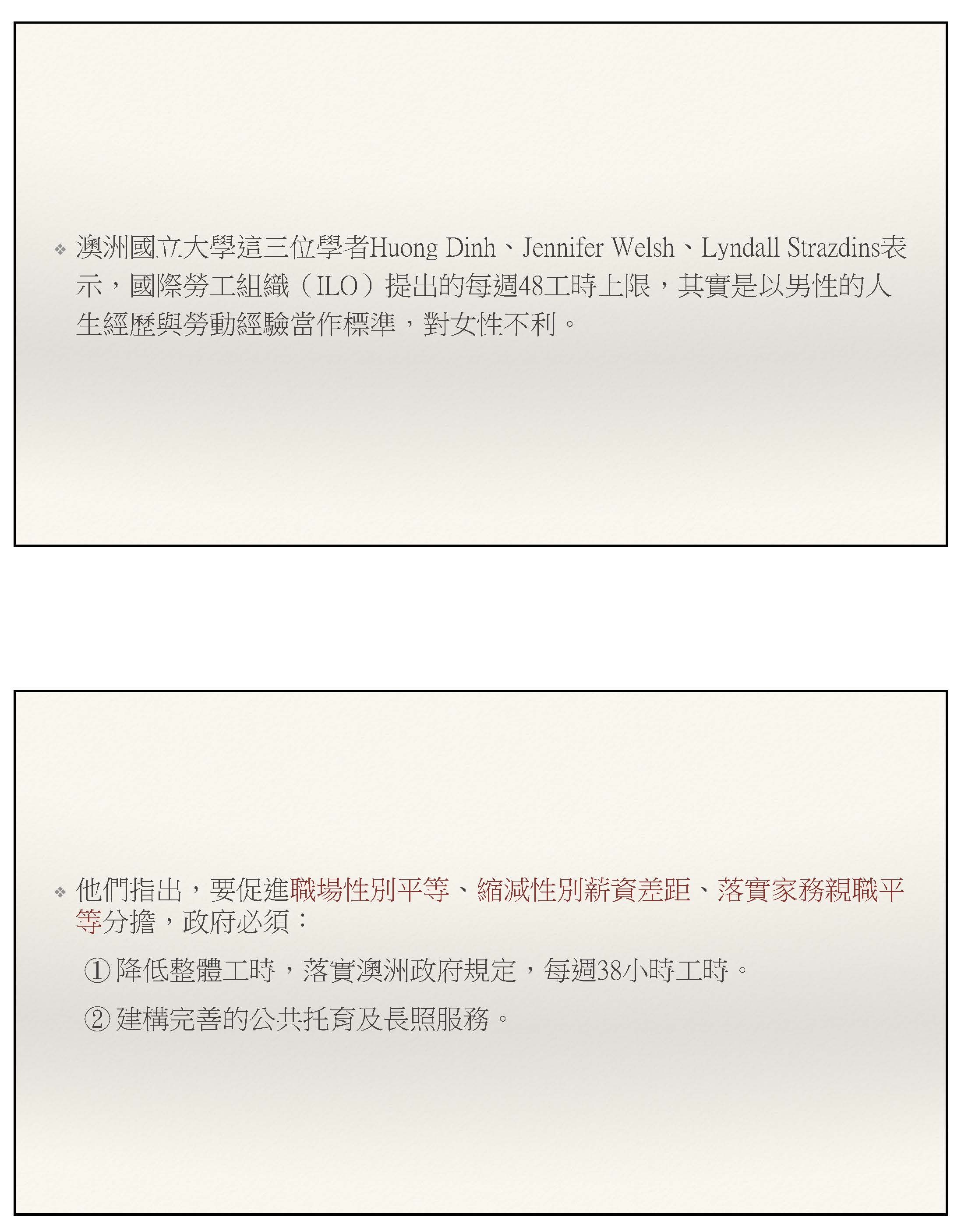 這三位學者提出一些具體的政策建議,以他們研究的數字發現,國際勞工組織提出每週工作超過48小時就叫做超時工作,其實48小時還太高了,因為48小時是以男性的生命歷程與勞動經驗做為標準,這樣的高標準對女性是不利的。他們指出,如果要促進職場性別平等,縮減性別薪資差距,落實家務與親職的平等分擔,政府必須要做二件事,第一個是降低整體工時。他們提出的數字是澳洲政府現在規定每週工時上限是38小時,他們說澳洲還有很多勞工每週工作超過38小時,他們覺得這是不對的,所以澳洲政府應該把每週工時降到38小時。第二個是建構完善的公共托育及長照服務。