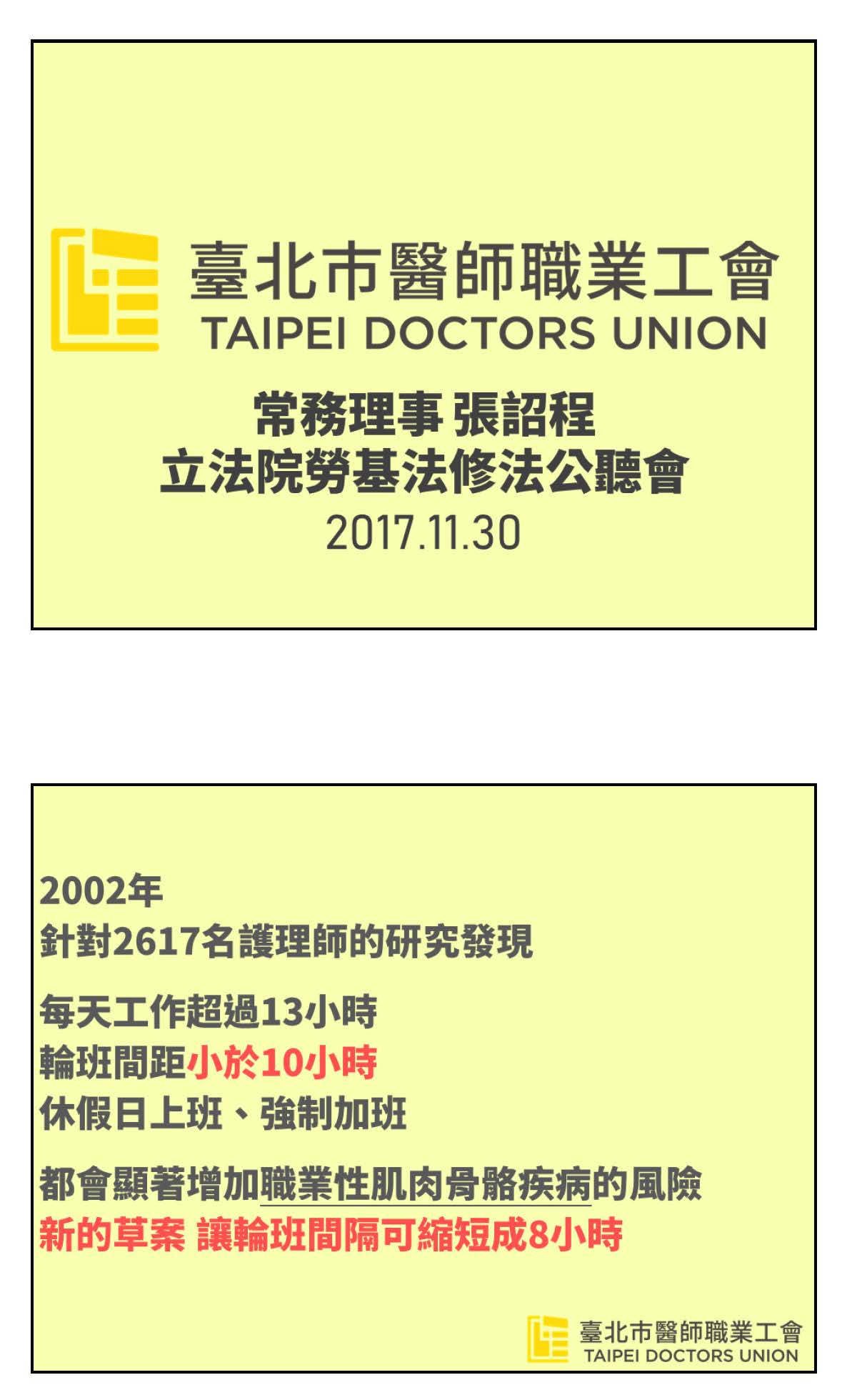 張詔程常務理事:主席、各位委員。我是台北市醫師職業工會常務理事張詔程,同時,我也是一位內科住院醫師。今天我要代表台北市醫師職業工會將近100位的主治醫師、住院醫師們,運用我們醫學專業上的知識來告訴大家,我們反對這次行政院所提出勞基法的修正草案的理由。首先,在我進行說明之前,我要澄清一件事情,昨天有另外一位醫師公會全聯會的代表說,現行勞基法讓許多的診所感覺加班費的負擔很大,導致有很多的診所週六、週日無法提供民眾相關的醫療服務,從而降低台灣的醫療的水準。當然,我們要在此提出澄清,事實上,這是一個錯誤的說法,因為現行勞基法並未規定例假日和休假日要排在星期六、星期日,如果民眾在星期六、星期日無處就醫的話,那是診所自己的決定,與勞基法並沒有關係,而且大部分的醫師都是受僱醫師,也都是勞工。台北市醫師職業工會和所有納入勞基法的基層醫護人員站在一起,我們也和台灣的勞工朋友站在一起,所以我們希望外界也不要認為醫師公會全聯會的發言就是整個醫界的意見。
