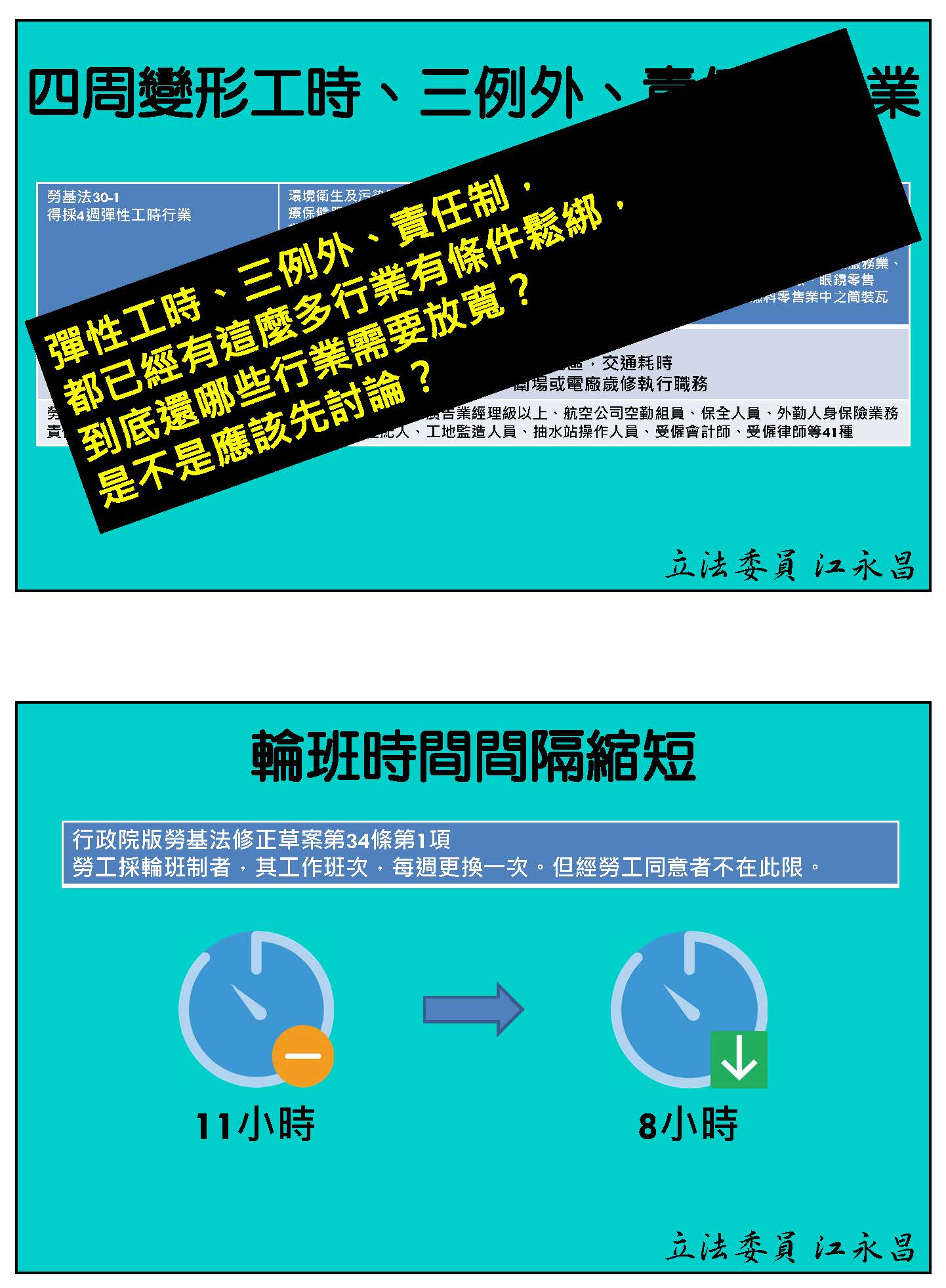 勞基法第三十四條規定,如果是輪班制的工作,經雇主、勞工同意,輪班次數就不一定是一週輪一次,有可能在一個週期之中換個兩次或三次,日班變夜班、夜班變午班,換來換去,假如這個條文還存在的話,我們再增訂一個條文規定,週期與週期之間、間隔休息時間可以不用11個小時,可以壓縮到8小時,然後配合現行條文,讓它一週來個兩、三次的輪班間隔的改變,那請問勞工到底要怎樣好好的工作啊?休息時間不足或夜間工作對他的身體是無窮盡的傷害啊!