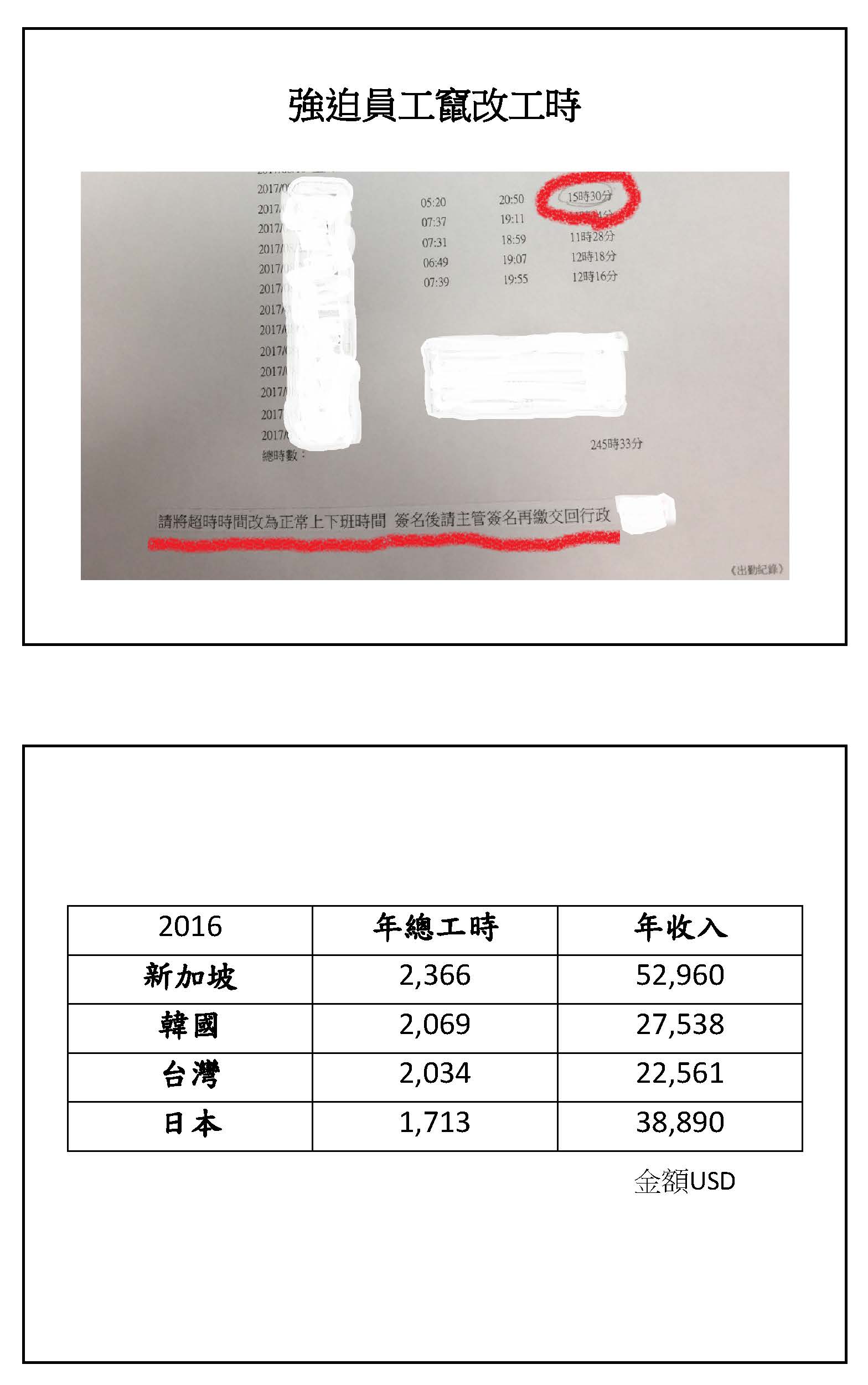 我再給各位看一張最可怕的東西,這是2017年某一家公司的員工寄給我的,他上班打卡時間是15小時30分鐘,有沒有超過上班12小時的限制?有,違法!如果被抓到怎麼辦?罰錢。假使這間公司連續犯3次,要罰多少?30萬元,這次加重罰45萬元,如果它連續犯錯第5次,處罰100萬元。這一張就可以讓這個老闆罰100萬元,結果人資貼了一張紙條寫著「請將超時時間改為正常上下班時間,簽名後再交給主管。」這是什麼意思?這個員工敢不簽嗎?他帶著8個膽子敢不簽?如果他不簽就沒工作了,他簽了之後,既得利益者的老闆掠奪勞方的工作所得,就是這一張!這樣的事情在傳播業界、在記者這一行每天都在發生,非常離譜!我們來看他的工作時間多長,這個月打卡時間總共245小時,我問他有沒有拿到加班費?沒聽說過。在我們這一行,加班費跟鬼一樣,大家都聽過卻沒見過,真的沒見過。