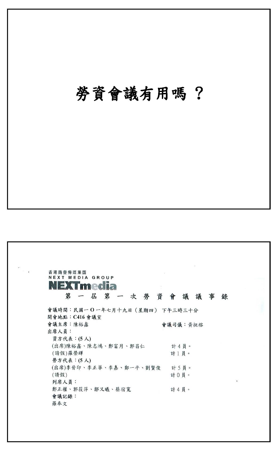 我現在開始講,第一個,過去我們勞基法有以下三點,變形工時、延長工作時間、女性夜間工作要經過工會跟勞資協議,通過以後才能夠執行。但是勞資會議有沒有用?勞資會議有沒有用?今天我們要求要把鬆綁7休1,加班單月工時上限從46小時提到54小時,還有輪班11小時縮短為8小時,這三項再交給工會跟勞資會議來決定,勞資會議有沒有用?我告訴你勞資會議有沒有用,這一次的勞資會議是在101年7月,壹電視開的勞資會議,我有參加,各位有沒有看到?我的名字是在這邊。