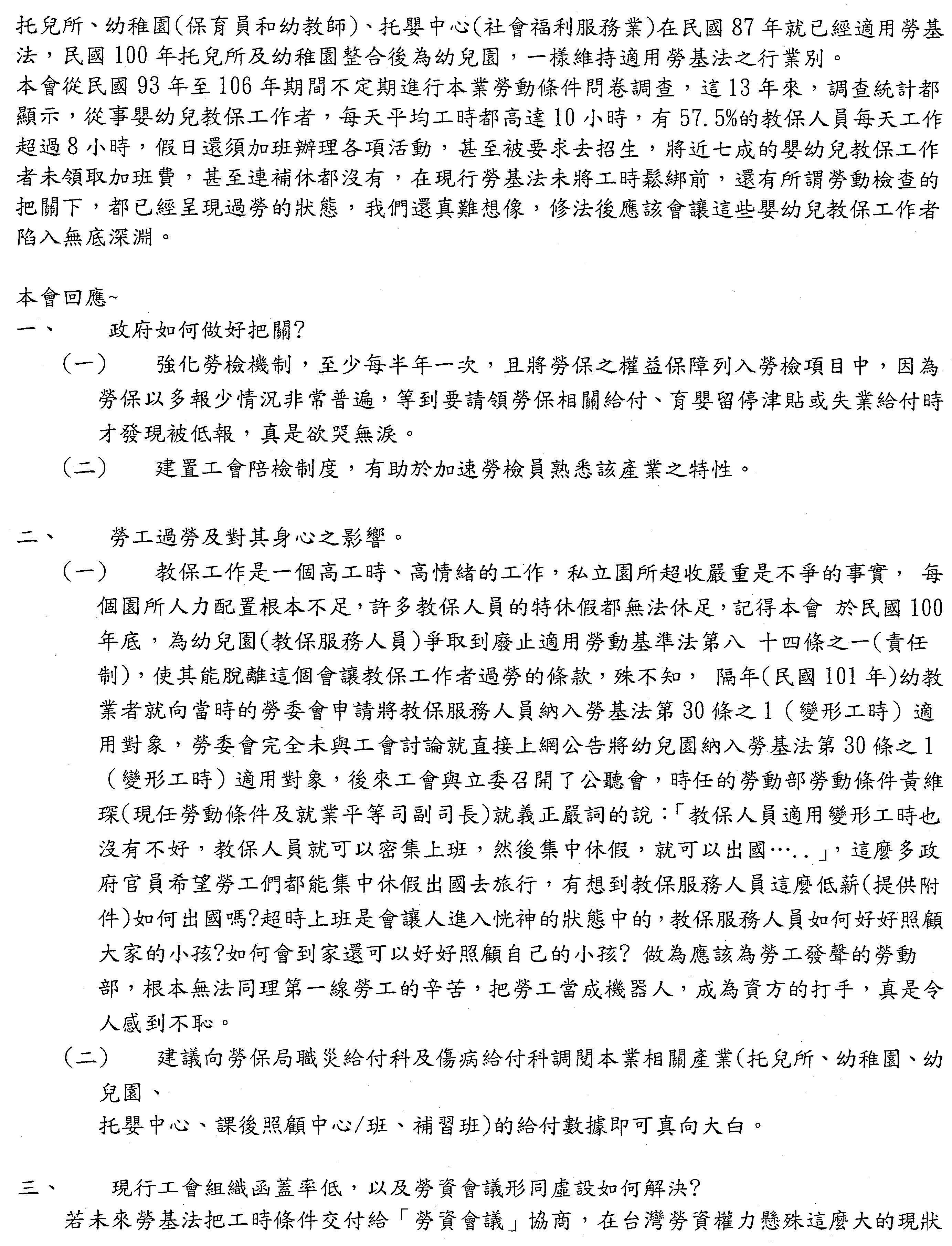 以上這些都是我們必須要做的,至於今天有代表提出來,在幼托部分主席交代我們來做回應,其實幼托並不在第三十條之一的範圍之內,它跟其他產業所適用的都一樣,所以仍適用勞基法第四十九條到第五十二條的規定。女性工作人員在懷孕或者是哺乳的時候仍然有特別的規定,就是回歸到勞基法,甚至醫療保健服務業適用第三十條之一的規定,如果女性工作人員在懷孕或者哺乳的時候,不能夠讓他們在夜間工作,一樣回歸到第四十九條到第五十二條的規範而受到限制。整個來講,如果有違規的情形,我們會配合勞動部一起來督考。以上。