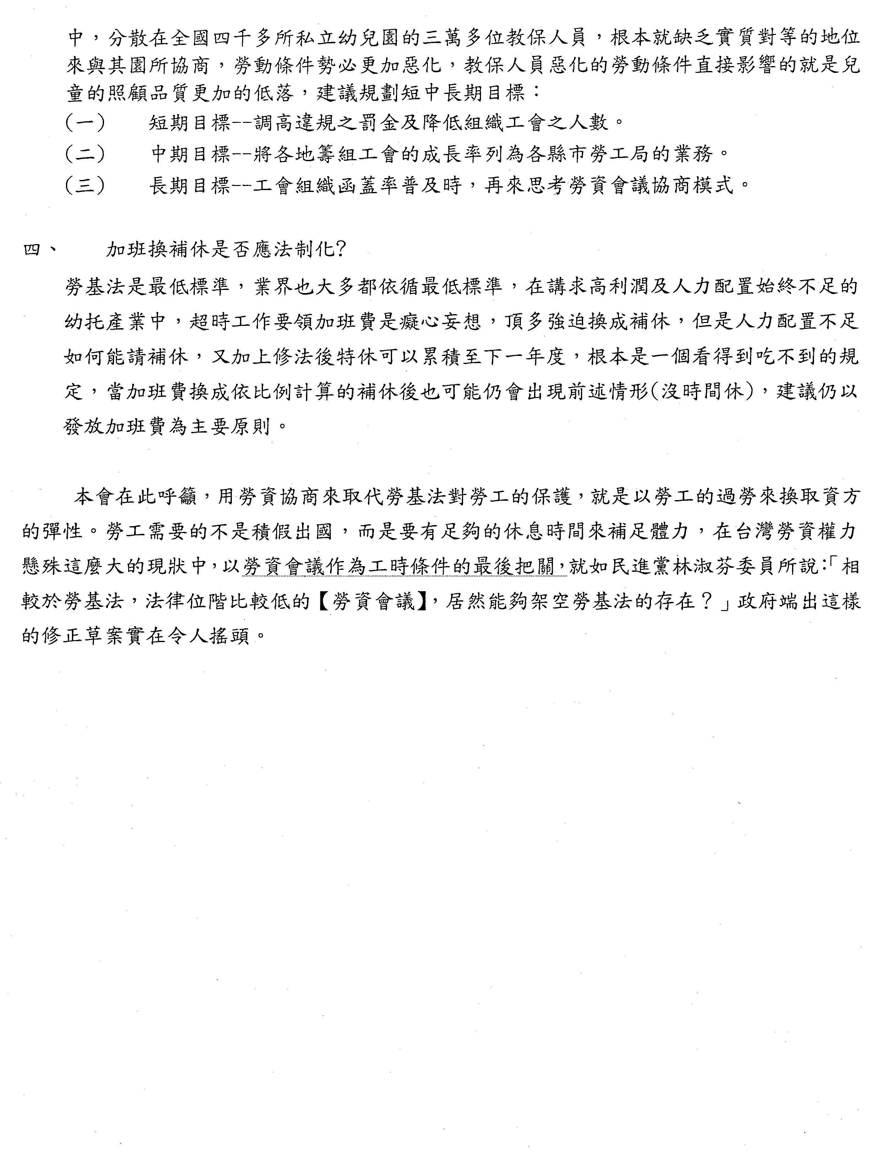 此外,方才教保人員也反映,外界常誤以為很多時候他們都在休息,其實,小朋友午休時間他們都在待命,換言之,他們通常都會利用這段時間工作或處理一些事務;同時,他們也談到積假出國的問題,之前行政院發言人也提到這件事情,讓外界質疑行政院發言人怎麼會講出這樣的話,教保人員一再澄清他們薪資這麼低,怎麼還能奢求積假出國?其次,若要累積連續假期,特休假的制度就可以處理,稍後與會代表發言完後,行政部門也可以針對這個問題作一回應。