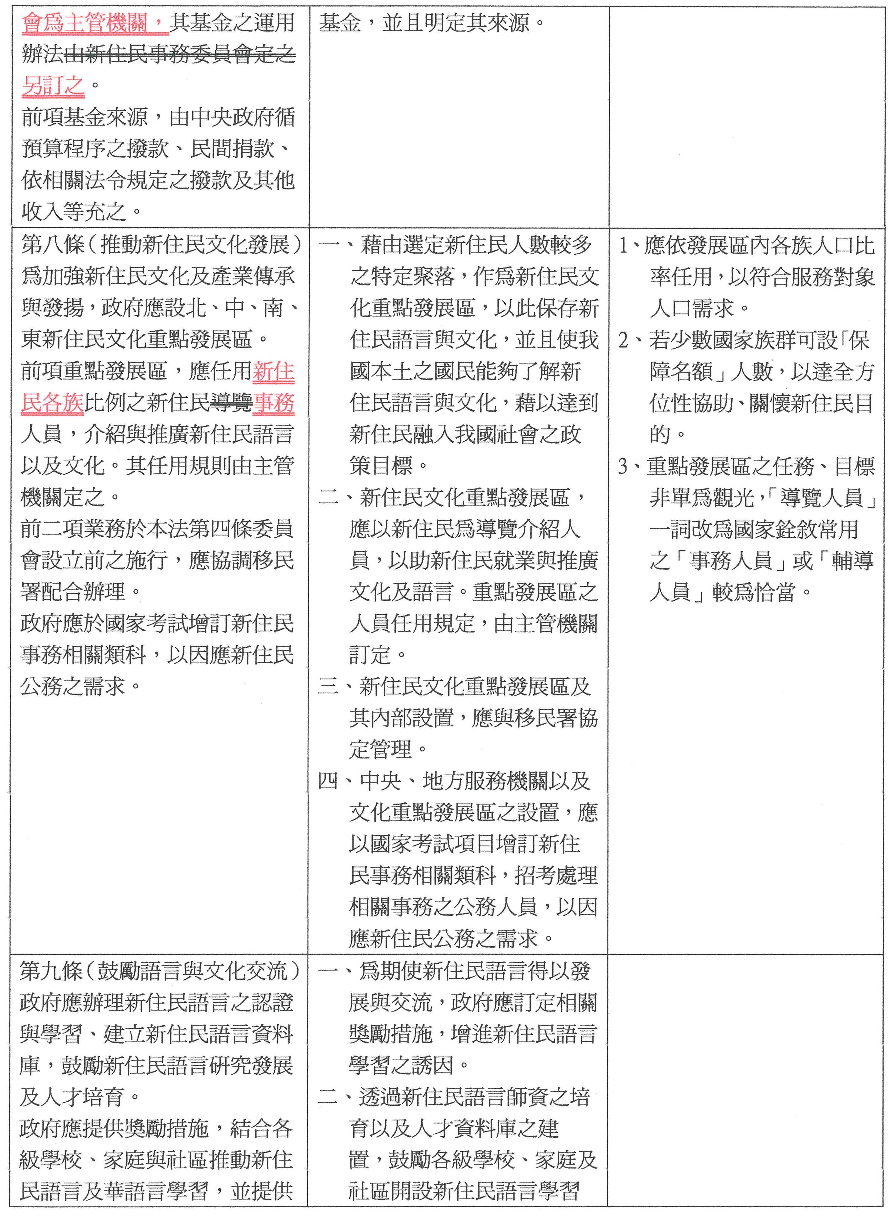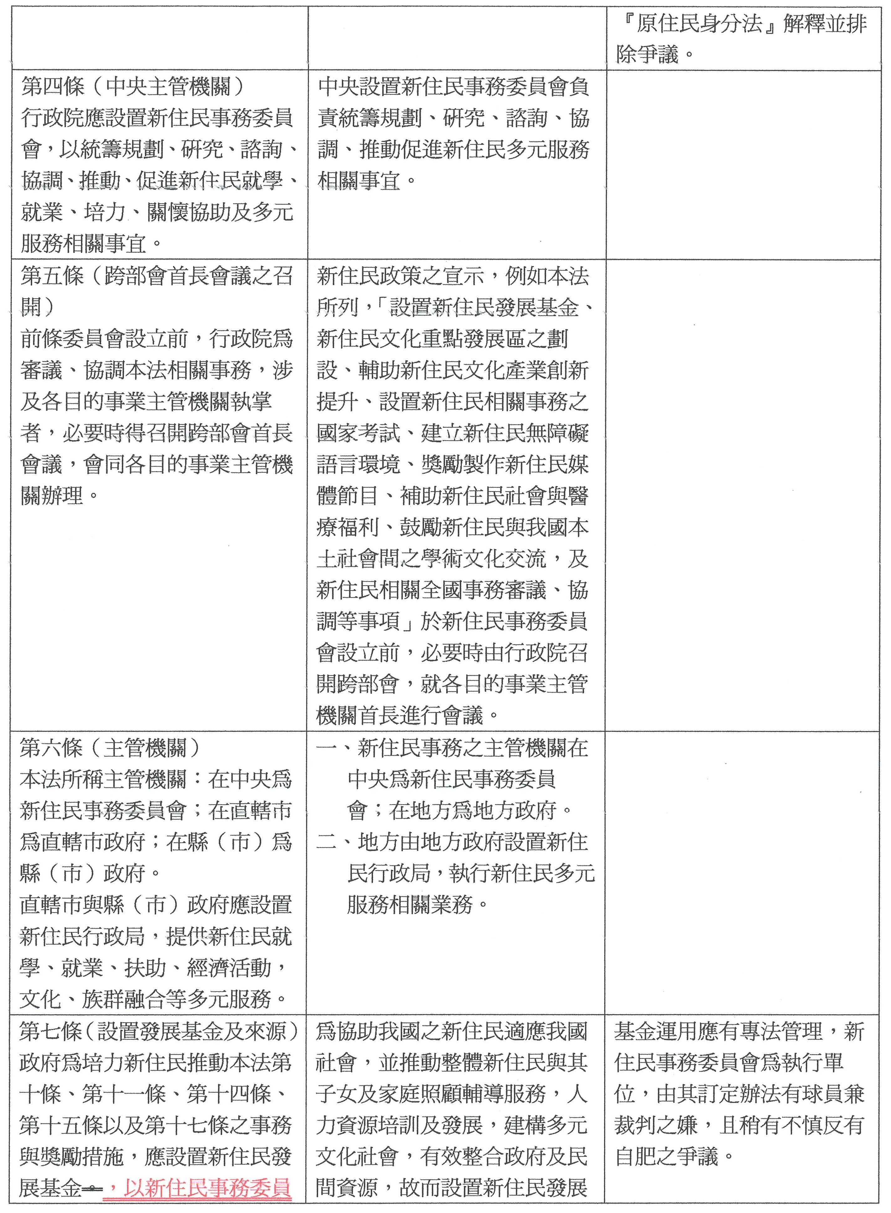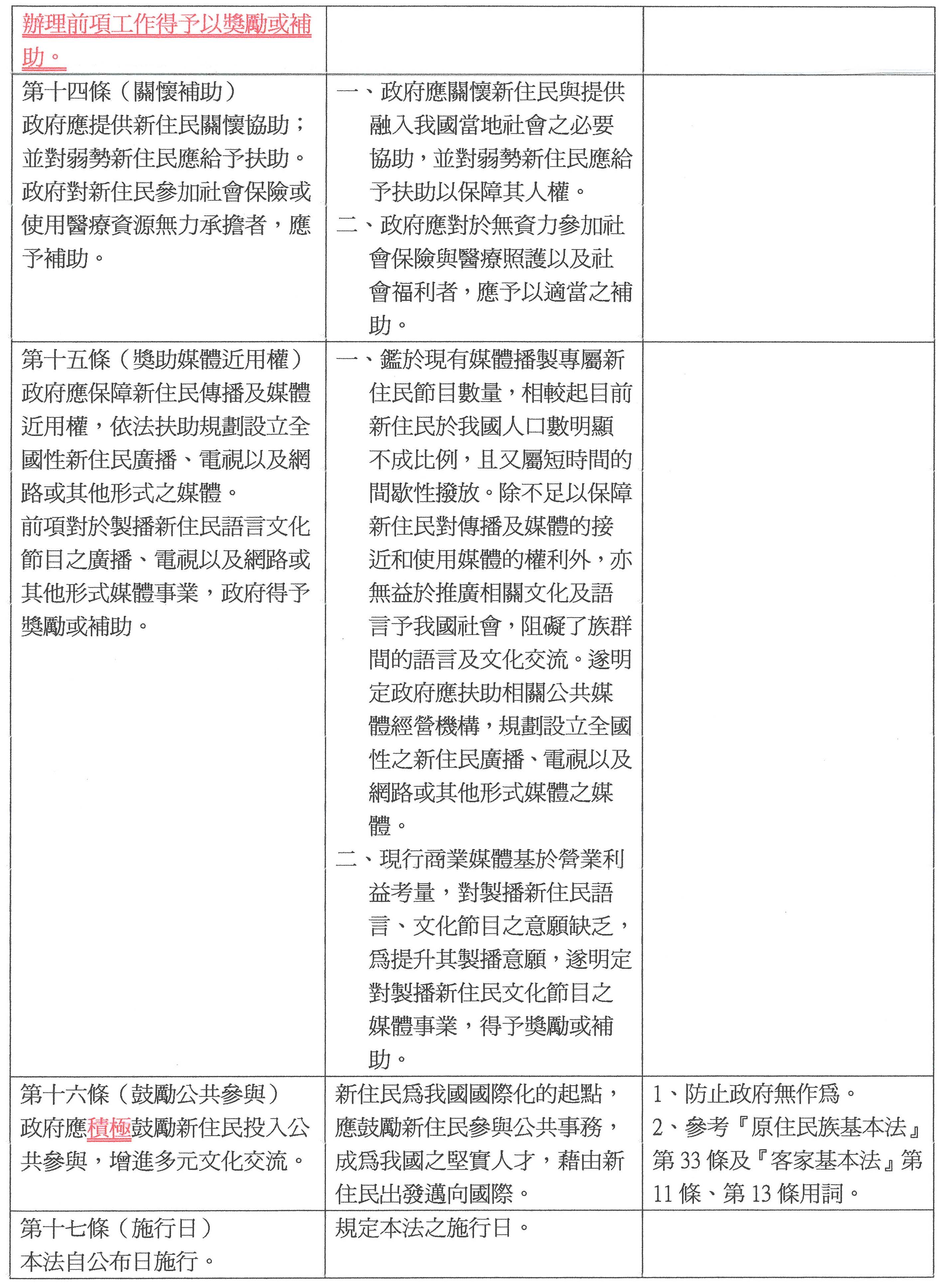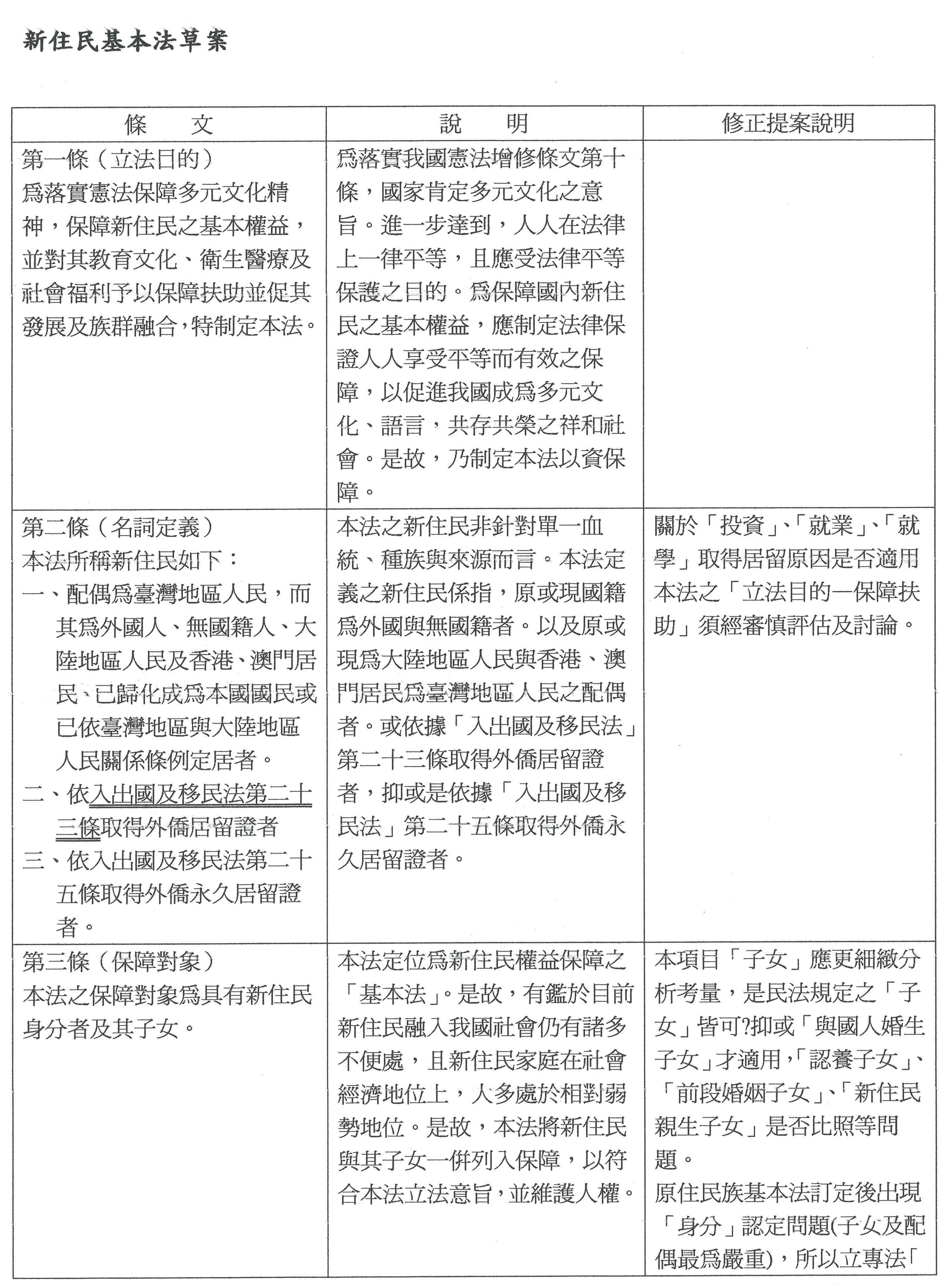 參、有關「新住民基本法草案」,本會尊重立法委員之提案