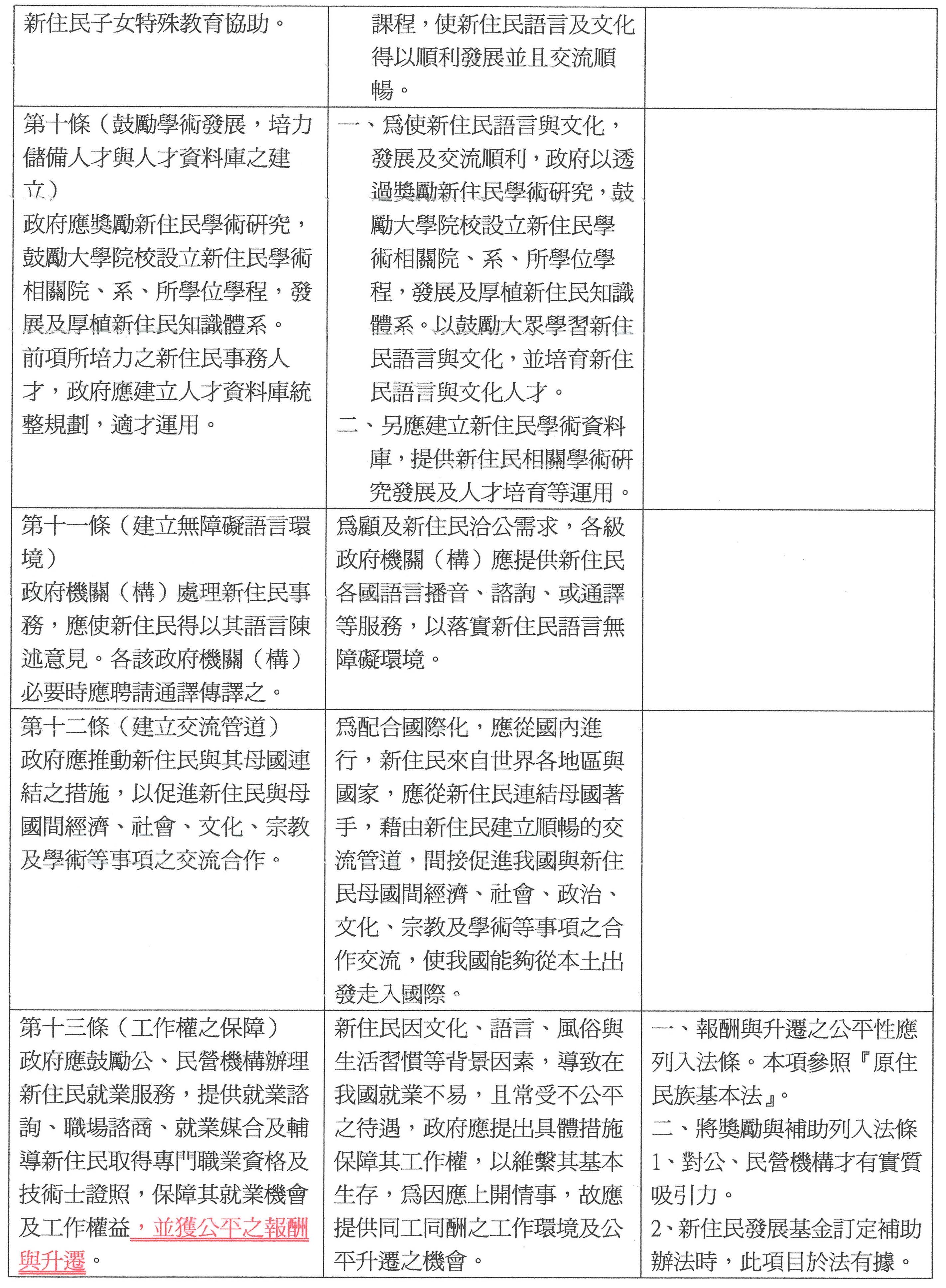 本法除了給予新住民福利措施外,還有兩個重點,那就是新住民的工作權及社會地位的平等,相關規定出現在第十三條,但只是一種宣示性的規定,並沒有充分的保障。其實有關工作權的保障可以參考就業服務法第五條及性別工作平等法的相關規定;至於社會地位的平等,目前新住民身分有可能在社會上受到歧視,所以有關歧視的規定應該出現在法條中,除了我剛才提到的就業服務法及兩性工作平等法之外,性騷擾防治法的相關規定也可以做為立法的參考,也就是應該將哪些基本權利會受到台灣社會不尊重的部分納入新住民基本權的法條中。