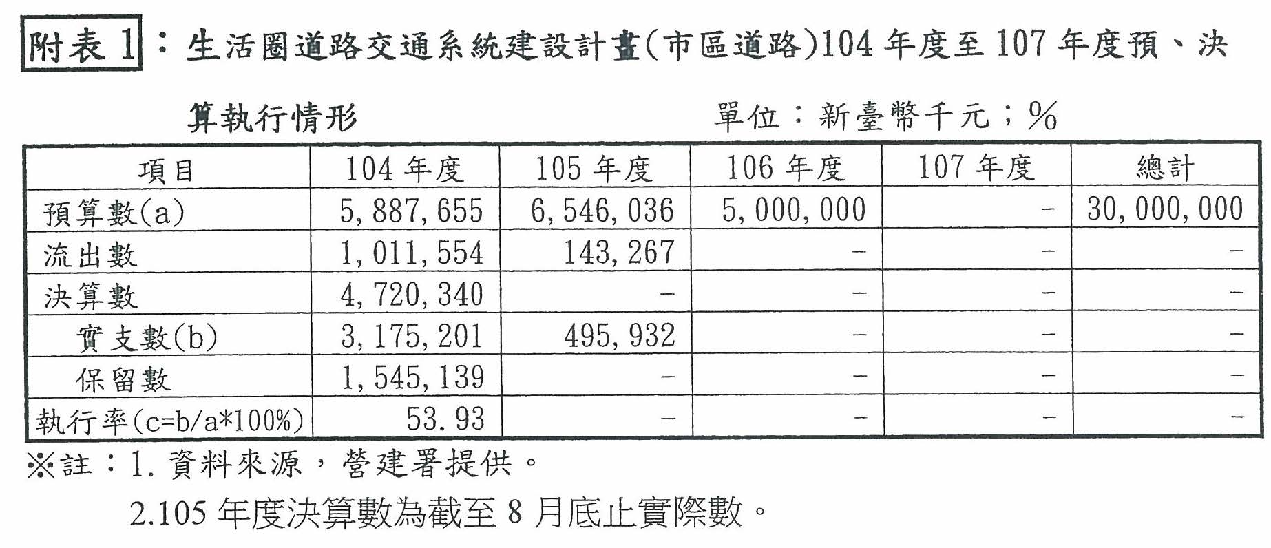 ※註:1.資料來源,內政部96年度至104年度各年度預、決算書及國家發展委員會網站建置之績效管考系統。