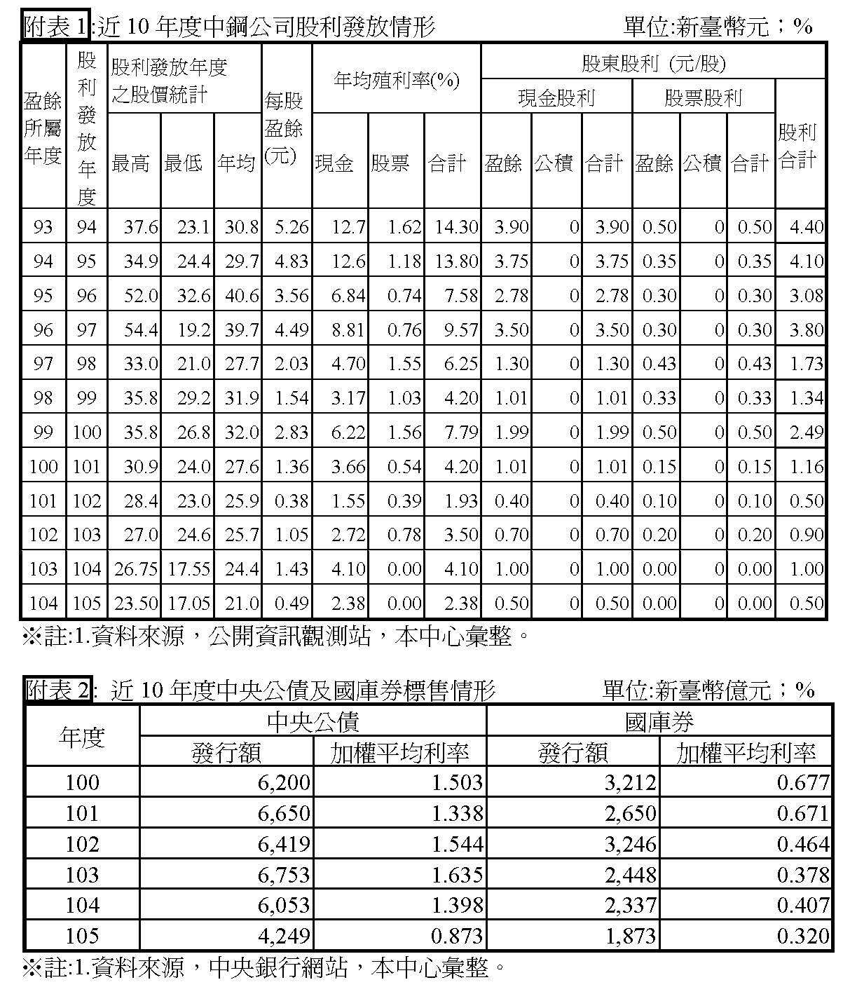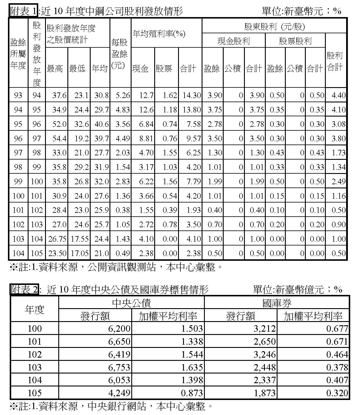 檢視公開資訊觀測站中鋼公司股利分派情形,近10年來各年度每股現金分派金額約介於0.5元~4.4元之間,換算同期間平均股利殖利率約為1.93%~14.30%之間。以106年度預計出售3億4,013萬6,054股換算,每年約可為國庫創造1.7億元至14.97億元之穩定現金流量。反觀近10年來國內金融市場由於資金氾濫,以致於公債發行利率以及國庫券標售利率雙雙呈現走低情勢。以中央政府公債為例,105年度加權平均利率僅有0.873%。國庫券亦雷同,105年度標售利率僅0.32%,均低於中鋼公司近年來股利殖利率水準。因此,爰提案刪除「投資收入」預算數34億0,136萬1千元。