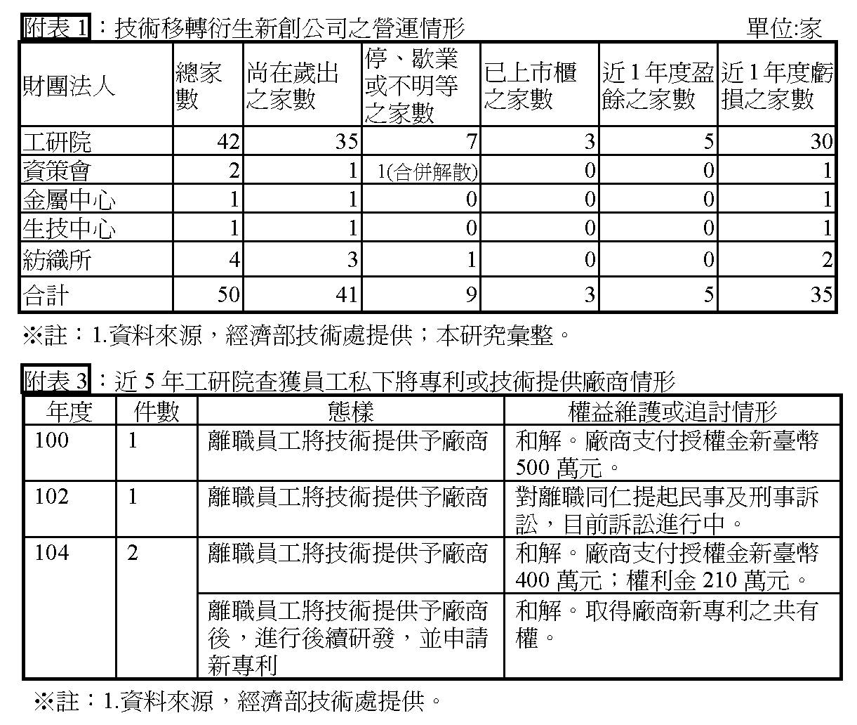 法人科專計畫主要由工研院、資策會、生技中心、金屬中心等法人研究機構推動執行,發展前瞻性、關鍵性之產業技術研發,同時完善研發環境及基礎設施。106年度法人科專計畫編列119億2,966萬4千元,經查:(一)技術移轉衍生之新創公司經營績效不佳,對於產業創新恐難產生示範效果與帶領作用:1.技術移轉衍生新創公司係指研究機構將研究成果技術移轉成立新創公司進行商業開發。一般而言,衍生新創公司之技術商業化模式被認為是最有效之技術移轉方式,藉由建立種子公司方式來誘發相關投資,進而形成產業,以發揮振興產業火車頭之效應。近10年法人科專計畫技術移轉及財產作價計16億6,953萬5千元衍生新創公司。2.經統計,各財團法人接受科專計畫補助僅工研院、資策會、金屬中心、生技中心及紡織所等5家將技術移轉衍生新創公司(詳附表1),衍生之新創公司共計50家,其中41家尚在歲出、停歇或因合併解散者等9家、已上市櫃3家、近1年度為盈餘者5家、虧損者35家,8成5為虧損,顯示經營績效不佳,對於產業創新恐難產生示範效果與帶領作用。(二)技術移轉衍生之新創公司,其技術源自研究機構之研發與智慧結晶,並自研發團隊挖角,惟近年來所配股利繳庫數幾無:1.檢視前揭新創公司,大部分乃自原研發團隊挖角,且移轉人員多擔任該新創公司之董事長、總經理人或工程師等高階職務(詳附表2),惟近3年度所配股利繳庫金額卻幾無。雖然經費投入與獲得收入並非判斷實施成果是否良好之唯一標準,惟在投入與研發成果收入相差懸殊之情形下,仍宜檢討其中問題並加以改善。2.復查以往曾發生研究人員於離職後將過去之研發成果中飽私囊之案例(詳附表3);另移轉之研究人員離職後一定期限之成果產出應是接續原於研究機構服務之研究,若研究人員隱藏具有價值之研究成果,嗣成立衍生公司時提出關鍵技術,恐涉及研究倫理與道德,爰員工離職後歲出秘密防範問題,殊值重視。綜上,衍生公司對於產業創新之貢獻,主要為帶動技術升級與產業規模增長,惟法人科專計畫技術移轉衍生之新創公司經營績效不佳,對於產業創新恐難產生示範效果與帶領作用;另前揭衍生新創公司近年來所配股利繳庫數幾無,雖嗣後售股可產生利得,惟恐難預期。且衍生公司自研究機構研發團隊大量挖角,並多半身居要職,雖然創造技術外溢與人才、技術擴散效果,惟科專計畫之研發經費乃係納稅人共同負擔之公共資源,若未能產生合理回饋,恐形成政府研發資金運用之惡性循環,並招致外界非議,不利科專計畫之長期推動,恐有檢討之必要。為落實本院預算監督,及督促經濟部正視「法人科專計畫技術移轉衍生之新創公司經營績效不佳,對於產業創新恐難產生示範效果與帶領作用」及「新創公司三年來所配股利繳庫數0」之缺失,爰要求經濟部三個月內提出檢討報告及增加「新創公司所配股利繳庫數」之改進措施,向經濟委員會提出專案告。
