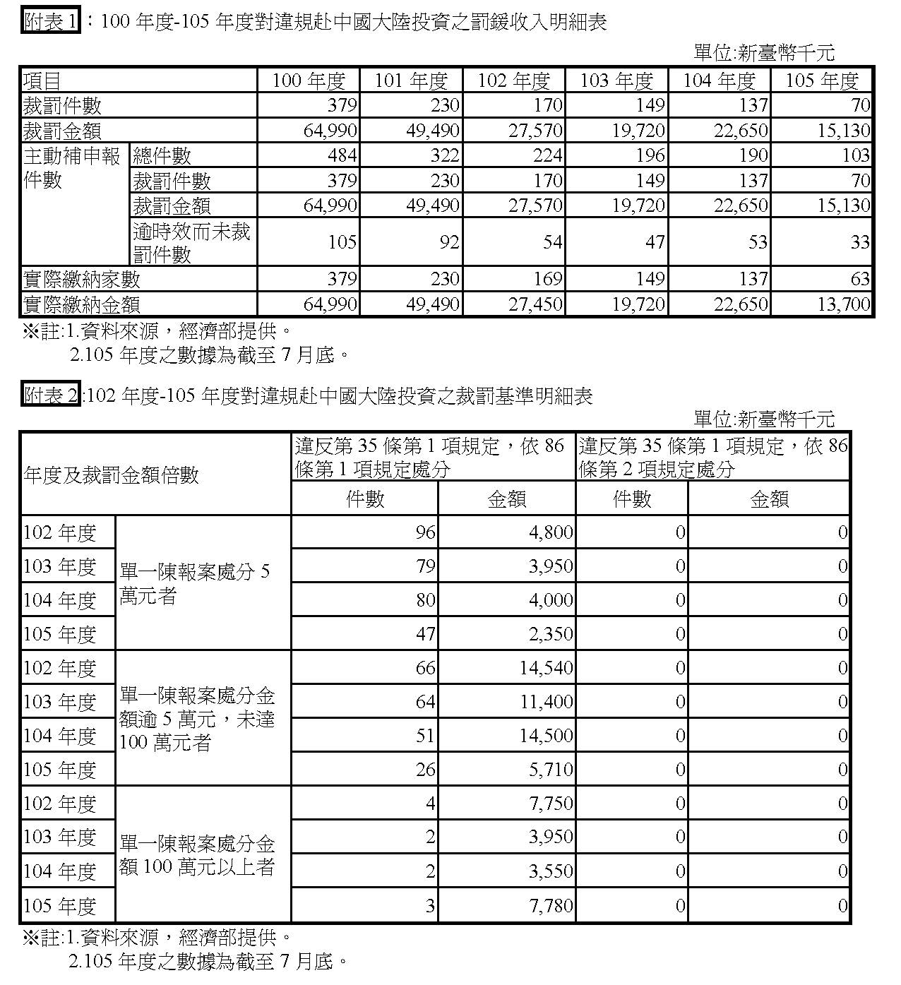 經濟部106年度預算案於「罰款及賠償收入」編列6,851萬元,其中違反臺灣地區與大陸地區人民關係條例第35條及第86條第1、2項各款情形之罰鍰收入,以852件,每件5萬元計算,計4,260萬元。經查:(一)裁罰對象多為投資人自動補申報者,缺乏主動稽查功能:查100年度至105年7月底止對違規赴中國大陸投資裁罰件數分別為379件、230件、170件、149件、137件及70件;惟如附表1所示,裁罰案件均為投資人自動向經濟部投資審議委員會陳報違規事實而裁罰,主管機關缺乏主動稽查功能。(二)缺乏主動稽查功能,對於國家安全有不利影響之重大違規投資案,恐難達嚇阻作用:按在大陸地區從事投資或技術合作之產品或經營之項目,主要分為禁止類及一般類。查102年度至105年7月底止對違規赴中國大陸投資之裁罰對象多為違反從事一般類項目之投資或技術合作,依前揭條例第86條第1項規定處分者;並無違反從事禁止類項目之投資或技術合作,而依第86條第2項規定處分者(詳附表2)。惟禁止類項目乃係基於國防、國家安全需要、重大基礎建設及產業發展考量,而禁止前往大陸地區投資。然由於缺乏主動稽查功能,裁罰對象主要為違規情節輕微且投資人自動補申報者,對於國家安全有不利影響之重大違規投資案件,恐難達嚇阻作用。(三)部分補申報案件因逾行政罰法裁處權之行使期限而無法裁處:依行政罰法第27條第1項規定,行政罰之裁處權,因3年期間之經過而消滅。查自100年度至105年7月底止主動申報違規赴中國大陸投資因逾3年而不裁罰之案件數計有384件(詳附表1),以每件5萬元計算,計1,920萬元,因逾行政罰法裁處權行使期限而無法裁處。綜上,為維護經濟之穩定及國家安全,對於臺商在中國大陸投資或技術合作,而影響國家安全及經濟發展,自應禁止,以杜其弊。惟經濟部對於違規赴中國大陸投資缺乏主動稽查功能,爰對國家安全有不利影響之重大違規投資案件,恐難達嚇阻作用。基此,為有效控管不利影響之重大違規投資案件擅赴大陸投資,經濟部應鎖定對國內產業核心競爭力具有重大影響,可能導致國內核心技術移轉或流失;或對國家安全有不利影響之重大違規投資案件,建立主動稽查機制並加強查核。