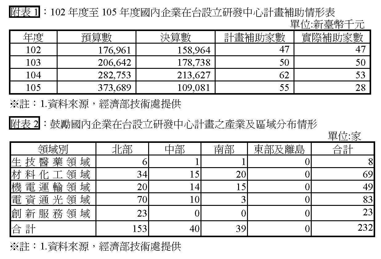 經濟部技術處106年度預算案於「科技專案」項下編列166億8,661萬8千元,其中業學界科專計畫預算編列29億4,664萬1千元,包括:A+企業創新研發淬鍊計畫(前瞻技術研發計畫、整合型研發計畫、鼓勵國內企業在臺設立企業研發中心計畫、全球研發創新夥伴計畫、其他專案類計畫)及產學研價值創造計畫等。經查:(一)鼓勵國內企業在台設立研發中心計畫補助情形:為鼓勵國內企業研發創新,並將企業核心研發成果留於台灣,經濟部技術處自90年開始推動「鼓勵國內企業在台設立研發中心計畫」,通過計畫申請之企業,每年度最高可獲得政府500萬元補助,計畫執行期間以3年為限,希望藉由此計畫之執行,幫助達成發展高科技與高附加價值產業之目標願景。查該計畫102年度至104年度決算數分別1億5,896萬4千元、1億7,873萬8千元、2億1,362萬7千元;補助家數分別為47家、50家、53家。(二)鼓勵國內企業在台設立研發中心計畫允宜避免產業及區域發展差距擴大:1.查國內企業在台設立研發中心計畫截至105年7月底止,分布之各產業領域為電資通光領域83家(占35.78%)、材料化工69家(占29.74%)、機電運輸49家(占21.12%),偏重在電資通光領域。另分布區域以北部153家(占65.95%)居冠、次為中部40家(占17.24%)、南部39家(占16.81%)、東部及離島為0,存在明顯區域差距。2.若再細分各產業之區域分配情形,創新服務領域之區域差距最為明顯,全部集中在北部,恐使我國服務業區域發展嚴重失衡之現狀,更為雪上加霜;另電資通光領域超逾8成集中在北部(占84.34%)、生技醫藥亦高達7成5集中在北部。3.鼓勵國內企業在台設立研發中心計畫執行結果存有產業及區域差距,究其原因雖主要為產業群聚效應,惟產業分布偏重在電資通光領域,恐導致我國產業結構過度集中之趨勢更形嚴重。另南北、東部及離島資源分配不均之問題由來已久,人口與工商產業均集中於北部地區,產業與經濟活動之磁吸效應,人才、資源與資金往北部區域移動,鼓勵國內企業在台設立研發中心計畫執行結果之區域差距,恐導致區域之產業發展更加失衡。綜上,鼓勵國內企業在台設立研發中心計畫執行結果偏重在電資通光領域,並集中北部區域,長期以往,將使產業結構及區域發展更加失衡。為落實本院預算監督,及督促經濟部正視「國內企業在台設立研發中心計畫執行結果存有產業及區域差距,將導致區域之產業發展更加失衡」之缺失,爰要求經濟部再三個月內提出之檢討報告及改進措施,向經濟委員會提出專案告。