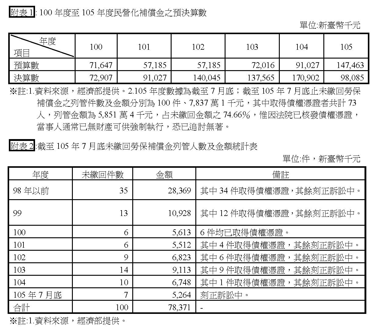 經濟部106年度預算案於「雜項收入─收回以前年度歲出」編列3億4,968萬5千元,其中收回以前年度民營化專案精簡給付之保險補償金等1億4,768萬5千元。經查:(一)補償金發給依據:1.事業機構專案精簡(裁減)要點處理原則第8點規定略以:專案精簡之退休、資遣或離職人員,於退出原參加之公教人員保險(以下簡稱公保)或勞工保險(以下簡稱勞保),除符合規定得請領公保養老給付或勞保老年給付者外,有損失之公保或勞保已投保年資者,比照公教人員保險法第14條或勞工保險條例第59條規定之給付標準,補償其損失。2.公營事業移轉民營條例第8條第4項規定略以:辦理離職及資遣者,有損失公保養老給付或勞保老年給付者,補償其權益損失;移轉民營時留用人員,如因改投勞保致損失公保原投保年資時,應比照補償之;其他原有權益如受減損時,亦應予以補償。(二)補償金追繳依據:1.公營事業移轉民營條例第10條規定略以:依本條例領取公保、勞保補償金之從業人員,如再參加各該保險並請領養老或老年給付時,承保機構應代扣原請領之補償金。2.事業機構專案精簡(裁減)要點處理原則第8點規定略以:參加專案裁減並領取勞保補償金離職人員,於其將來再參加各該保險領取養老給付或老年給付時,應繳回原補償機關或原事業主管機關;其所領之養老或老年給付金額較原補償金額低時,僅繳回與所領之養老或老年給付同金額之補償金。(三)取得債權憑證之列管金額5,851萬4千元,恐已追討無著:1.經查該部100年度至104年度收回以前年度民營化專案精簡給付之保險補償金分別為7,290萬7千元、9,102萬7千元、1億4,004萬5千元、1億3,756萬5千元及1億7,090萬2千元,概呈遞增趨勢。綜上,參加民營化專案裁減並領取勞保補償金之離職人員,於再參加勞保領取老年給付時,應將原領之勞保補償金繳回,惟截至105年7月底止未繳回並已取得債權憑證者之列管金額高達5,851萬4千元,確認已追討無著。為落實預算監督,爰要求經濟部查明為何「民營化專案精簡給付之保險補償金」仍有上百件,金額高達1億4,768萬5千元未能追回,爰要求經濟部針對「民營化專案精簡給付之保險補償金仍有上百件,金額高達1億4,768萬5千元未能追回」提出檢討報告與補救措施,向經濟委員會提出專案報告。