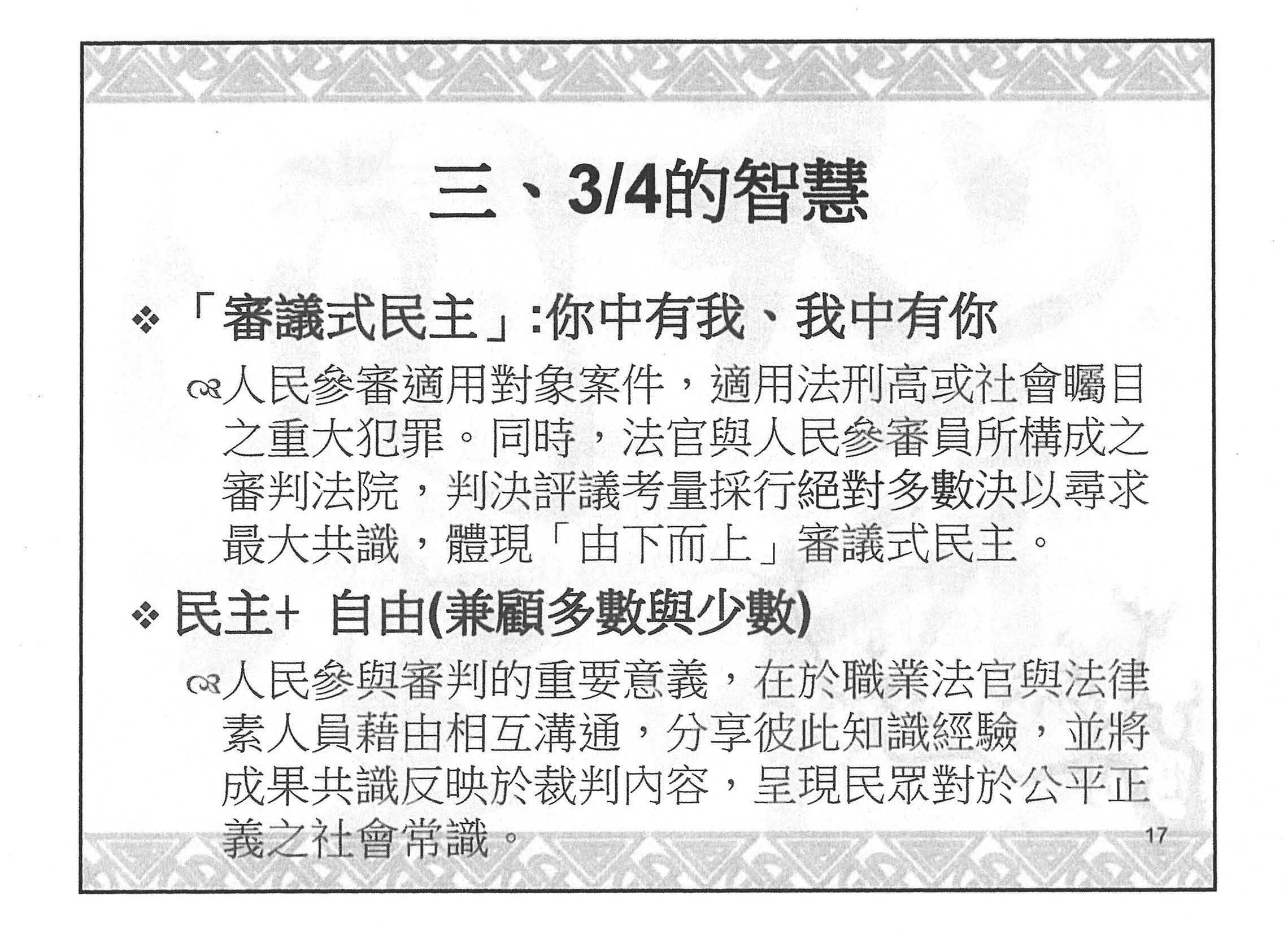 接下來我要講的一些話,是我對於目前一般國民待人處事的看法,等於是一個心性的軟體。數千年來以中華傳統文化中之儒家思想為主流的固有倫理道德規範,近年來因受政黨輪替,統獨之爭,族群對立,去中國化而趨本土化。我並不是說這個不好,我只是講現實。老中青世代觀念代溝、轉型正義理念,兩黨政治機制失衡,及法治修養並未紮根落實等影響,已導致人們非但不能依法生活,而且禮教淪喪,迷航人海,違法脫序之亂象叢生,國人之是非觀與價值觀丕變,待人處事孰是孰非,孰優孰劣,均陷於混淆吝亂之狀態,如是人民之心性軟體,欲寄予陪審制之獨立判斷是非善惡之重任,有如緣木求魚。此時此刻,個人寄望在目前未改革之前,有識之士,也唯有暫且仰賴廉能睿智,守正不阿的法官們,守護司法公平正義之最後一道關卡,始克有濟。是以當下如貿然採取陪審制,並不適當。毋寧我們可以將陪審制度做為司法改革的長程目標,短中程則可先採國民參審制度,以為過渡,俾資順應國情,免滋南淮北枳之憾,消化不良,而有不好的結果。至於現階段法律人(不含法官)及非法律人參與參審團之比例,如以總數6人為例,則至少應以3比3為宜,以後再視實踐結果及國人法治修養提升之程度,再行修法加重非法律人之比例,庶得溫和漸進,以維審判品質。也就是一共9人,3位職業法官,3位法律人,3位一般未學法的平民百姓。