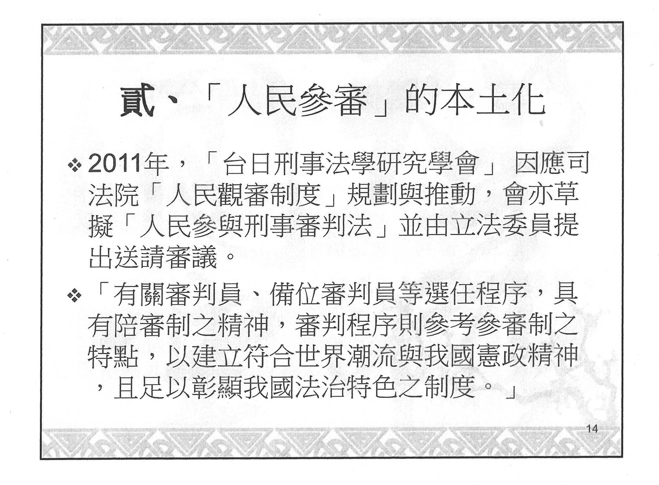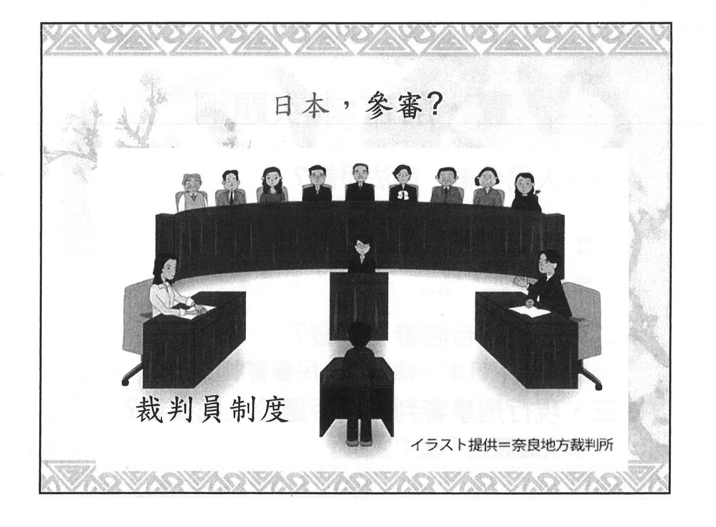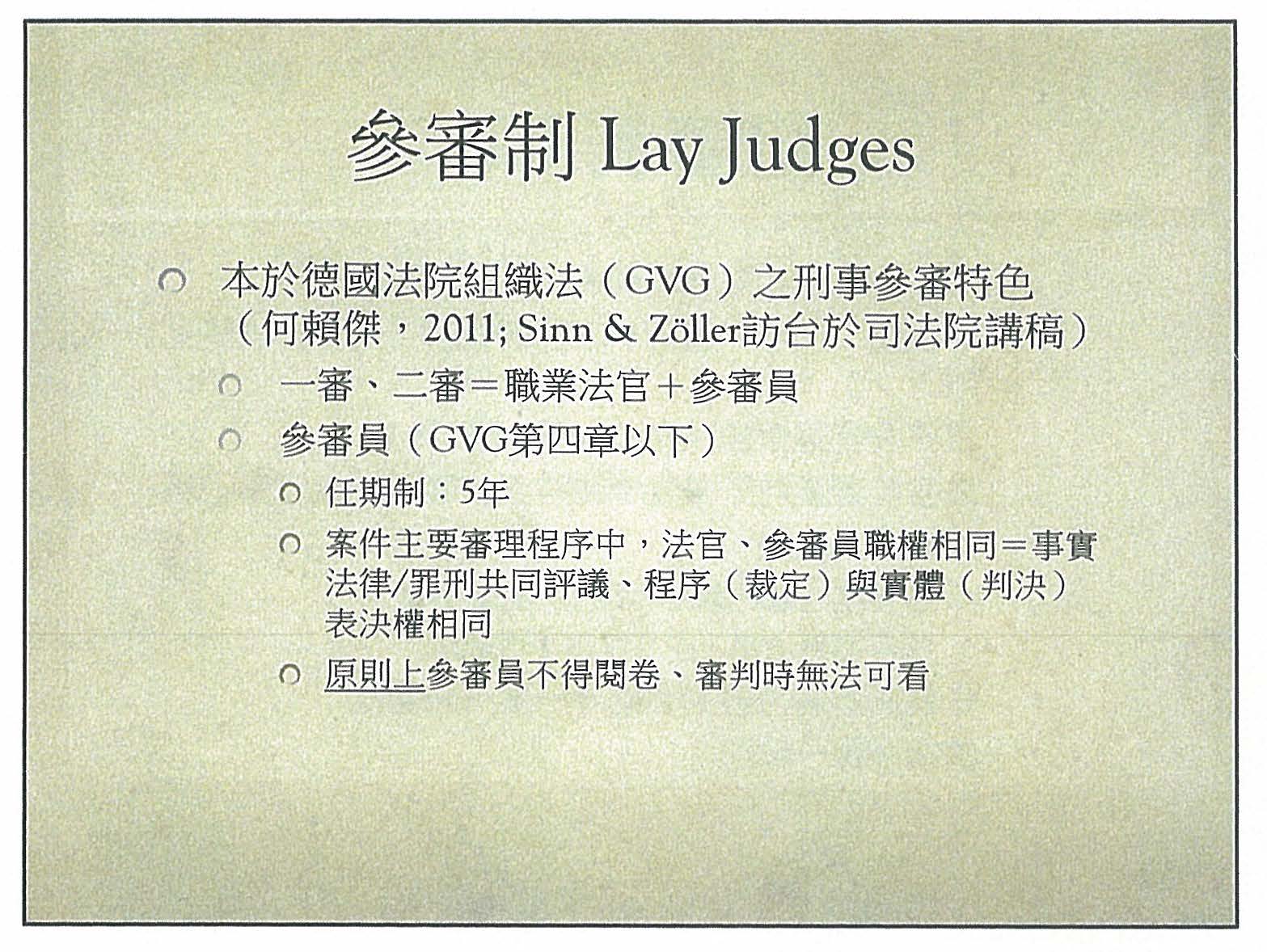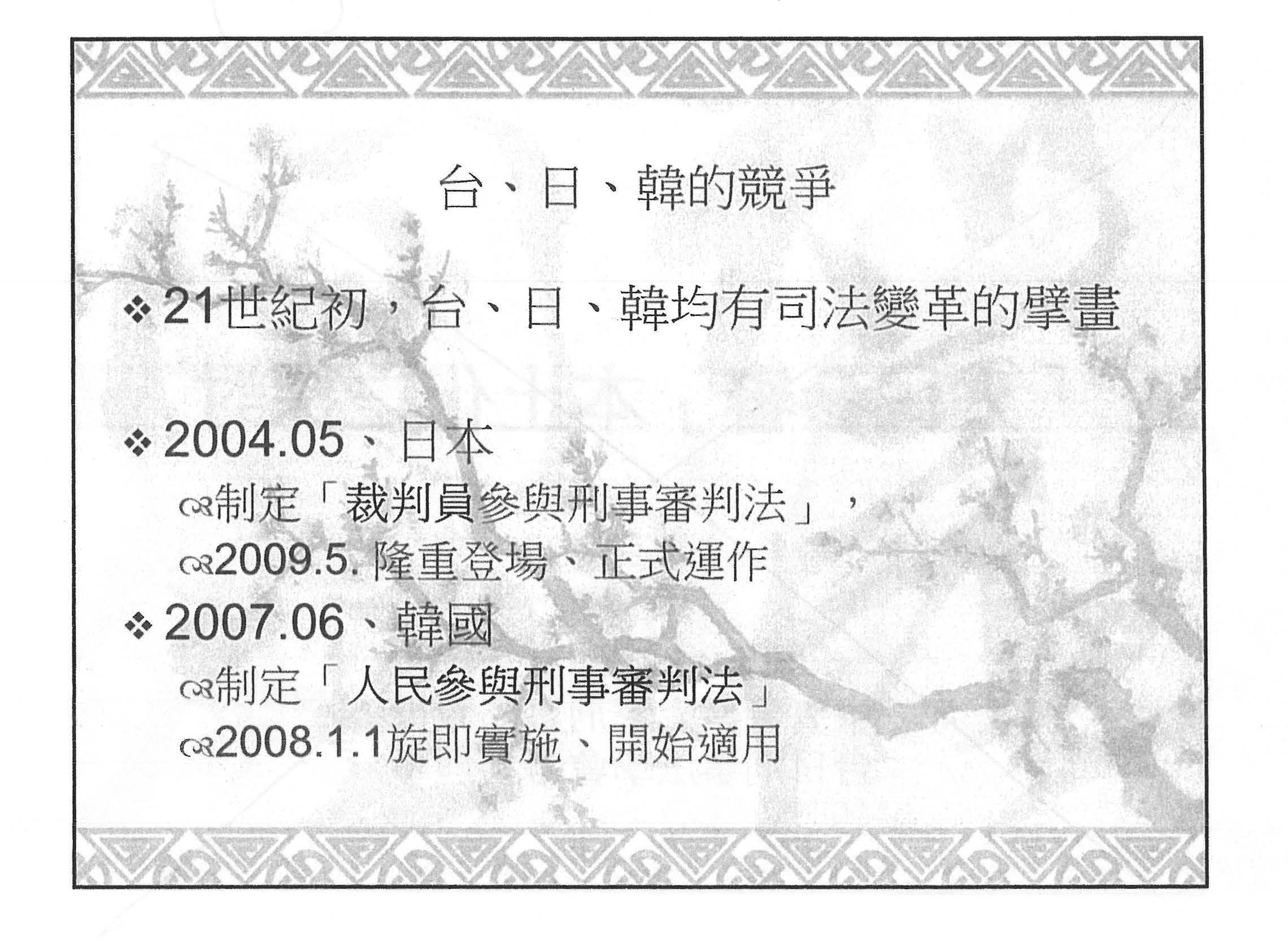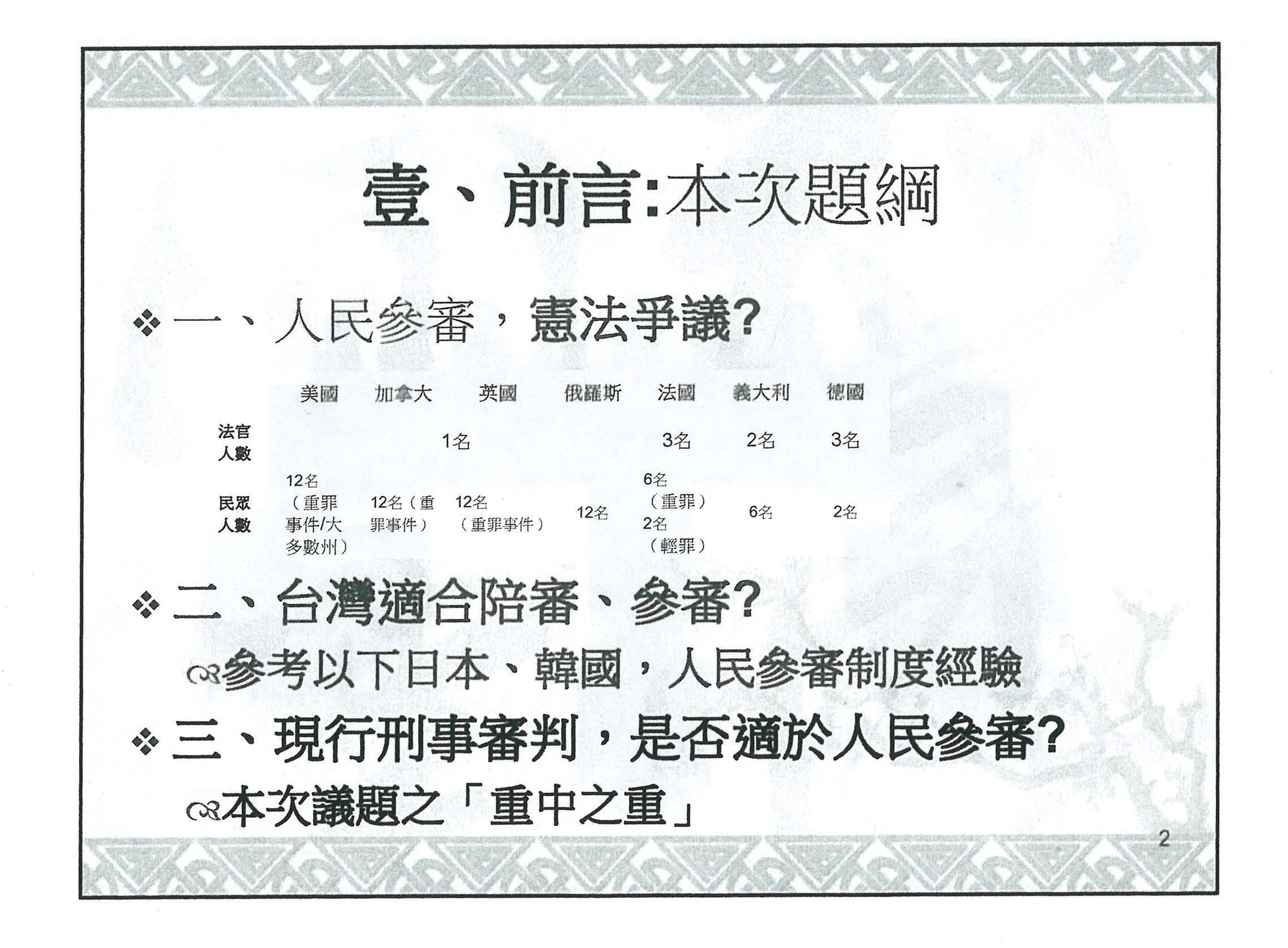 第二,臺灣到底適合陪審、參審?就近從東亞的日本、韓國來看的話,他們都沒有稱他們現在的人民參與審判制度為陪審或參審,這一點是值得我們注意的,他們並沒有說他們的制度叫做陪審或參審。這一點稍後我會再補充。