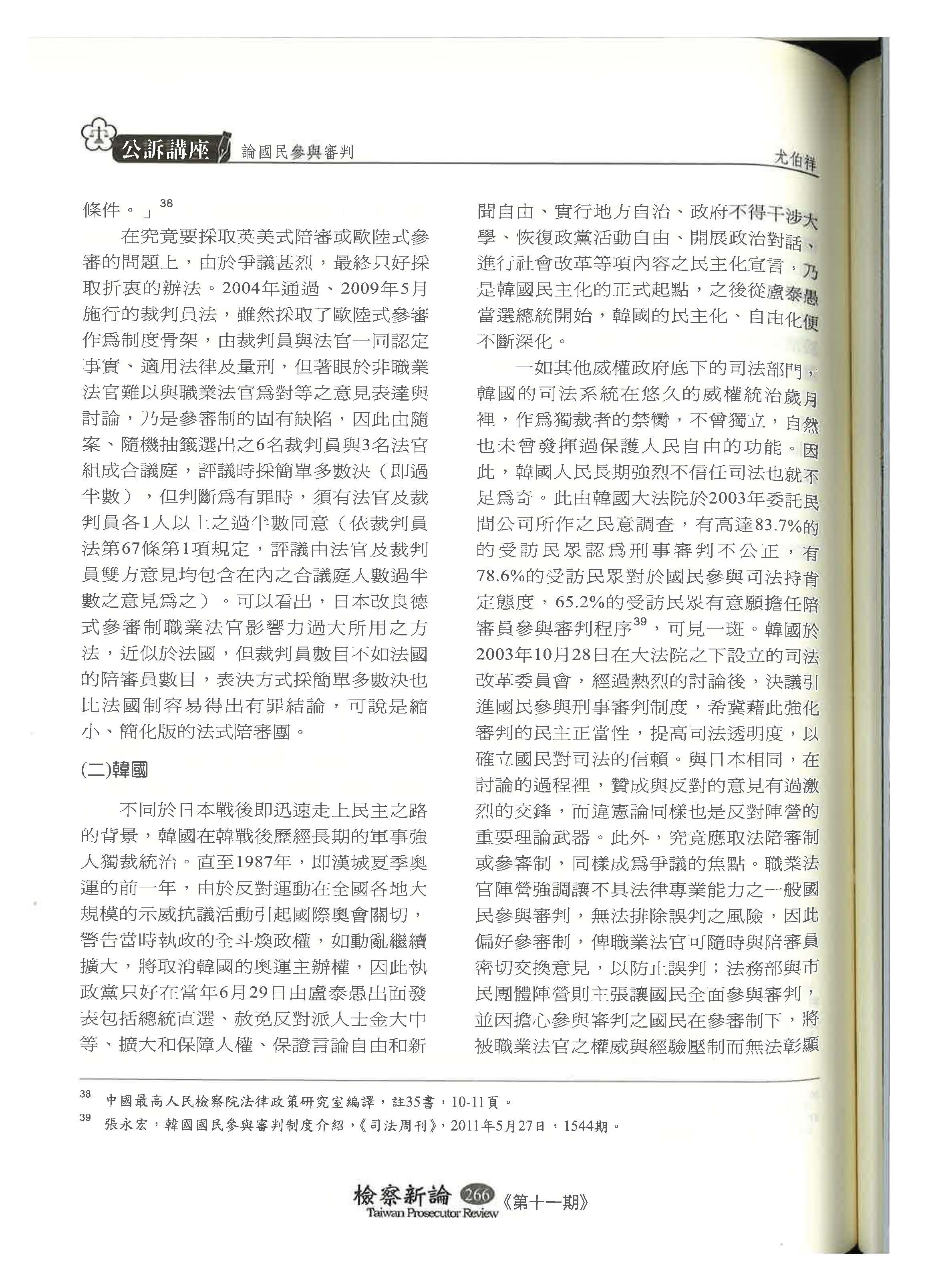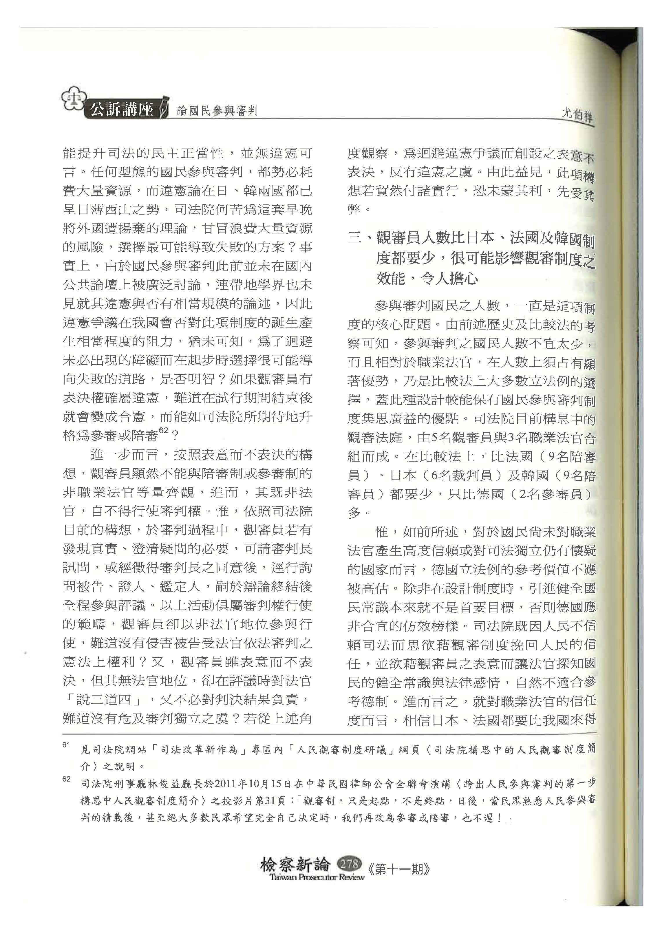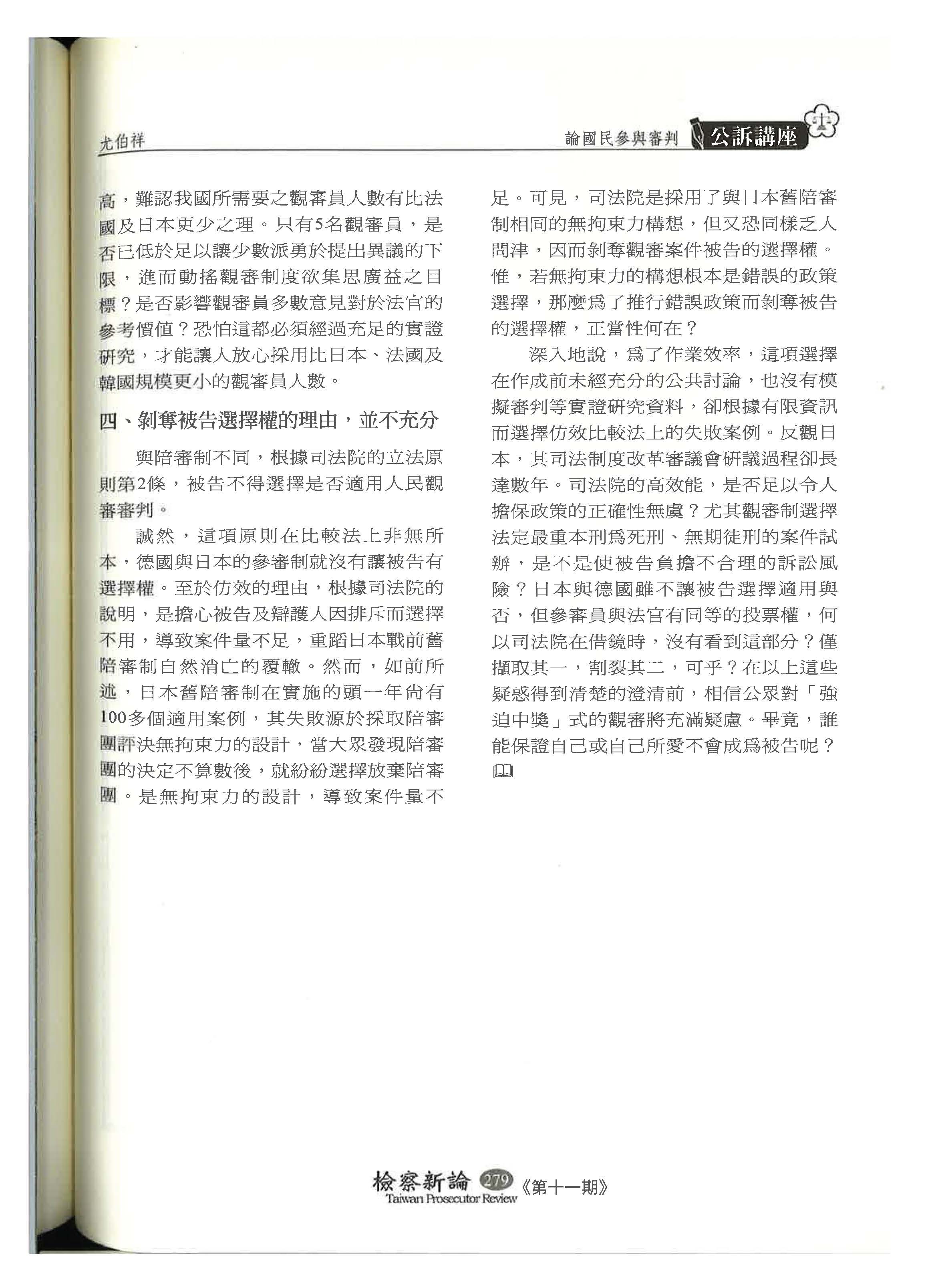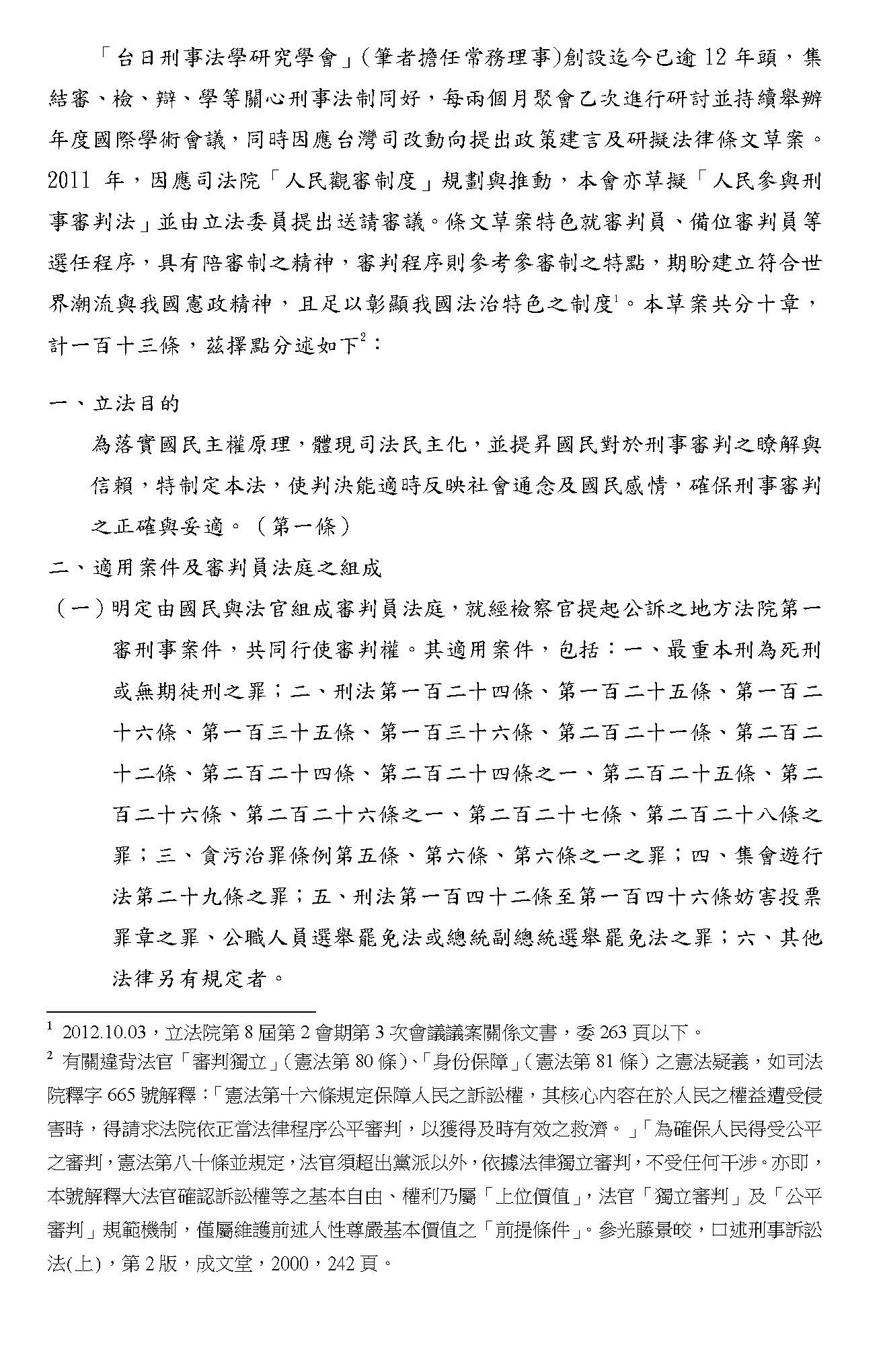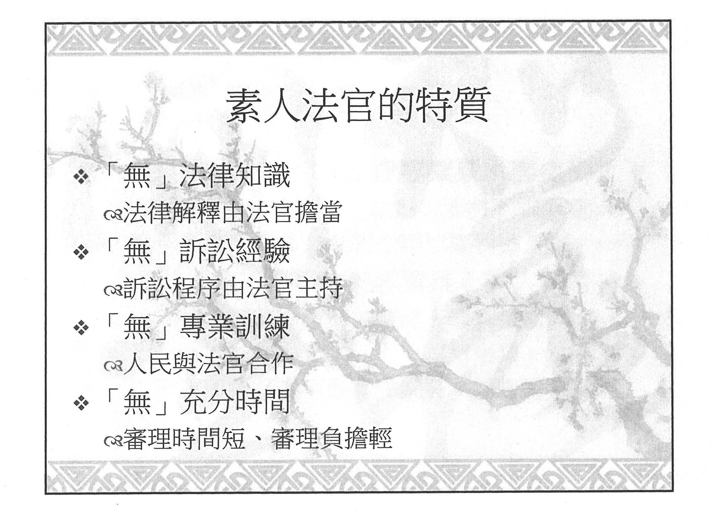 第二,臺灣到底適合陪審、參審?就近從東亞的日本、韓國來看的話,他們都沒有稱他們現在的人民參與審判制度為陪審或參審,這一點是值得我們注意的,他們並沒有說他們的制度叫做陪審或參審。這一點稍後我會再補充。