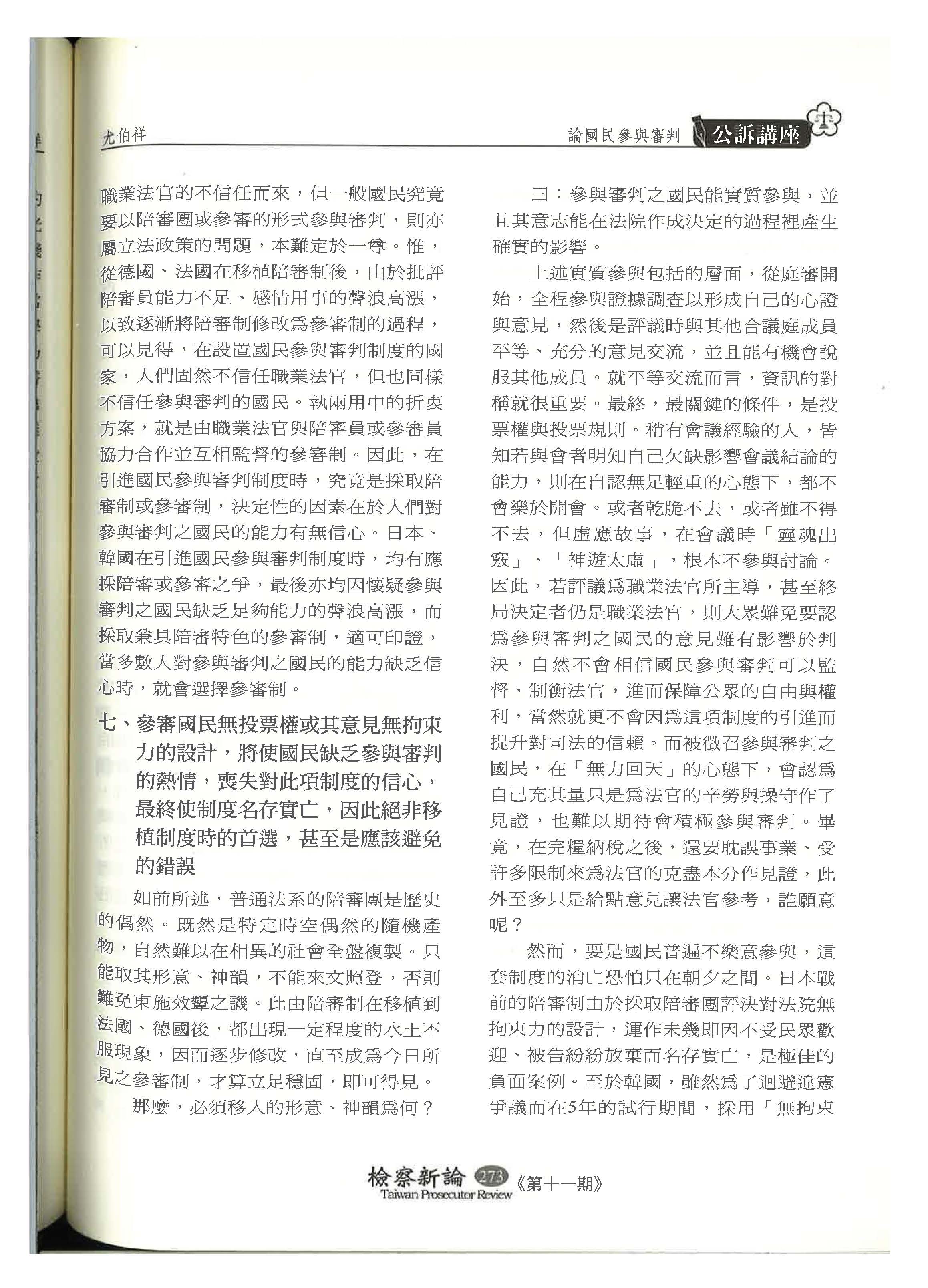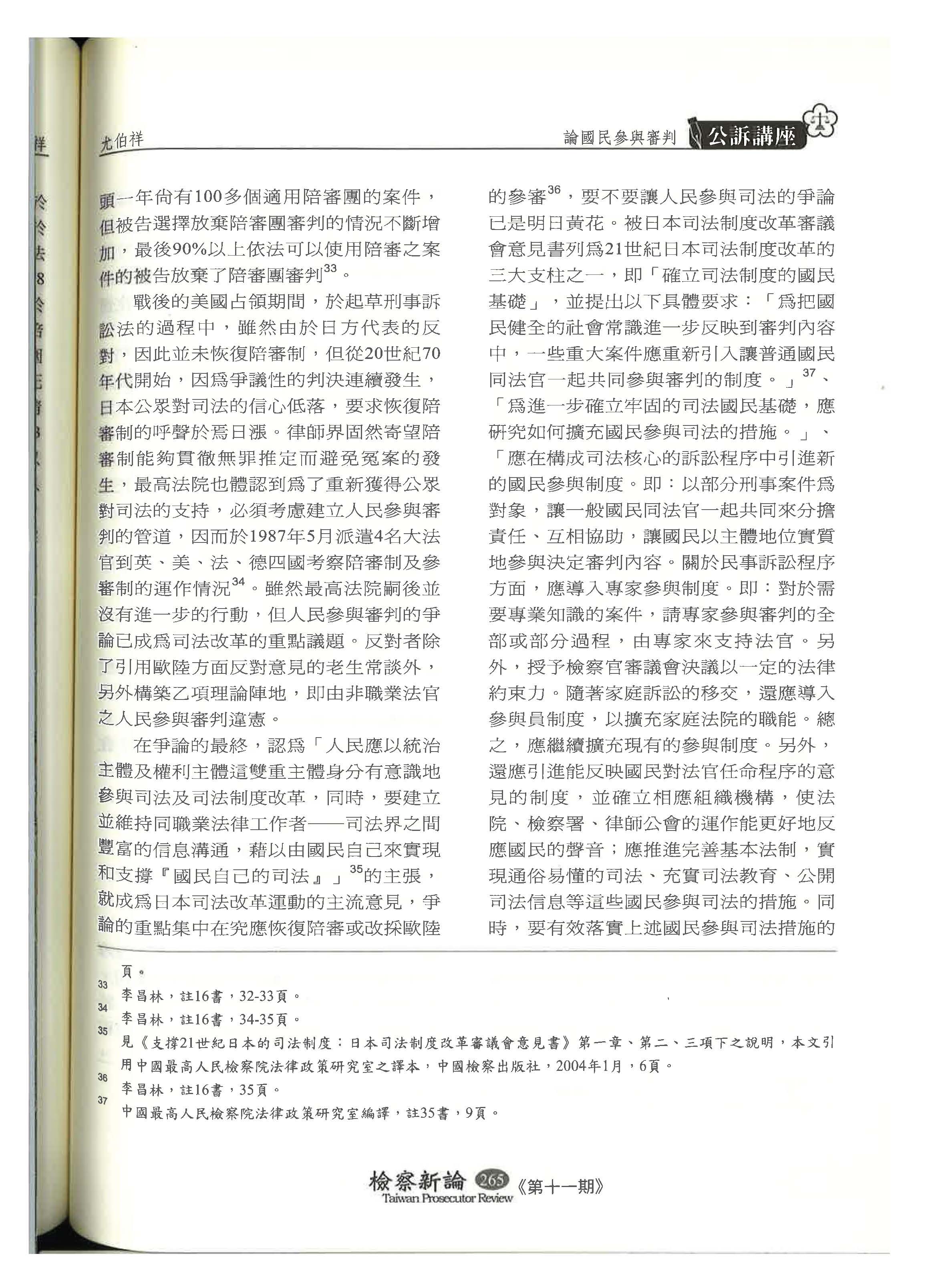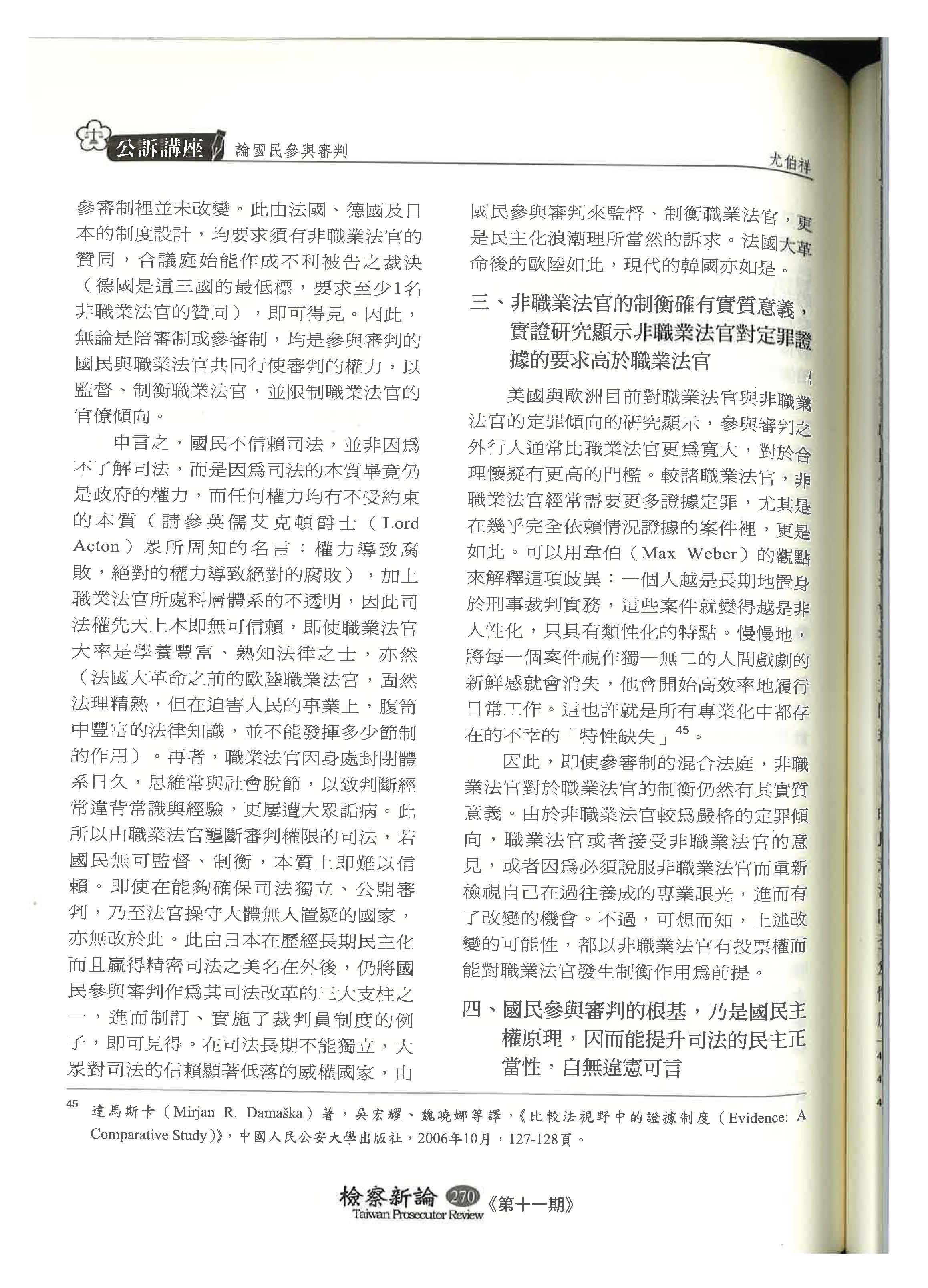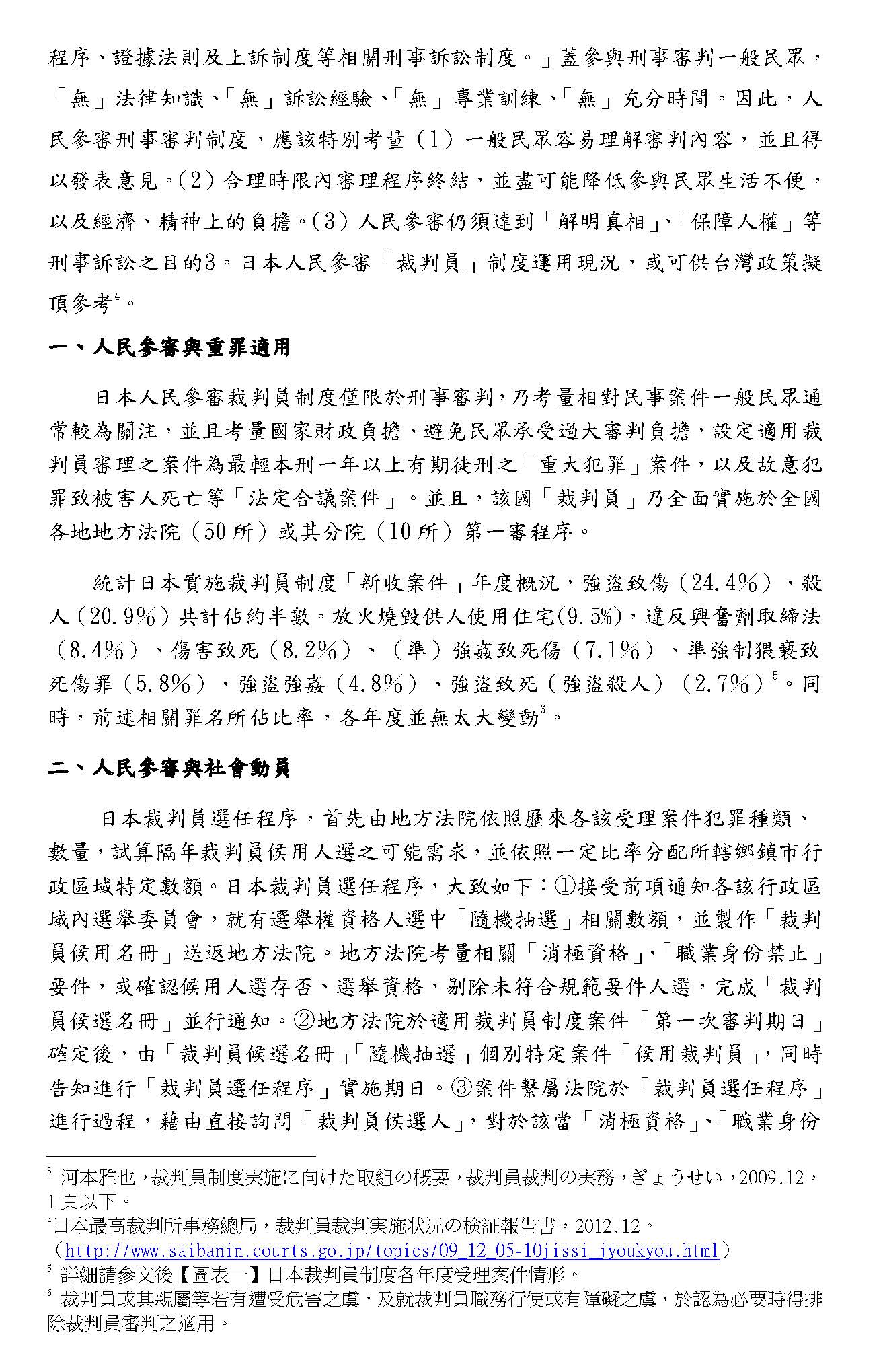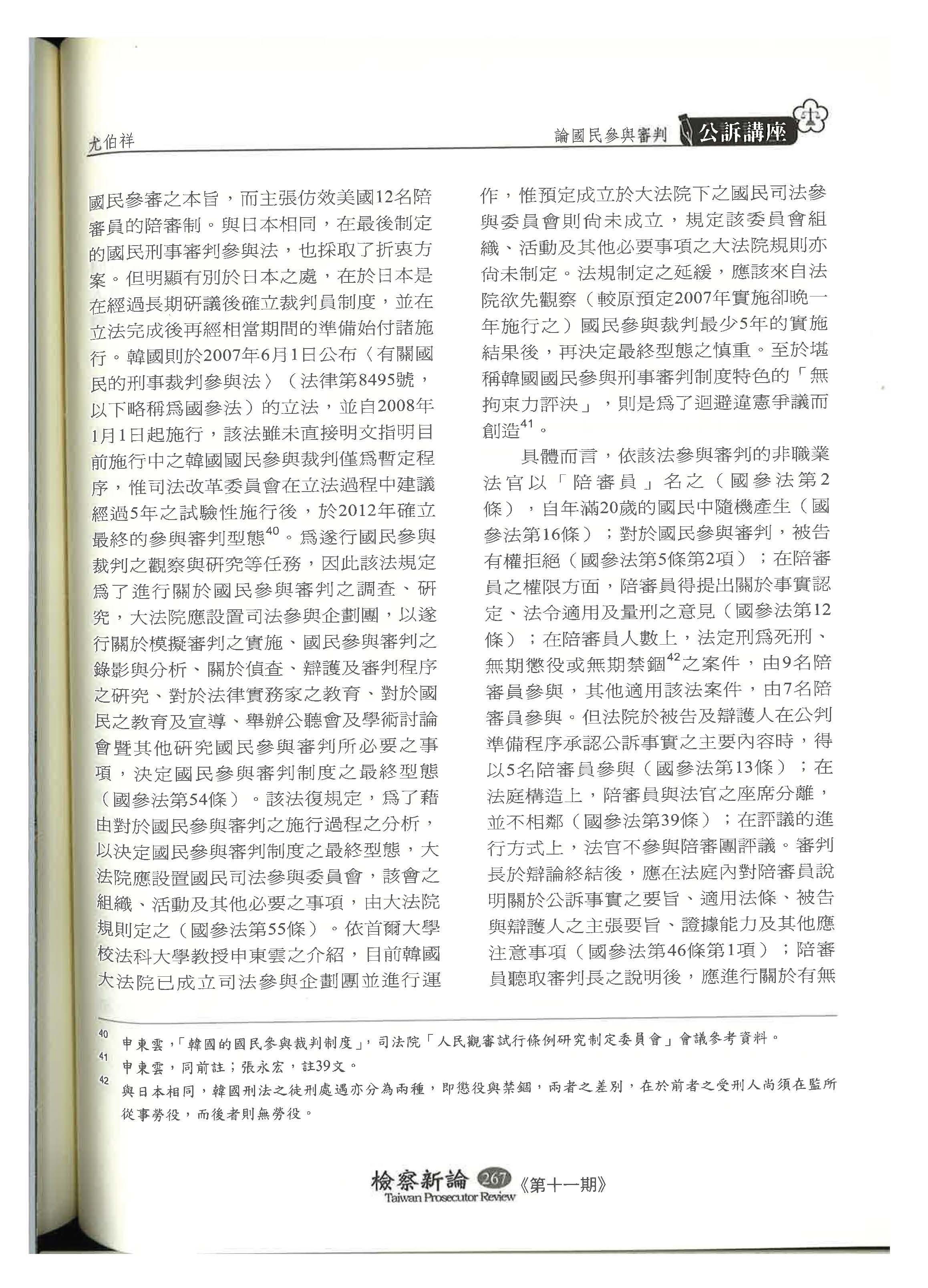 第二,臺灣到底適合陪審、參審?就近從東亞的日本、韓國來看的話,他們都沒有稱他們現在的人民參與審判制度為陪審或參審,這一點是值得我們注意的,他們並沒有說他們的制度叫做陪審或參審。這一點稍後我會再補充。
