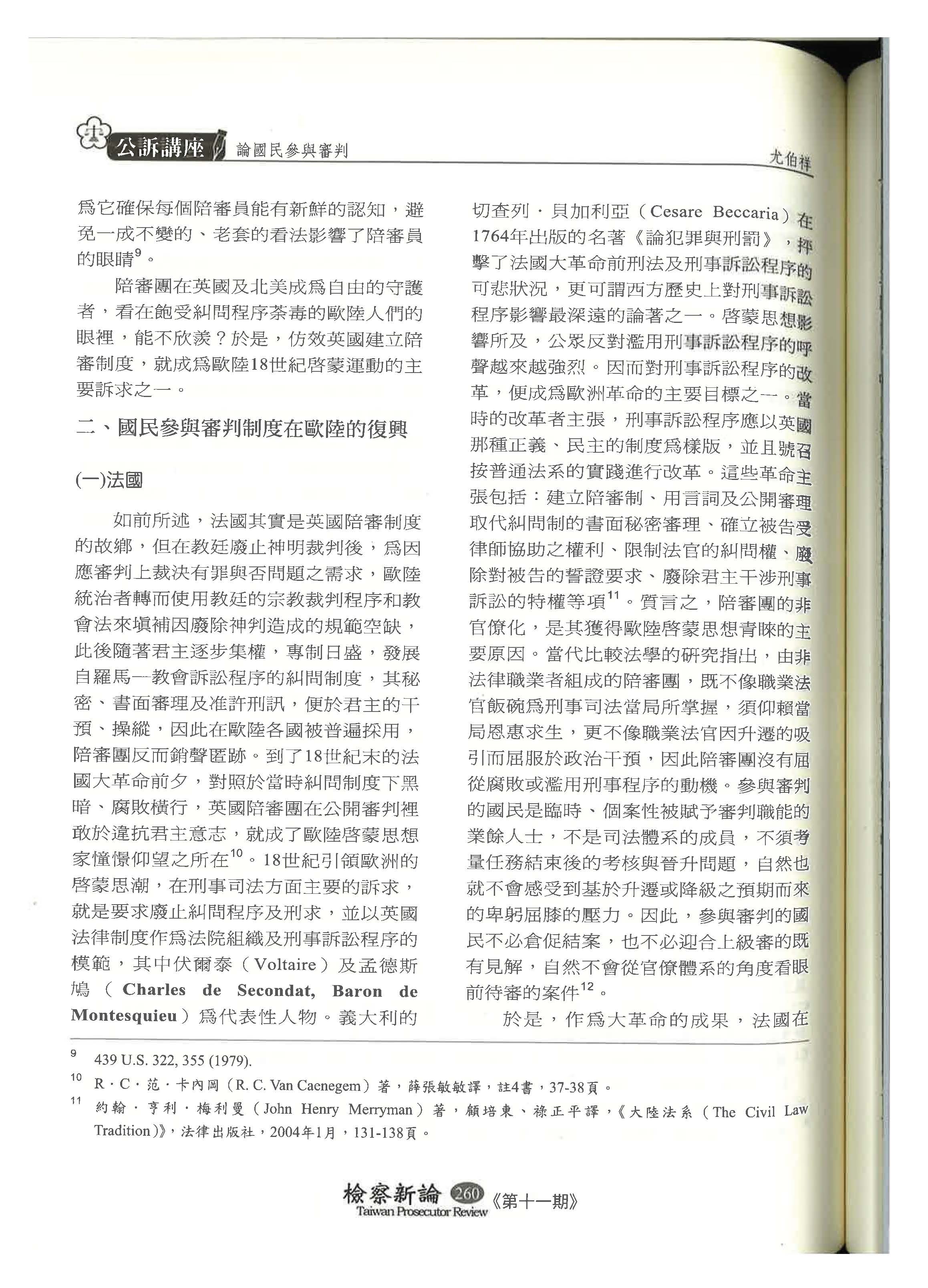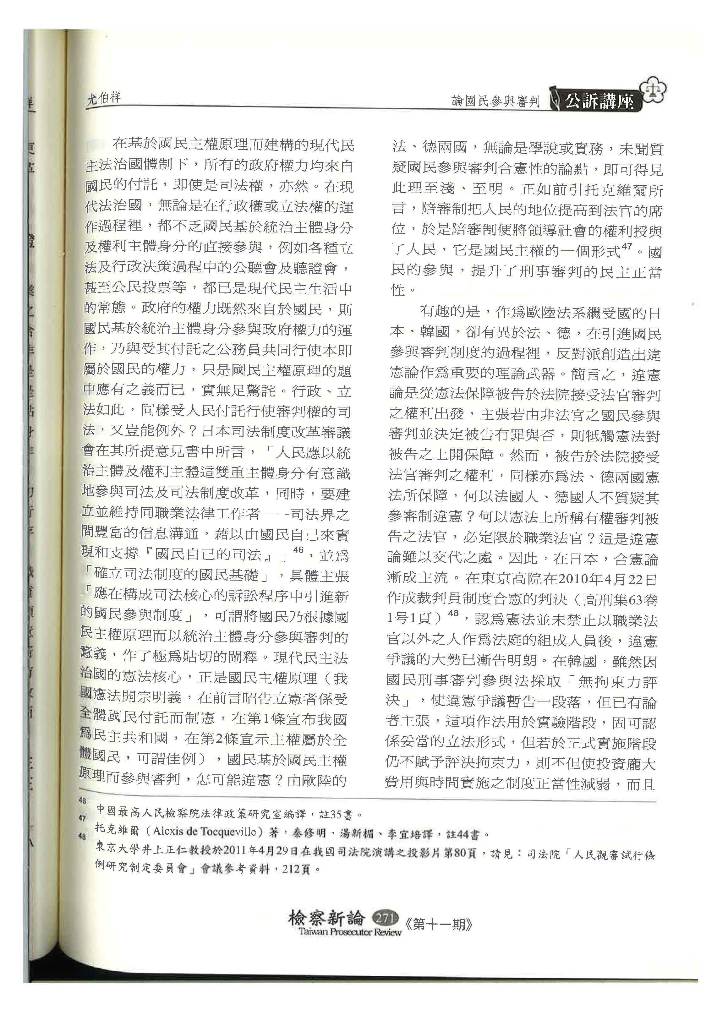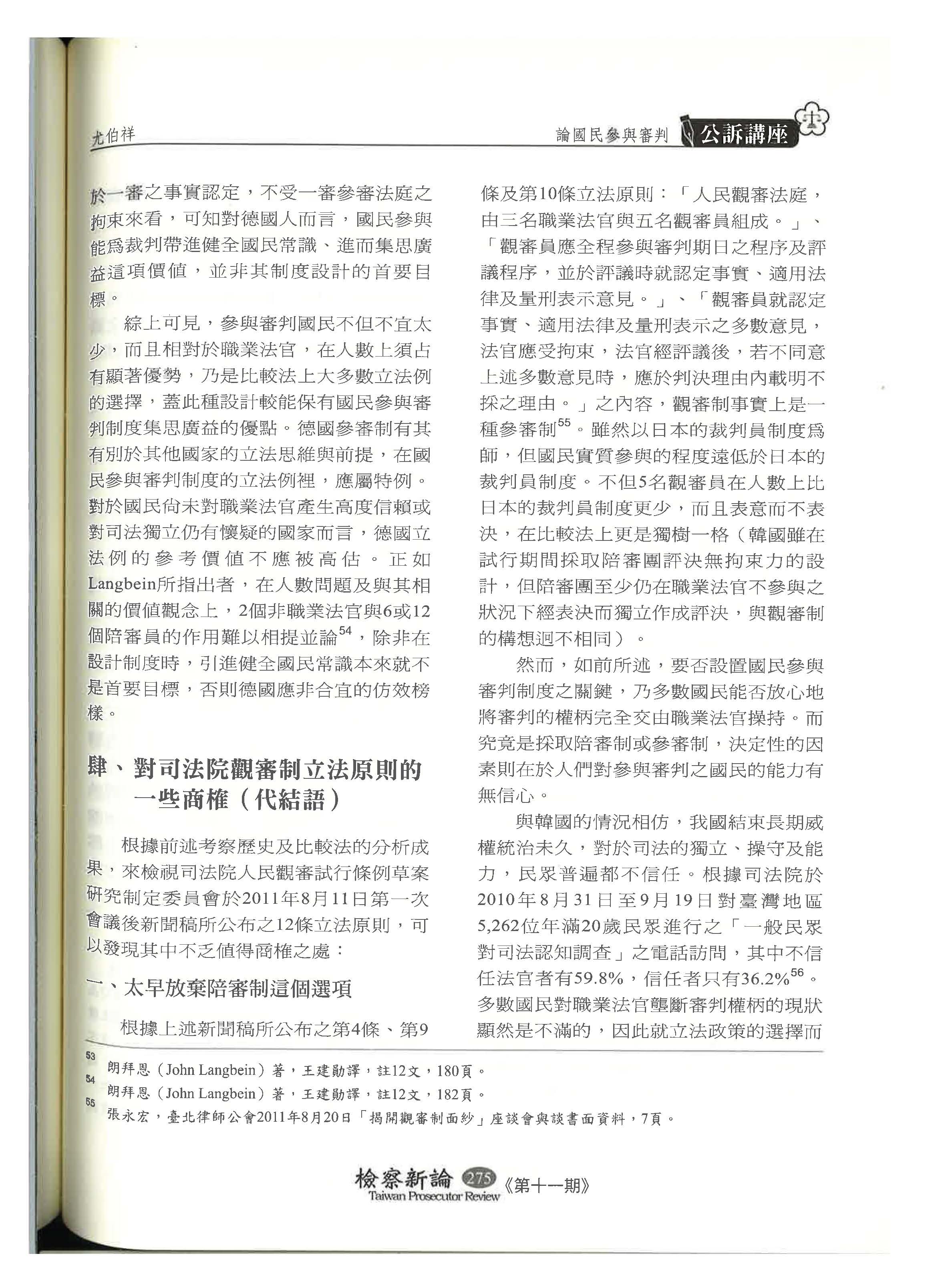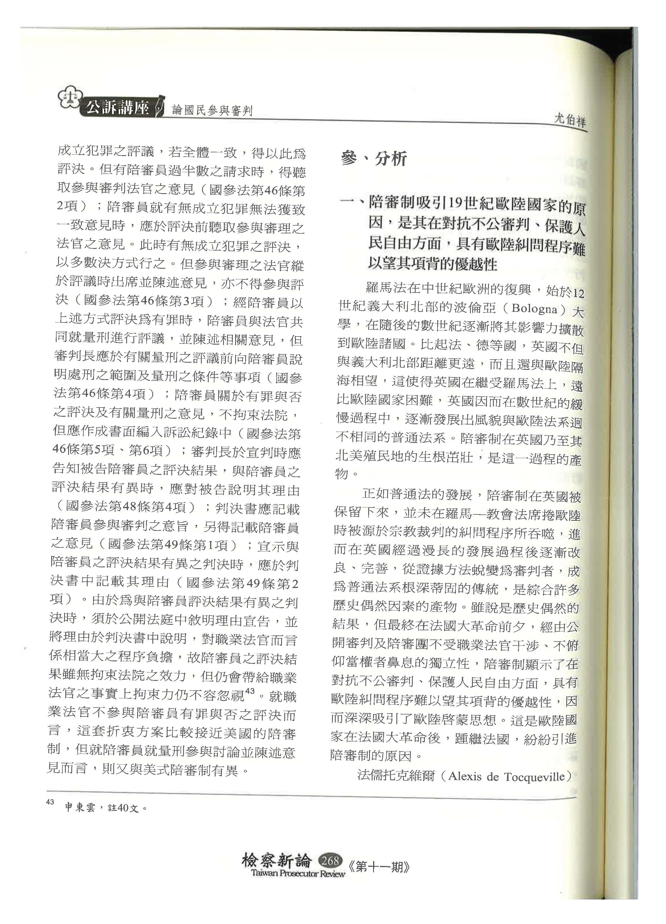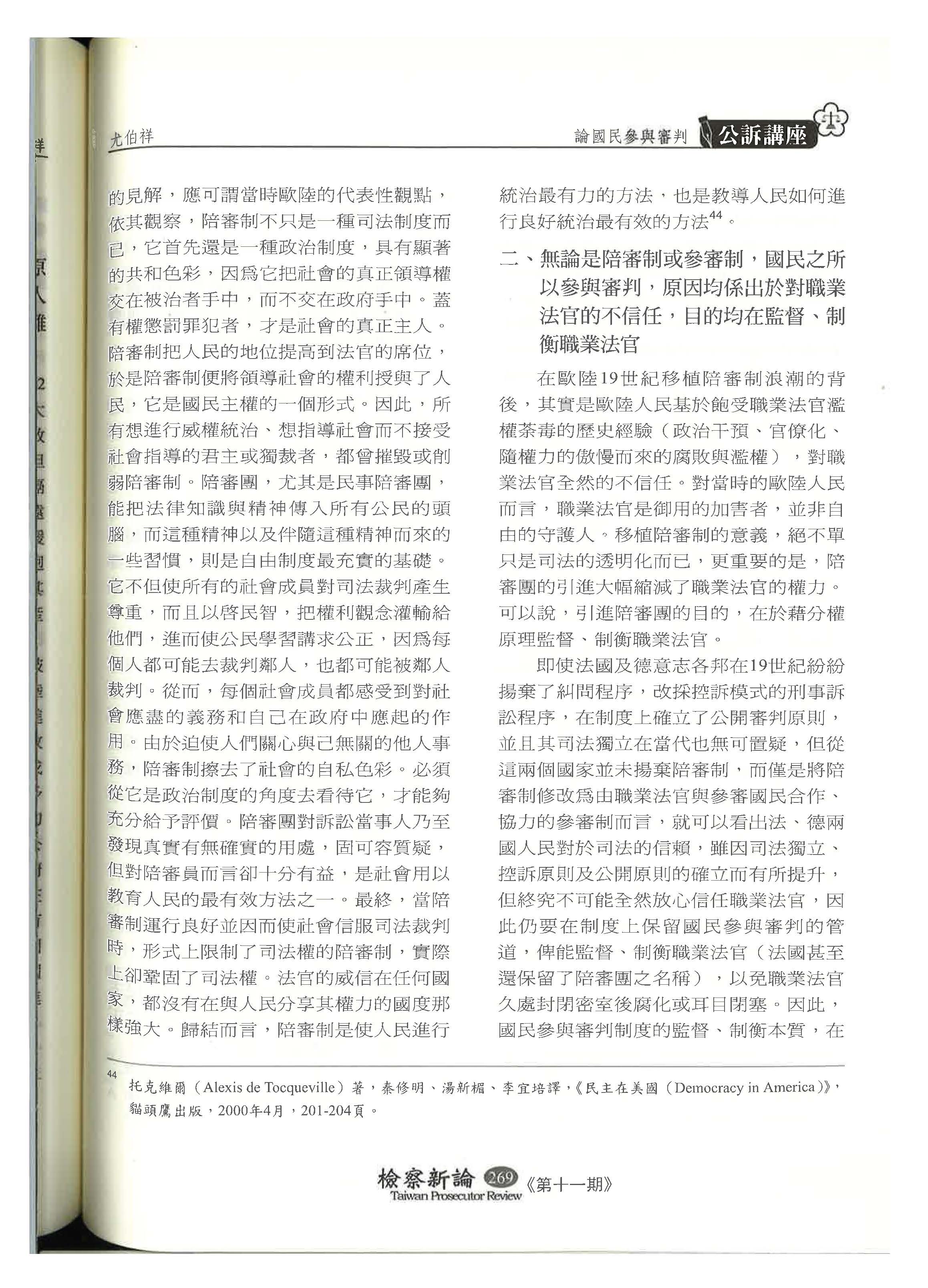 第二,臺灣到底適合陪審、參審?就近從東亞的日本、韓國來看的話,他們都沒有稱他們現在的人民參與審判制度為陪審或參審,這一點是值得我們注意的,他們並沒有說他們的制度叫做陪審或參審。這一點稍後我會再補充。