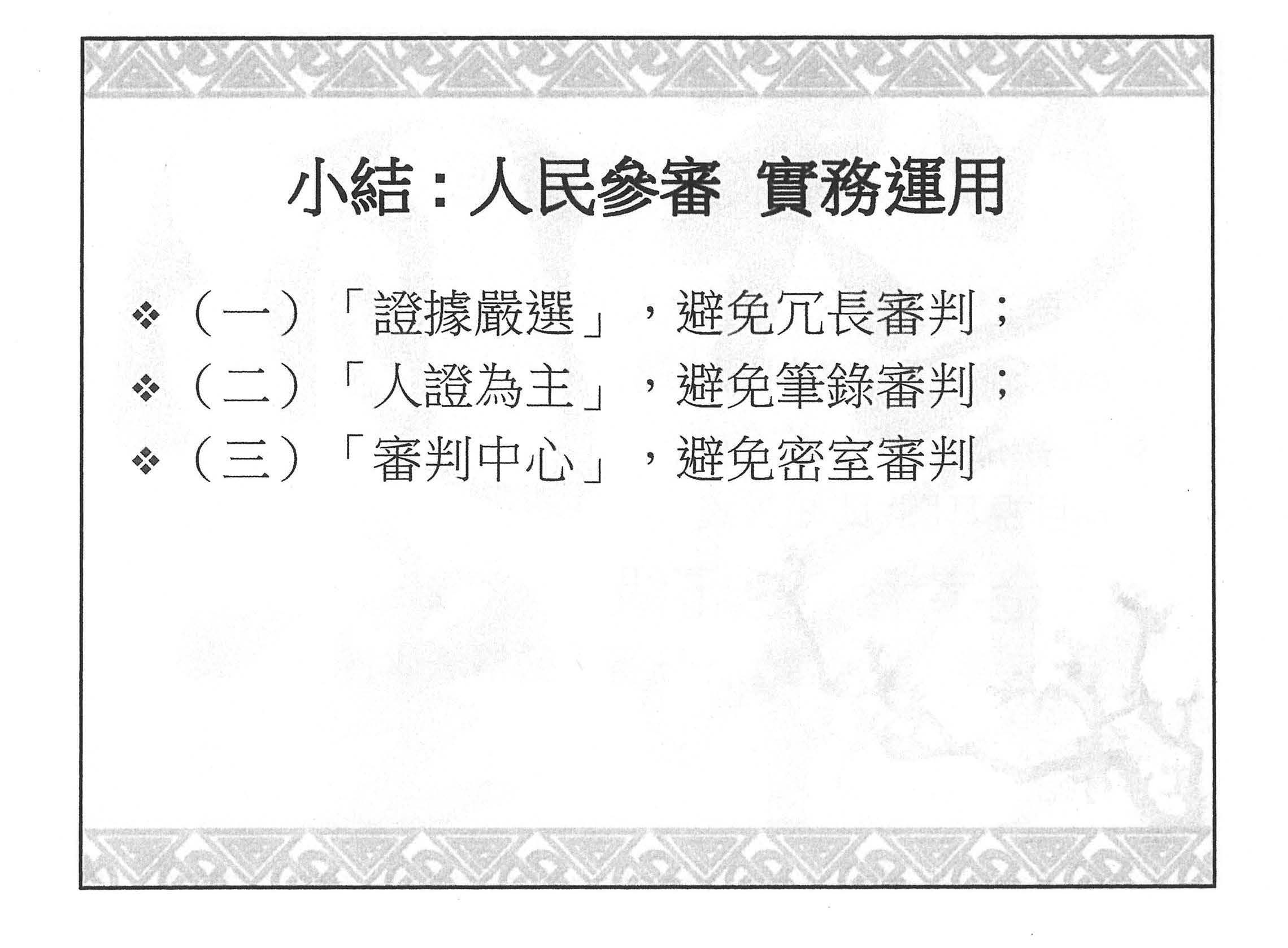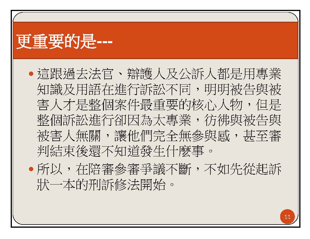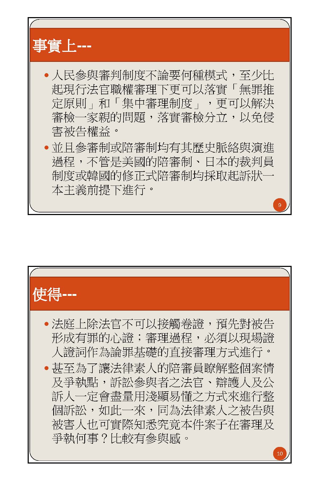 另外一個重點就是我們要考慮到人民沒有法律知識,人民沒有訴訟經驗,人民沒有專業訓練,人民沒有充分時間,簡單講,人民要參與審判,如果你刑事制度不改,我要強調一下,我贊成剛才司法院所提的,因為各國大制上都是這樣子,參與審判的成本很重,所以只適用解決罪質重的或是爭議大的案件。可是大家想想看,這麼多殺人放火的案件,以我們目前的審判制度有辦法3天審結嗎?如果沒有辦法的話,我們實在沒有資格說要去導入人民參與審判。我再強調一下,如果讓人民參與審判,但他對法庭完全是陌生的,來到法院甚至不知道要坐在什麼位置,那麼我想這個過程是很漫長的。因為時間的關係,我以上的報告最主要是強調人民參與審判絕不能單獨立法,一定要配套刑事審判制度的改變。