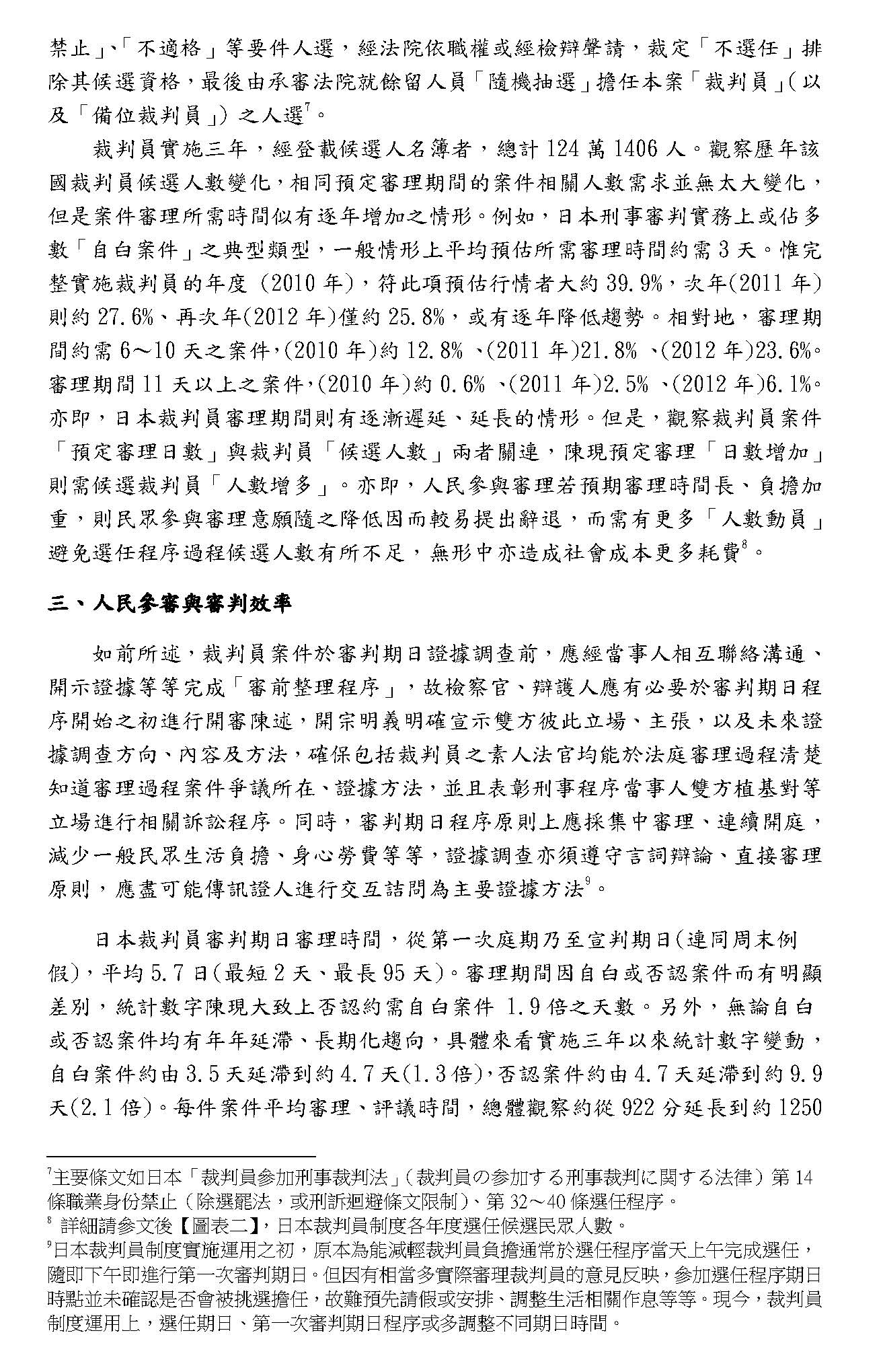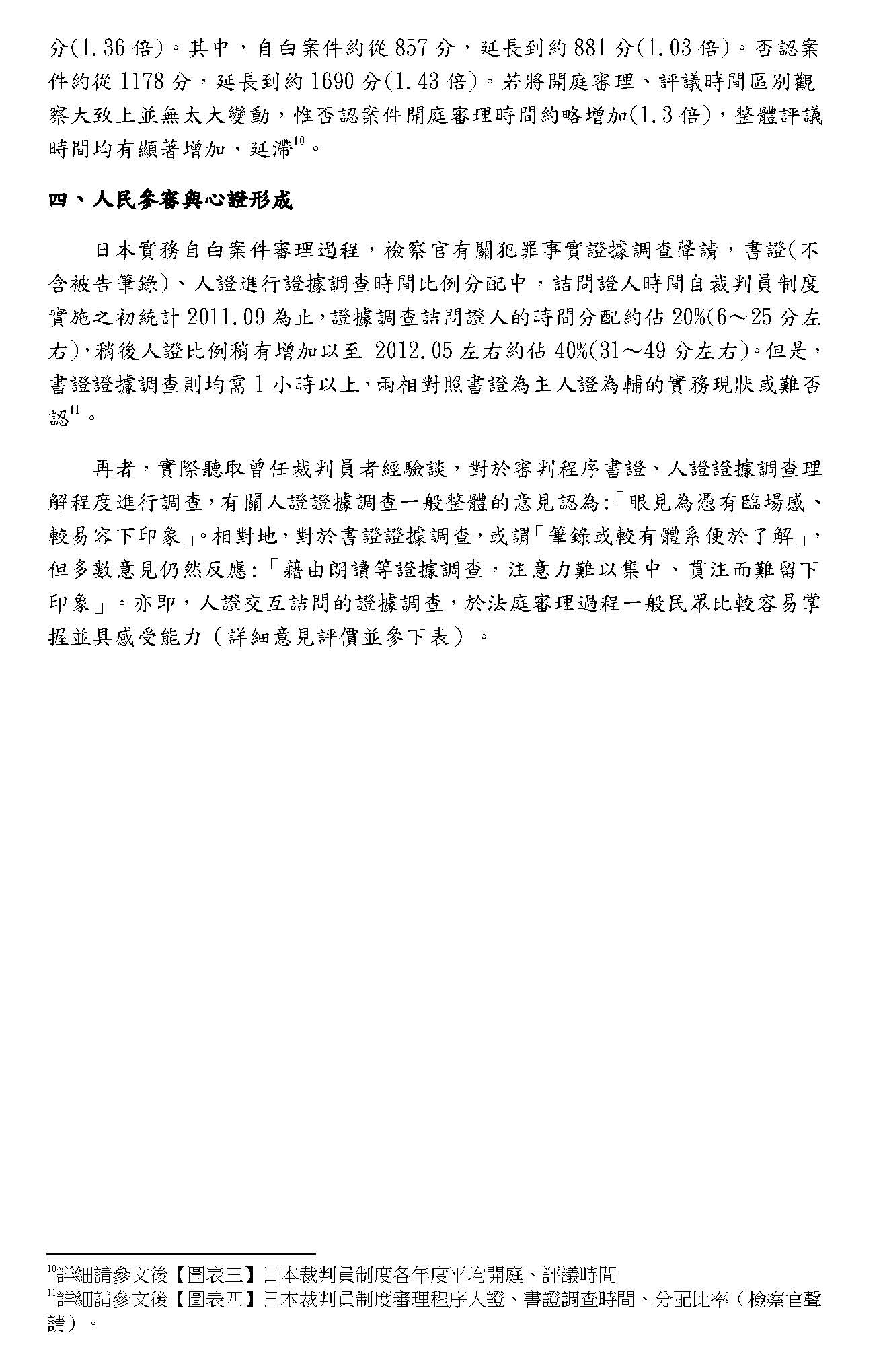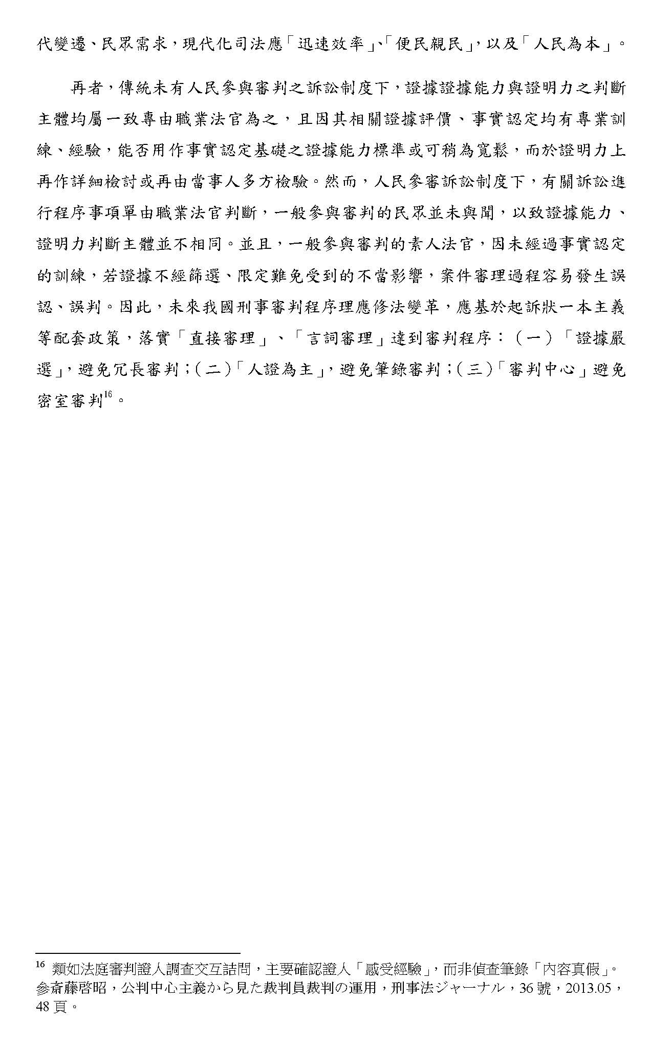 另外一個重點就是我們要考慮到人民沒有法律知識,人民沒有訴訟經驗,人民沒有專業訓練,人民沒有充分時間,簡單講,人民要參與審判,如果你刑事制度不改,我要強調一下,我贊成剛才司法院所提的,因為各國大制上都是這樣子,參與審判的成本很重,所以只適用解決罪質重的或是爭議大的案件。可是大家想想看,這麼多殺人放火的案件,以我們目前的審判制度有辦法3天審結嗎?如果沒有辦法的話,我們實在沒有資格說要去導入人民參與審判。我再強調一下,如果讓人民參與審判,但他對法庭完全是陌生的,來到法院甚至不知道要坐在什麼位置,那麼我想這個過程是很漫長的。因為時間的關係,我以上的報告最主要是強調人民參與審判絕不能單獨立法,一定要配套刑事審判制度的改變。