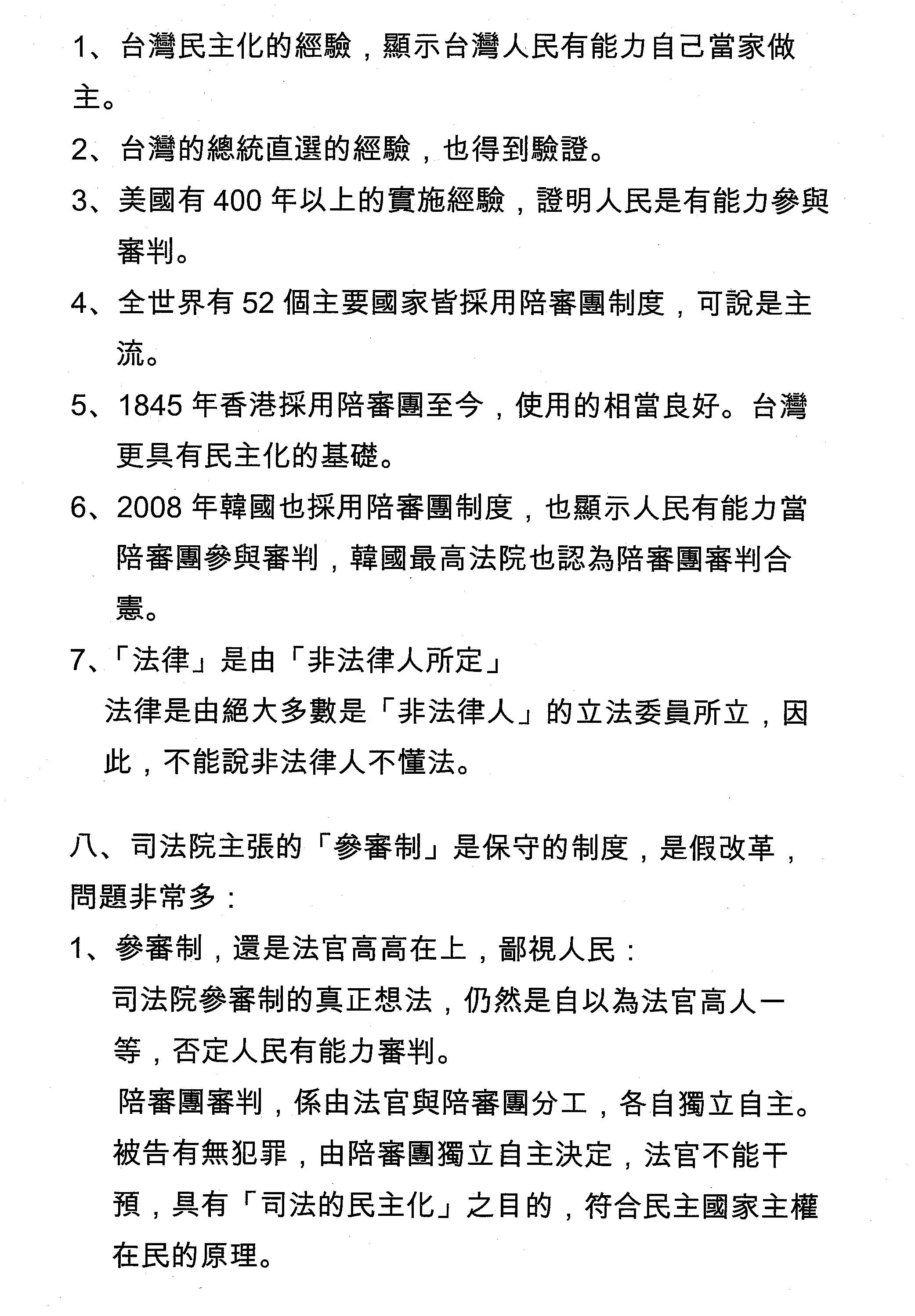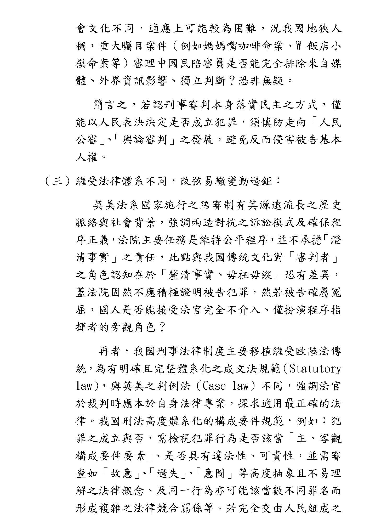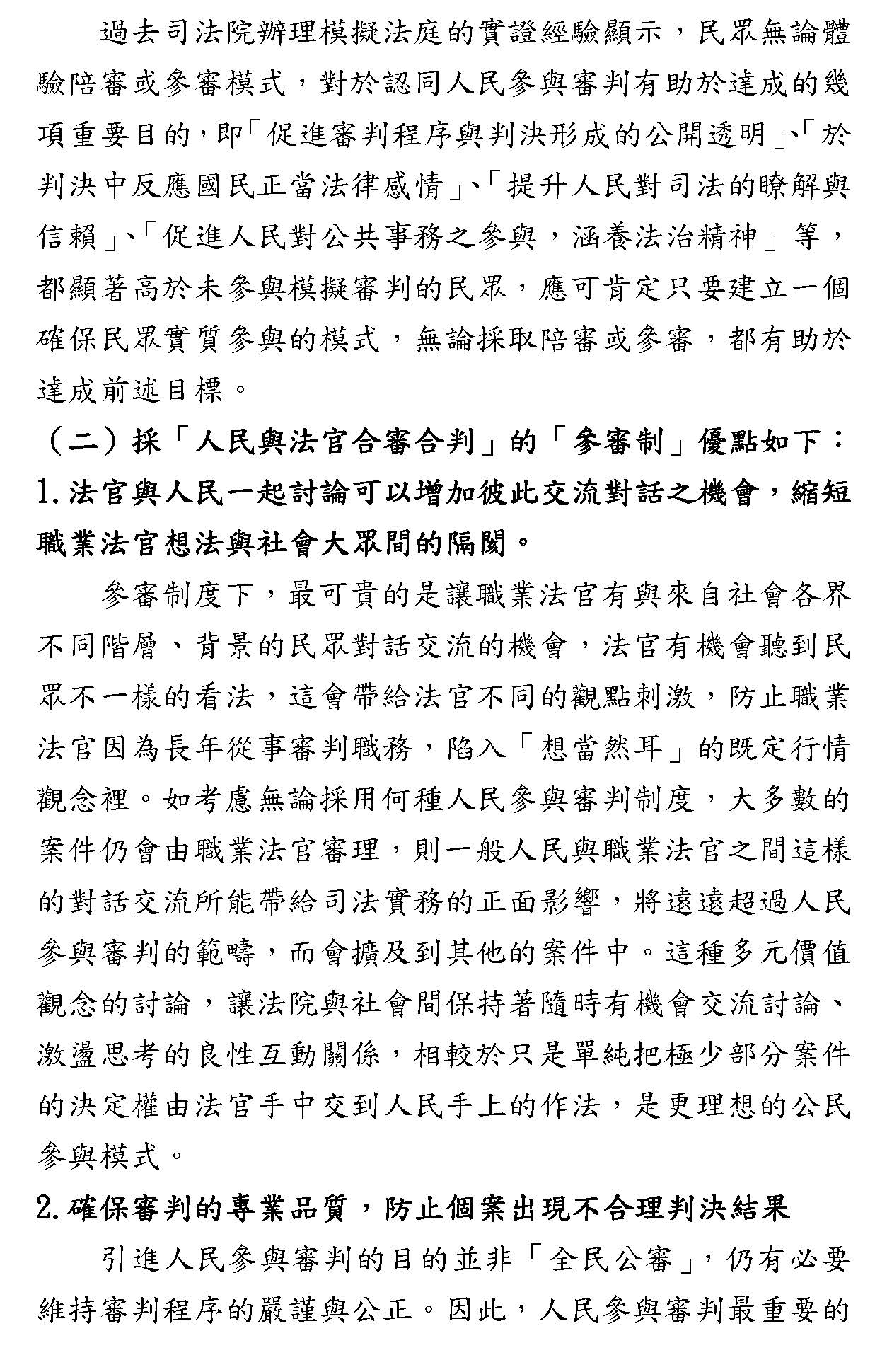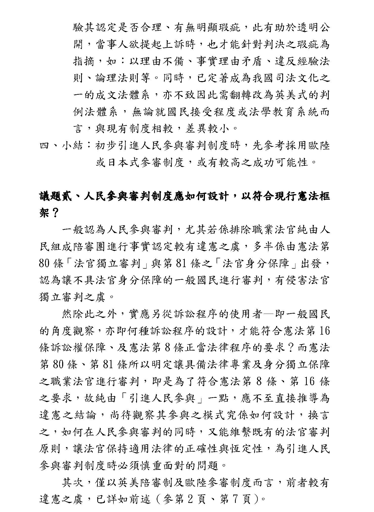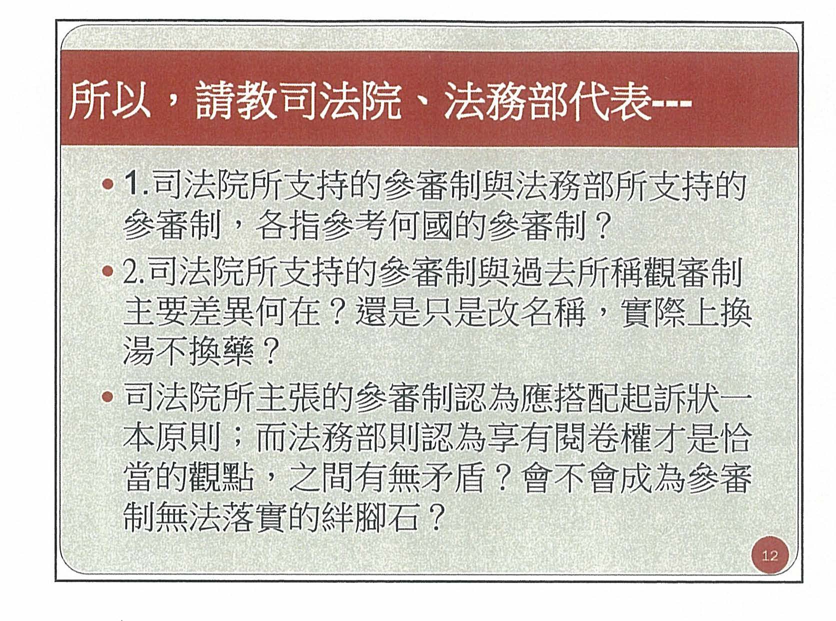 在第一部分我要回應司法院幾點,第一個,司法院提出很多的實證經驗固然很可貴,不過這些都是以觀審制為前提,當然這個是之前的政策,不是幕僚的問題,但是所有的實證資料只能支撐觀審制,包括人民的支持,你沒有用陪審制去做訪問,你怎麼知道不會?你沒有用參審制去做調查,你怎麼知道人民的支持度不會更高?所以這些實證資料的說明程度我覺得是不足的。