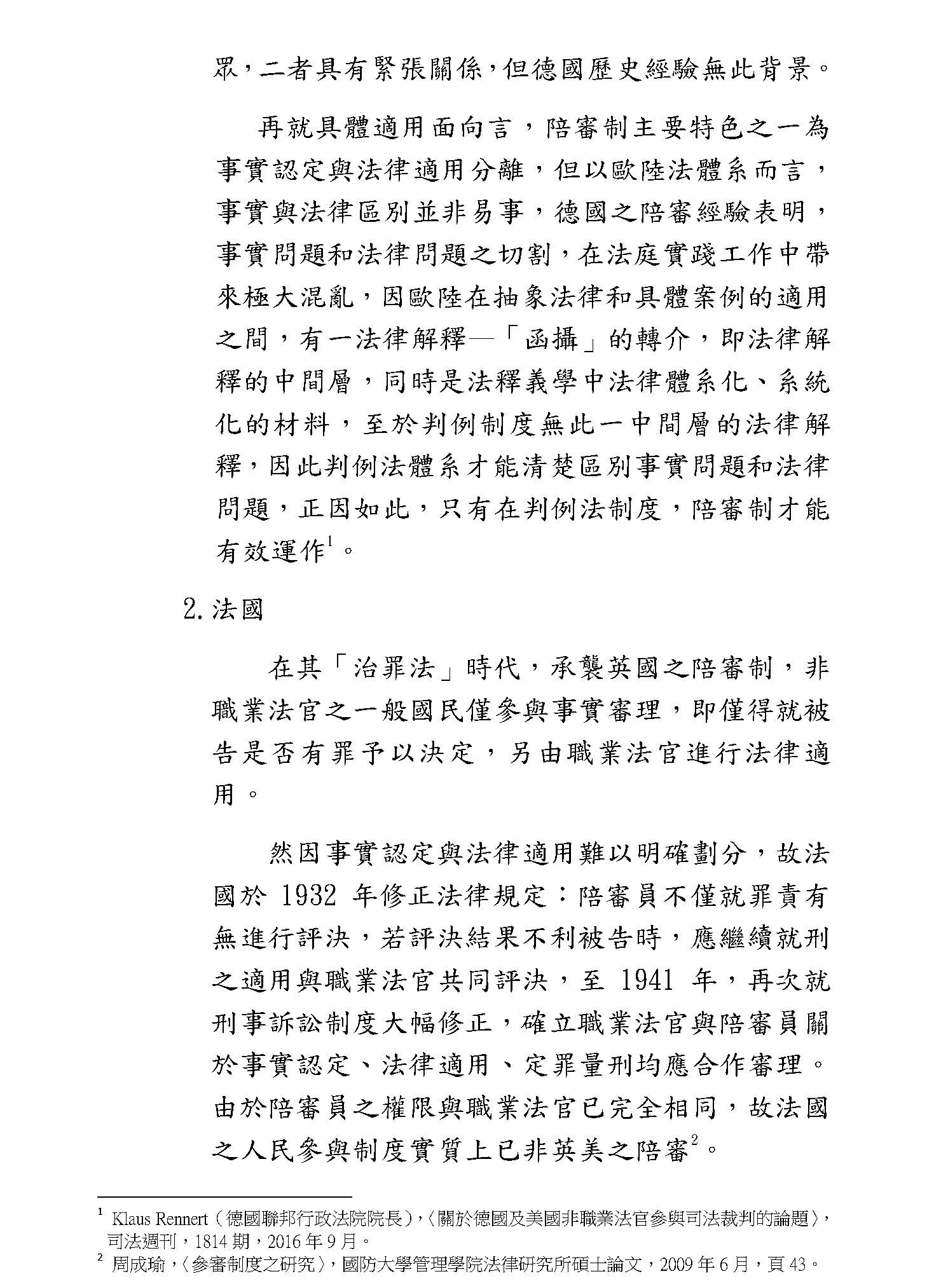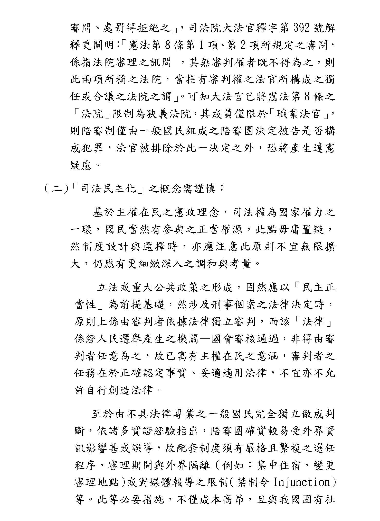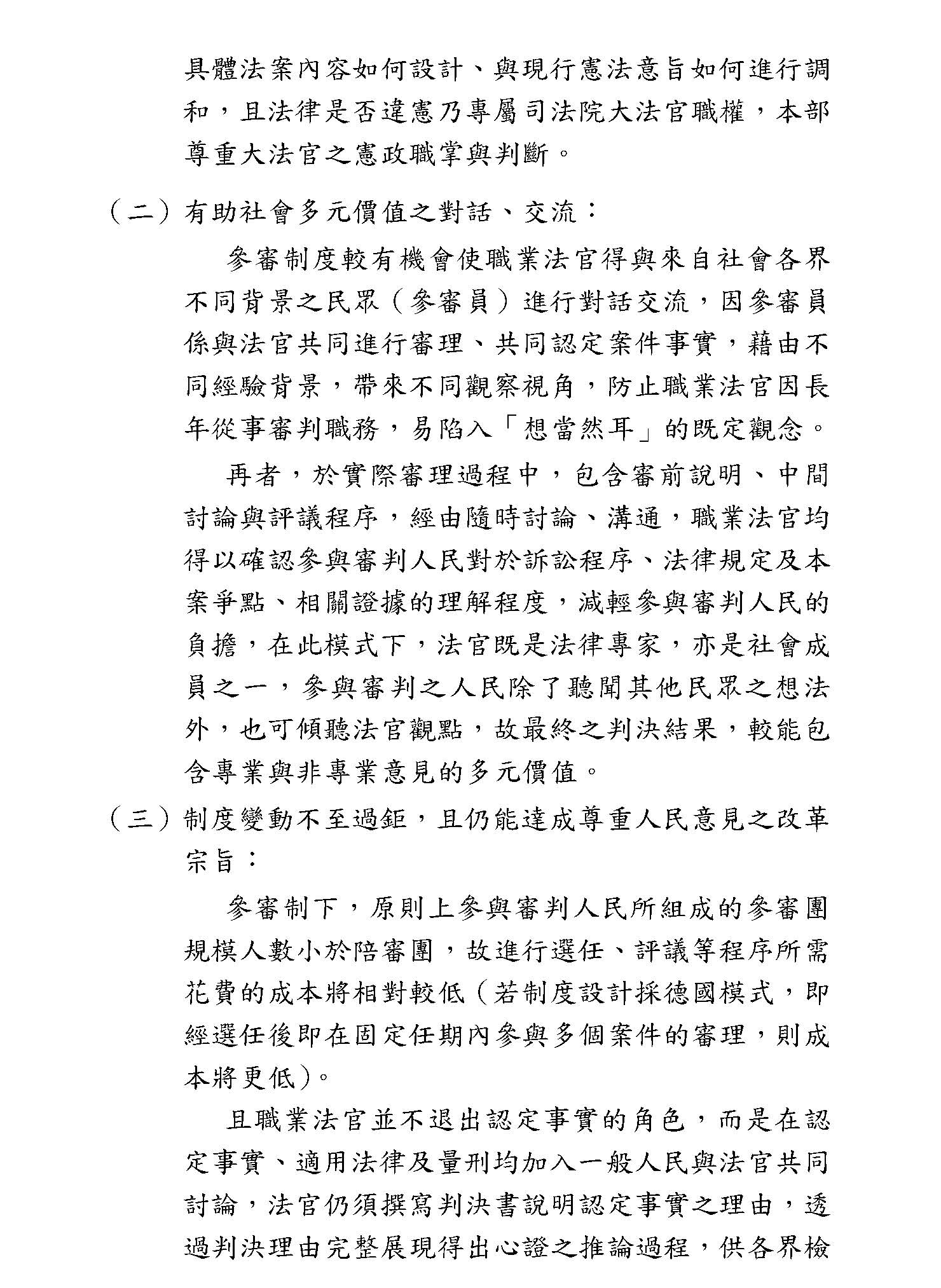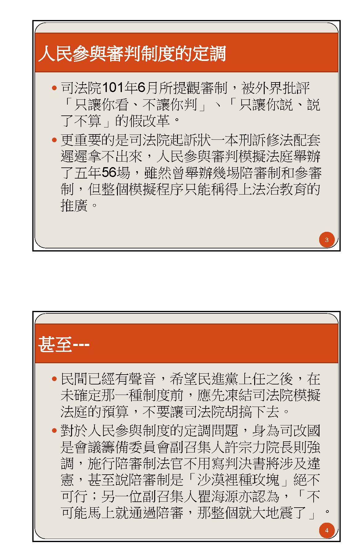 在第一部分我要回應司法院幾點,第一個,司法院提出很多的實證經驗固然很可貴,不過這些都是以觀審制為前提,當然這個是之前的政策,不是幕僚的問題,但是所有的實證資料只能支撐觀審制,包括人民的支持,你沒有用陪審制去做訪問,你怎麼知道不會?你沒有用參審制去做調查,你怎麼知道人民的支持度不會更高?所以這些實證資料的說明程度我覺得是不足的。