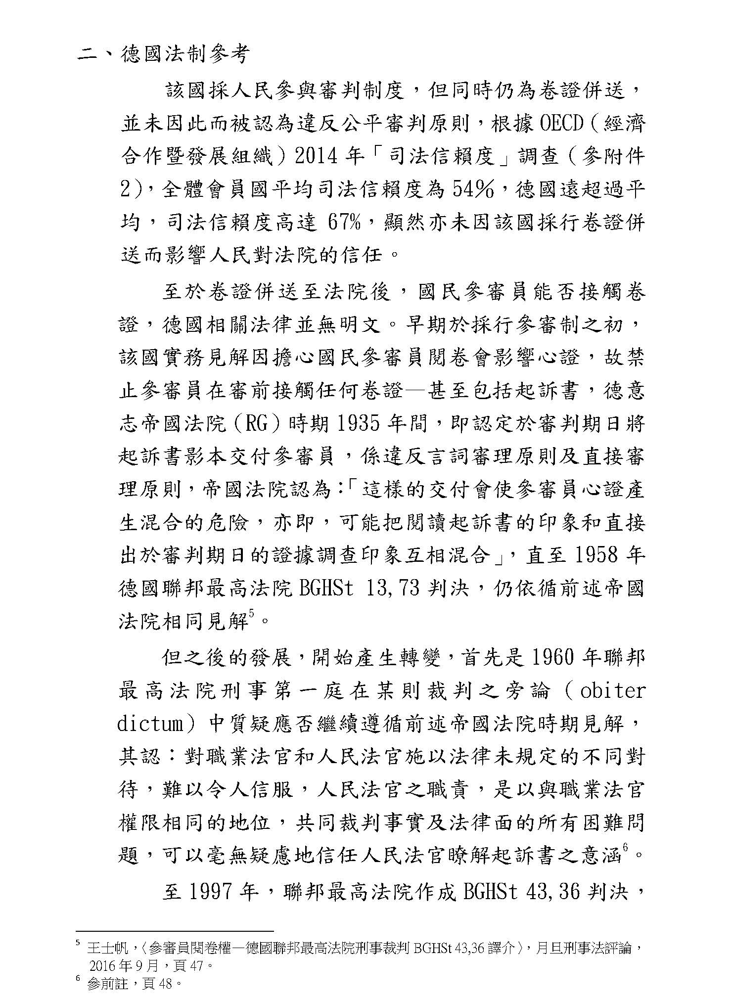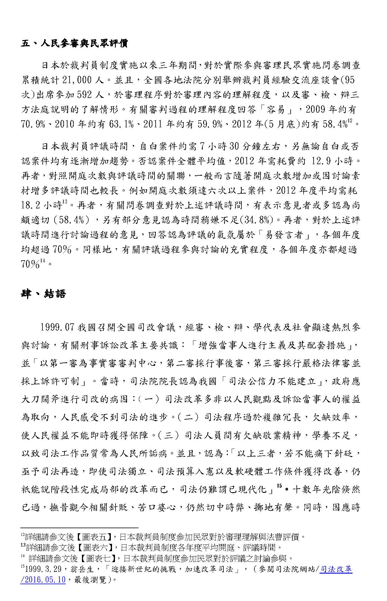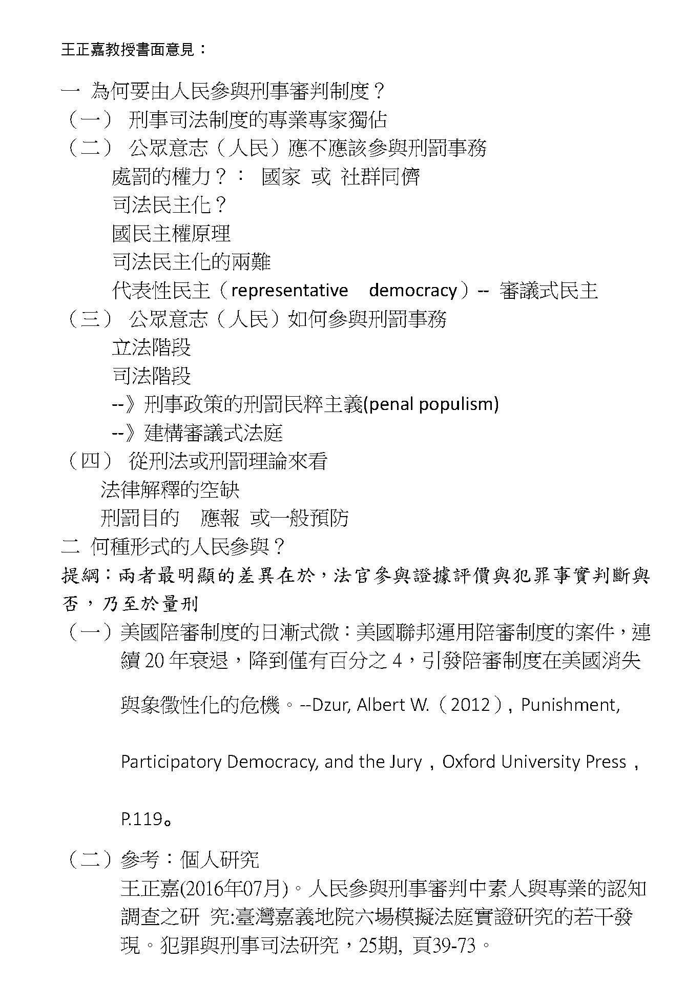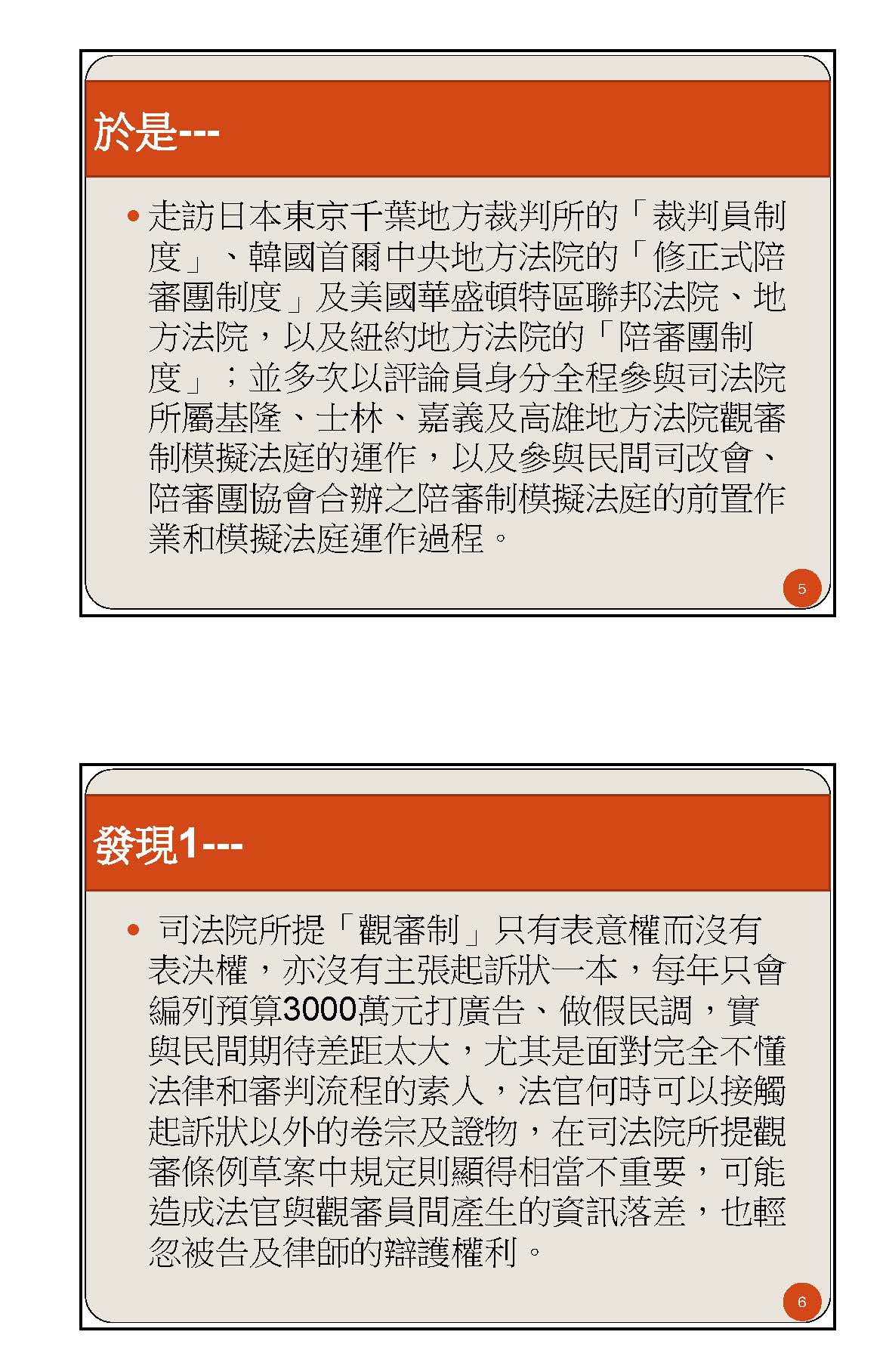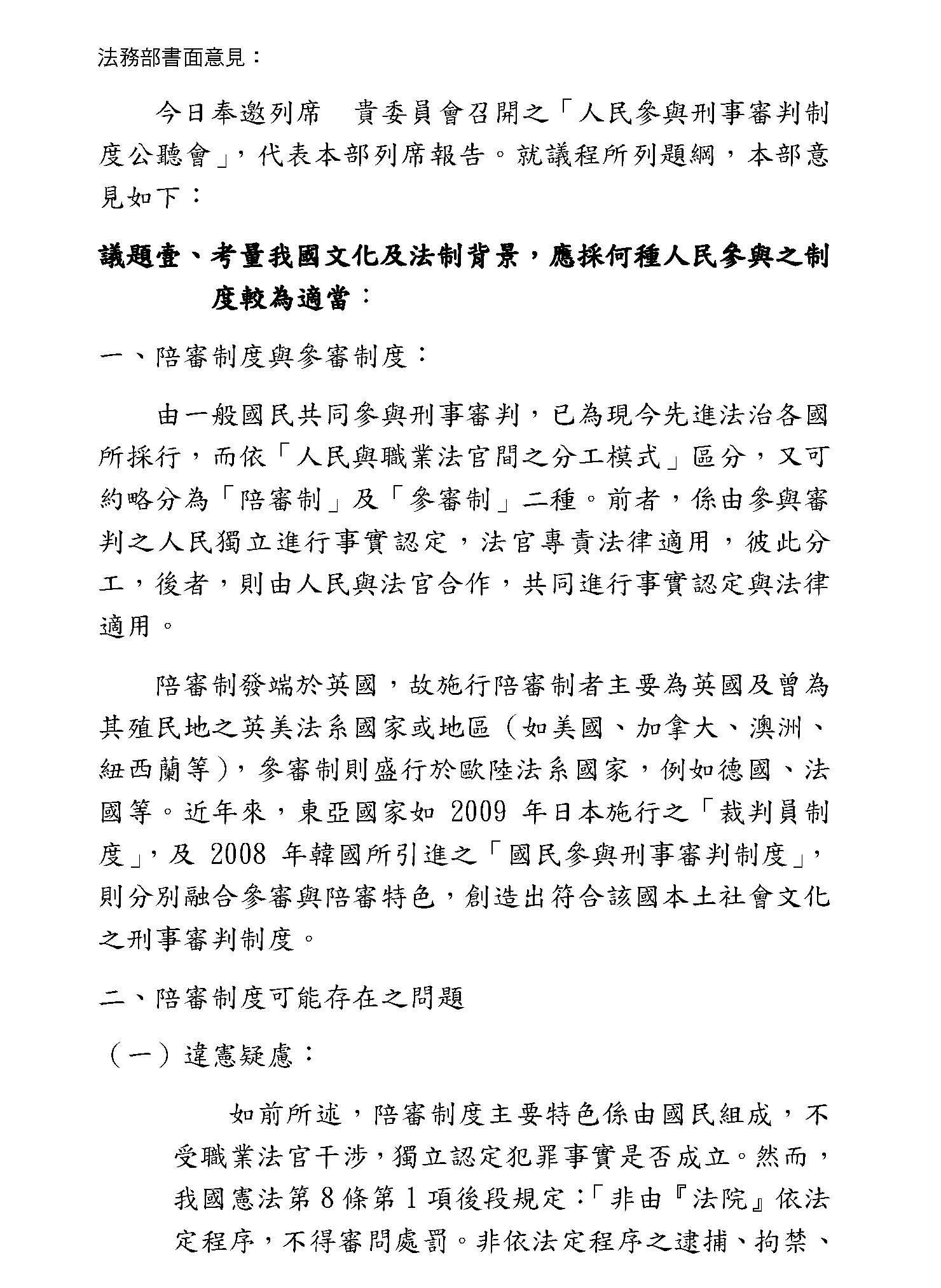 在第一部分我要回應司法院幾點,第一個,司法院提出很多的實證經驗固然很可貴,不過這些都是以觀審制為前提,當然這個是之前的政策,不是幕僚的問題,但是所有的實證資料只能支撐觀審制,包括人民的支持,你沒有用陪審制去做訪問,你怎麼知道不會?你沒有用參審制去做調查,你怎麼知道人民的支持度不會更高?所以這些實證資料的說明程度我覺得是不足的。