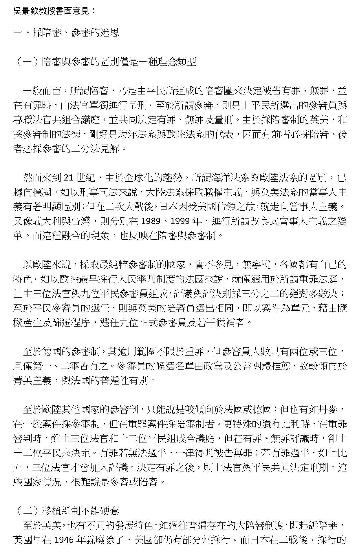 吳景欽教授:主席、各位委員。我和林裕順教授、高榮志律師的想法一樣,每次看到這個提綱就覺得非常厭煩,為什麼已經討論了這麼多年還在討論同樣的問題?還在討論人民參與審判制到底是不是違憲?所以感到很厭煩,不過很厭煩的同時還是要講一下,因為畢竟都來了,我只是要提出問題。